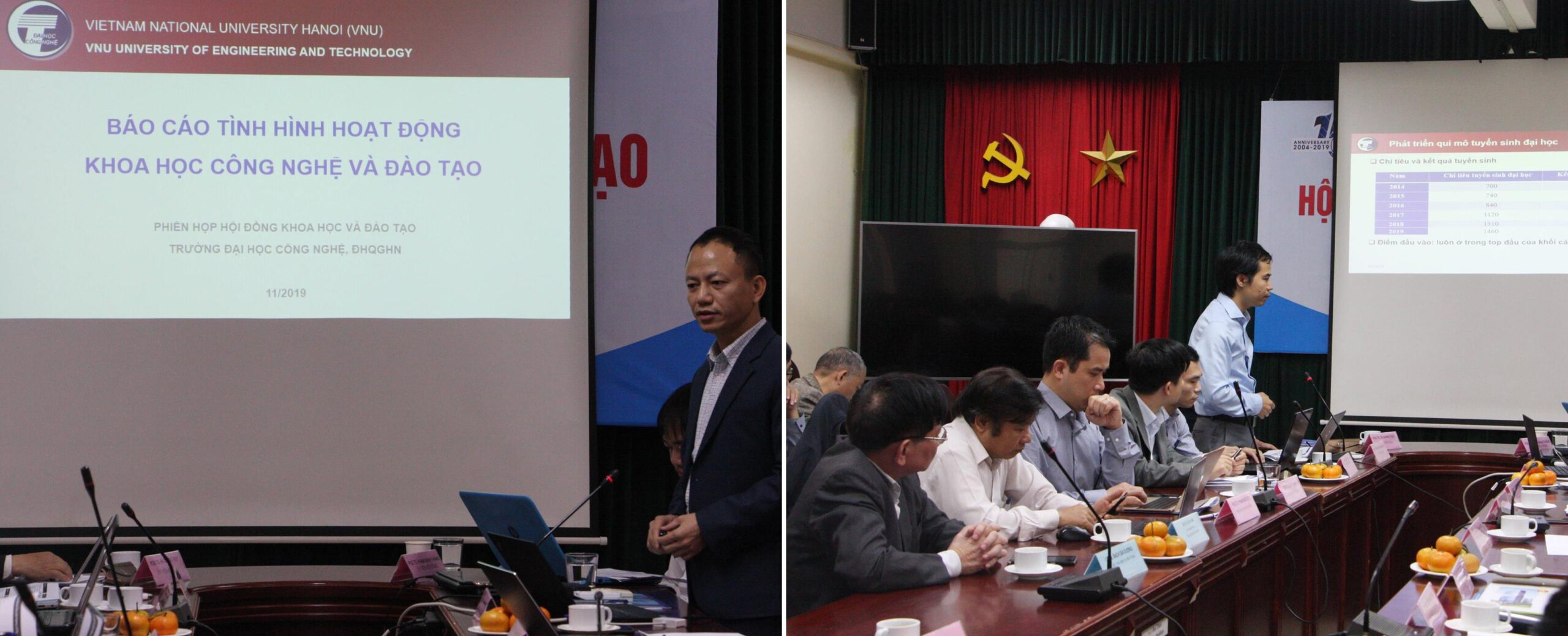 Tại hội nghị các đại biểu đã lần lượt lắng nghe PGS.TS. Trần Xuân Tú – Trưởng phòng KHCN&HTPT và PGS.TS. Nguyễn Phương Thái – Trưởng phòng Đào tạo trình bày báo cáo tổng kết hoạt động khoa học công nghệ và công tác đào tạo của nhà trường giai đoạn 2014-2019. Về khoa học công nghệ, PGS.TS. Trần Xuân Tú đã tóm tắt những chiếnlược, nội dung hoạtđộngtriểnkhaivàthành tích nổi bật trong năm qua cùng các chínhsách, quy định mới ban hànhvề đầu tư phát triển và khuyến khích hoạt động khoa học công nghệ trong Nhà trường. Giai đoạn 2014-2019, Trường đã phát triển các tổ chức khoa học công nghệ phong phú, đa dạng, phát huy tính chủ động, hiệu quả trong hoạt động, gồm Viện tiên tiến về kỹ thuật và công nghệ, 02 trung tâm nghiên cứu, 02 phòng thí nghiệm trọng điểm, 09 phòng thí nghiệm mục tiêu cấp khoa, 31 phòng thí nghiệm/bộ môn chuyên đề, 03 nhóm nghiên cứu mạnh cấp ĐHQGHN… Nhà trường xây dựng nhiều chính sách hỗ trợ, khuyến khích hoạt động khoa học công nghệ như hỗ trợ phát triển phòng thí nghiệm mục tiêu, nhóm nghiên cứu mạnh, nhóm nghiên cứu tiềm năng; kinh phí công bố công trình khoa học trên tạp chí quốc tế và hội nghị quốc tế uy tín; hoạt động sở hữu trí tuệ… Số lượng công trình khoa học công bố từ năm 2016 là 190 bài tăng lên 262 bài vào năm 2018. Nhiều cán bộ, sinh viên đạt giải thưởng khoa học công nghệ có tầm ảnh hưởng cao như giải thưởng Nhân tài Đất Việt (năm 2015, 2017, 2018); Giải thưởng Nhà nước (GS.TS. Nguyễn Hữu Đức và nhóm nghiên cứu), Giải thưởng Khoa học công nghệ ĐHQGHN, Giải thưởng khoa học công nghệ dành cho sinh viên (cấp Bộ GD&ĐT, cấp ĐHQGHN, quốc tế…). Về hợp tác phát triển, Nhà trường phát huy hiệu quả hợp tác Trường đại học – Viện nghiên cứu – Doanh nghiệp, cụ thể là Viện Cơ học, Tập đoàn Samsung, Toshiba, Đại học Chiba (Nhật Bản), Đại học Sydney (Úc)…