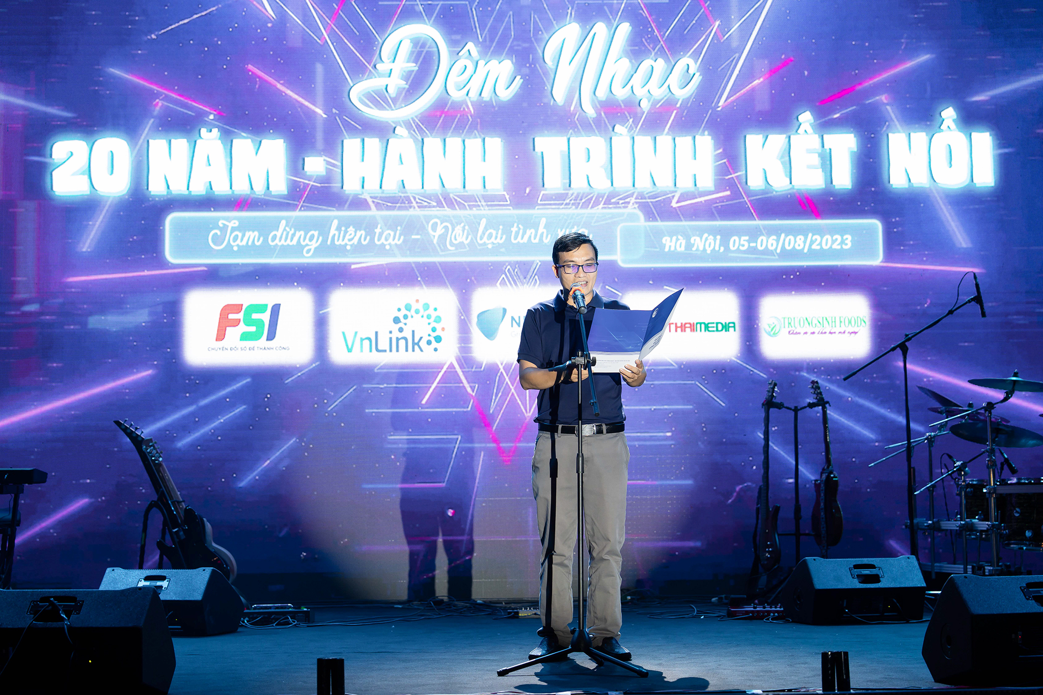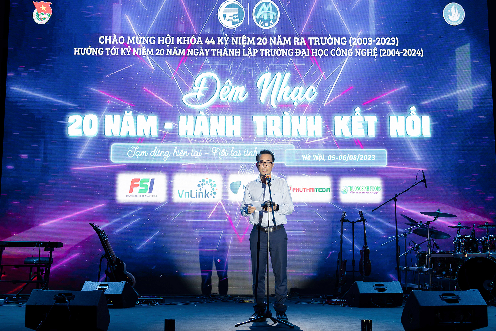 Phát biểu khai mạc chương trình, TS. Phạm Duy Hưng – Trưởng ban Liên lạc cựu sinh viên K44 khẳng định: “Nhạc hội “20 năm – Hành trình kết nối” là hoạt động nằm trong chuỗi các sự kiện Hội khóa K44 kỷ niệm 20 năm ra trường. Hoạt động này lại càng có ý nghĩa hơn khi diễn ra vào thời điểm Trường ĐH Công nghệ chuẩn bị kỷ niệm 20 năm thành lập và 25 năm truyền thống vào năm 2024. Theo thống kê, cựu sinh viên Trường ĐH Công nghệ có khoảng 340 lớp với hơn 19.500 cựu sinh viên. K44 là khóa sinh viên đầu tiên học trọn vẹn 4 năm (1999-2003) của khoa Công nghệ nay là Trường ĐH Công nghệ với 03 ngành đào tạo là Công nghệ thông tin, Điện tử viễn thông và Tin học. Kết nối cựu sinh viên trong đó có cựu sinh viên K44 thành một cộng đồng mạnh để đồng hành cùng nhau, cùng Nhà trường phát triển là việc làm hết sức ý nghĩa và cần thiết. Điều này trở thành mục tiêu trong chuỗi hoạt động Hội khóa K44, với ý nghĩa kết nối những người bạn chung lớp, chung khóa, rồi đến chung trường lại gần nhau và xây dựng một cộng đồng cựu sinh viên liên kết với nhau mạnh hơn để giao lưu, chia sẻ, đồng hành và cộng tác với nhau, với Nhà trường”.