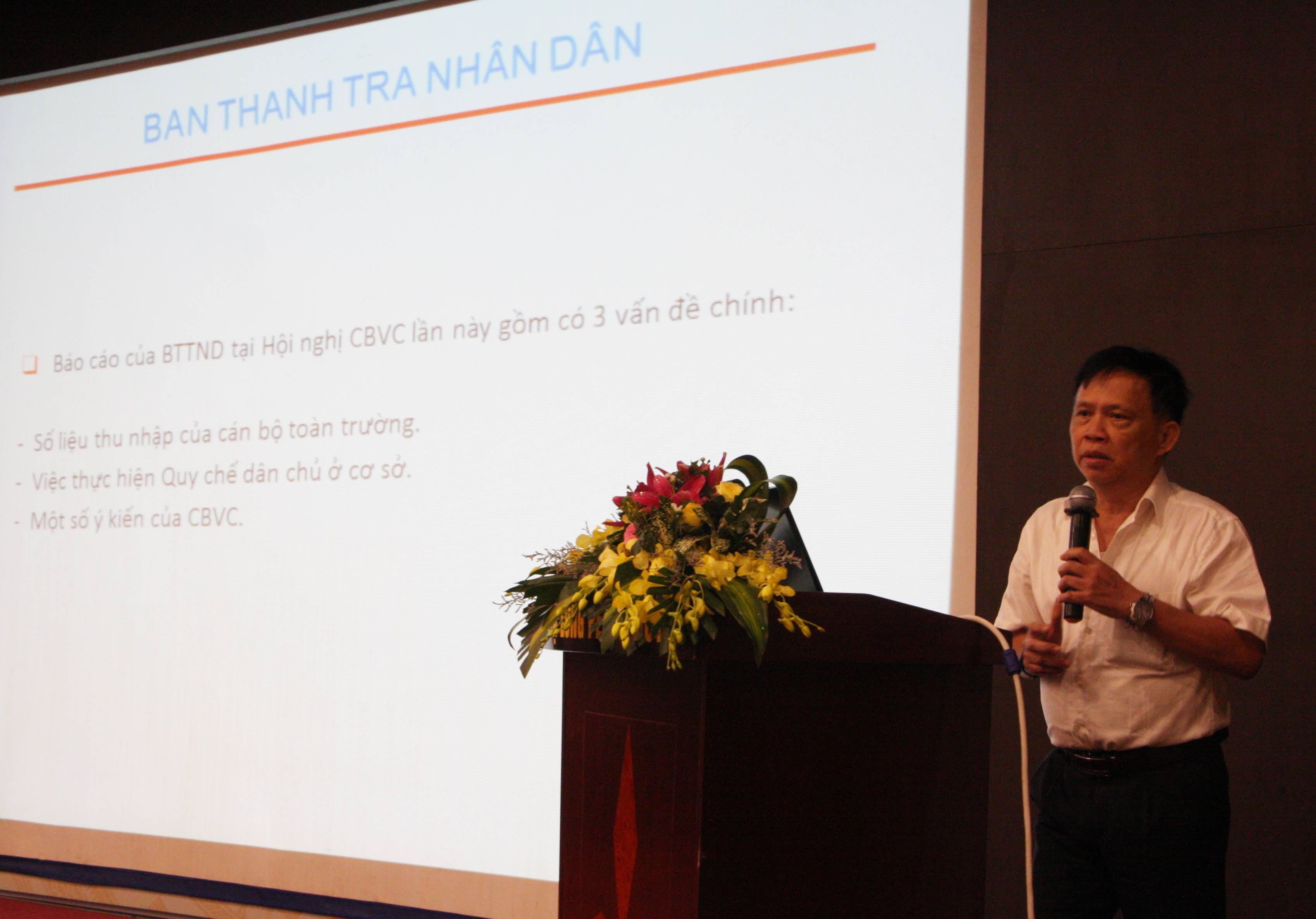 Sau phần báo cáo tổng kết, hội nghị tiếp tục lắng nghe PGS.TS. Nguyễn Quốc Tuấn – Trưởng ban Thanh tra nhân dân trình bày báo cáo của Ban Thanh tra nhân dân. Báo cáo ghi nhận những nỗ lực, cố gắng của tập thể lãnh đạo nhà trường trong thực hiện các giải pháp đảm bảo chất lượng mọi mặt hoạt động của trường; phát triển nguồn thu; gia tăng thu nhập cán bộ, viên chức.