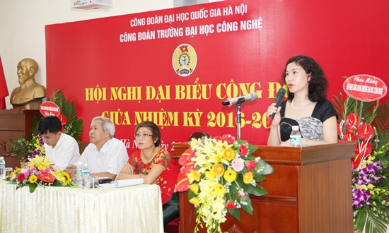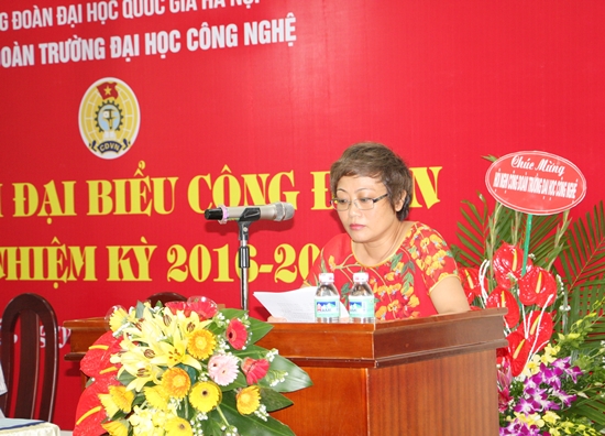 Đại diện công đoàn cấp trên, đồng chí Đoàn Thị Thái cũng có bài phát biểu tại hội nghị. Nhất trí với kết quả nhiệm vụ và phương hướng của Công đoàn Trường Đại học Công nghệ giữa nhiệm kỳ 2016 – 2021. Những kết quả, thành tích của Công đoàn Trường trong năm vừa qua đã được Công đoàn ĐHQGHN công nhận là công đoàn cơ sở vững mạnh và các tổ công đoàn được giấy khen Công đoàn ĐHQGHN. Công đoàn Trường đã làm tốt các công tác chăm lo đời sống vật chất và tinh thần của công đoàn viên, tổ chức bếp ăn, kế hoạch nghỉ hè. Công đoàn ĐHQGHN đánh giá cao hoạt động quyên góp và ủng hộ công đoàn viên ngay tại Công đoàn Trường. Hi vọng hoạt động ý nghĩa này sẽ được phát huy, tỏa sáng hơn nữa. Thời gian tới, Công đoàn ĐHQGHN sẽ nhân rộng hoạt động này trong các công đoàn cơ sở của ĐHQGHN. Tuy nhiên, trong thời gian tới Công đoàn Trường cần lưu ý một số công tác, cụ thể công tác chăm lo đời sống, động viên tinh thần và vật chất công đoàn viên ngày càng phong phú, đa dạngtạo động lực để công đoàn viên phát huy công tác nghiên cứu khoa học, đổi mới phương pháp giảng dạy; Cần mở rộng, phát huy hơn nữa công tác đối ngoại, giao lưu với công đoàn ngoài ĐHQGHN; Tăng cường quan tâm đến công tác đào tạo, bồi dưỡng, tập huấn nghiệp vụ chuyên môn cho cán bộ công đoàn; Phối hợp chặt chẽ với chính quyền để có sự rà soát, điều chỉnh kịp thời trong quy trình thực hiện ký hợp đồng đối với người lao động theo đúng quy định Nhà nước đảm bảo quyền lợi của người lao động.