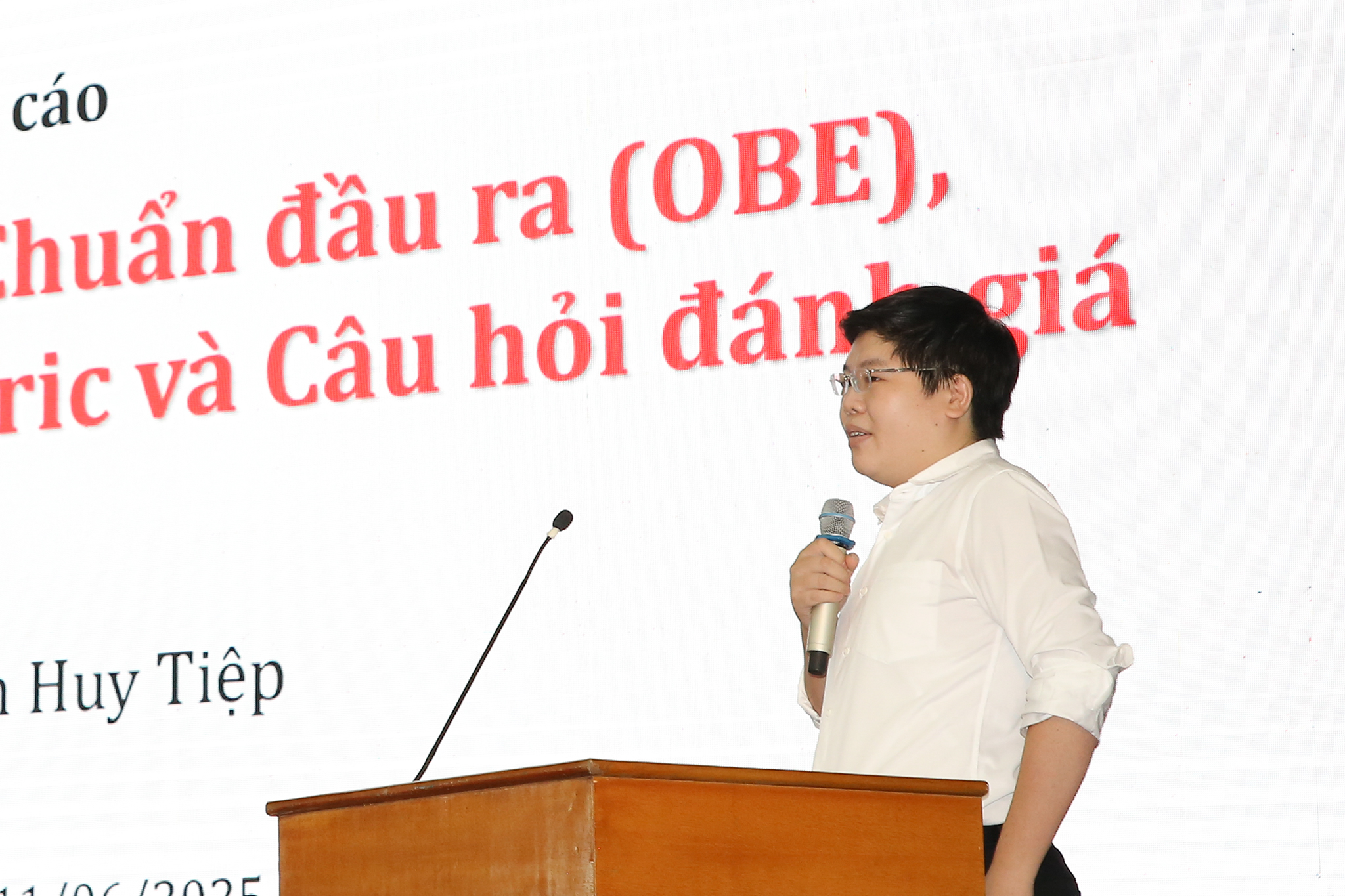 TS. Nguyễn Huy Tiệp – giảng viên Khoa Vật lý kỹ thuật & Công Nghệ Nano trình bày báo cáo “Giáo dục dựa trên Chuẩn đầu ra (OBE), kết nối đề cương, rubic và câu hỏi đánh giá”