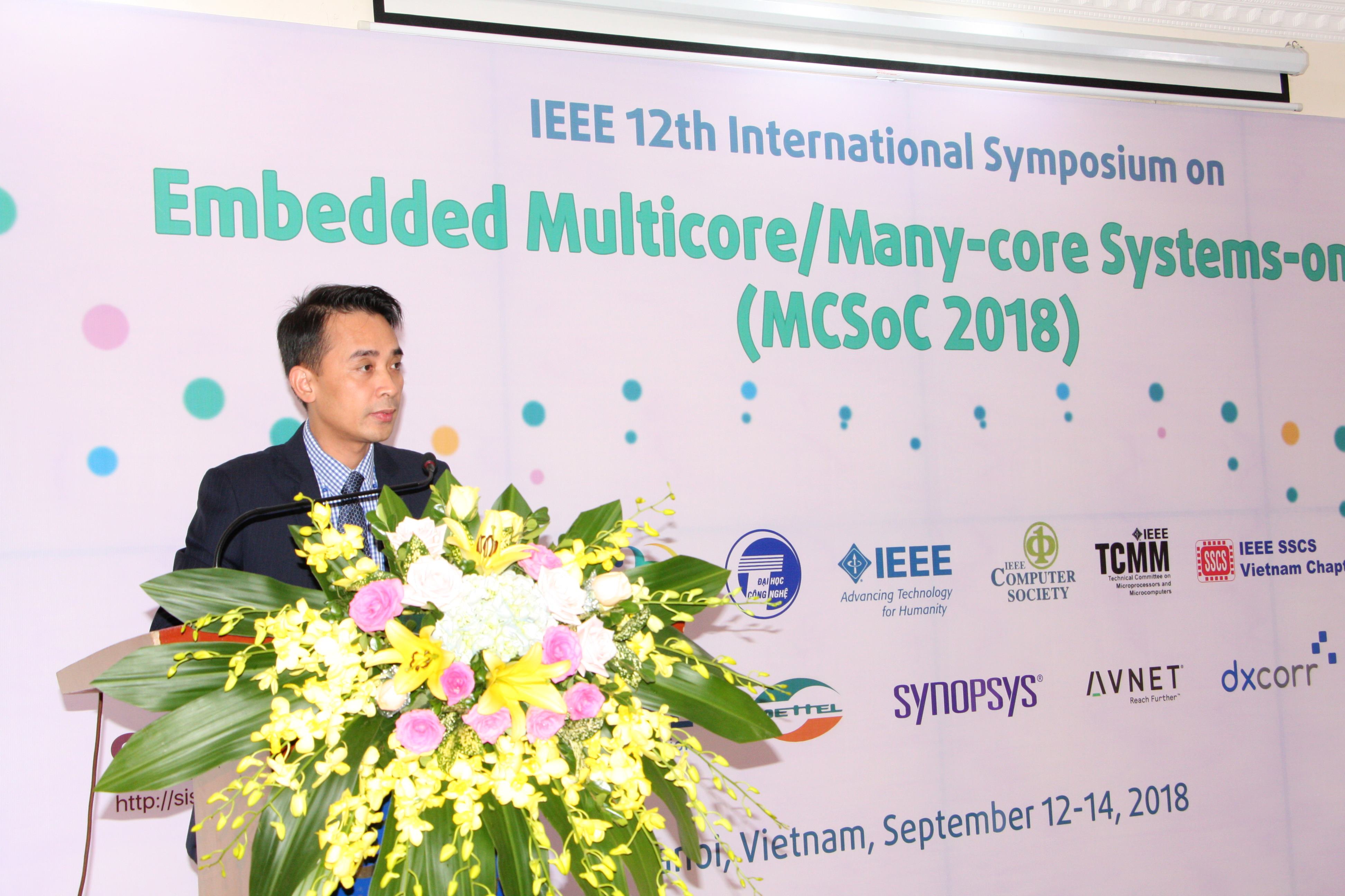 Phát biểu khai mạc, PGS.TS. Trần Xuân Tú, Chủ tịch Hội nghị cho biết: Hội nghị MCSoC được tổ chức lần đầu tiên tại Nhật Bản (2004) và được duy trì hằng năm tại các nước tiên tiến với mục tiêu tạo ra cơ hội cho các nhà khoa học với giới công nghiệp gặp gỡ và thảo luận về các vấn đề nghiên cứu hiện đại trong lĩnh vực điện tử, công nghệ thông tin, truyền thông, trí tuệ nhân tạo, thiết kế vi mạch, Internet-of-Things (IoT); chia sẻ và trao đổi các kết quả đạt được trong nghiên cứu và phát triển; gây dựng các mối quan hệ quốc trong nghiên cứu giữa trường đại học và khối công nghiệp. So với các lần tổ chức trước đây, MCSoC2018 năm nay có thêm ba phiên thảo luận về trí tuệ nhân tạo, một trong những lĩnh vực then chốt trong Cuộc cách mạng công nghiệp lần thứ 4. Cụ thể, một phiên dành cho truyền thông đa phương tiện thông minh; một phiên dành cho các thuật toán và kiến trúc đào tạo, học máy trên chip; một phiên dành cho hệ thống tính toán mô phỏng não (neuromorphic computing) nhúng.