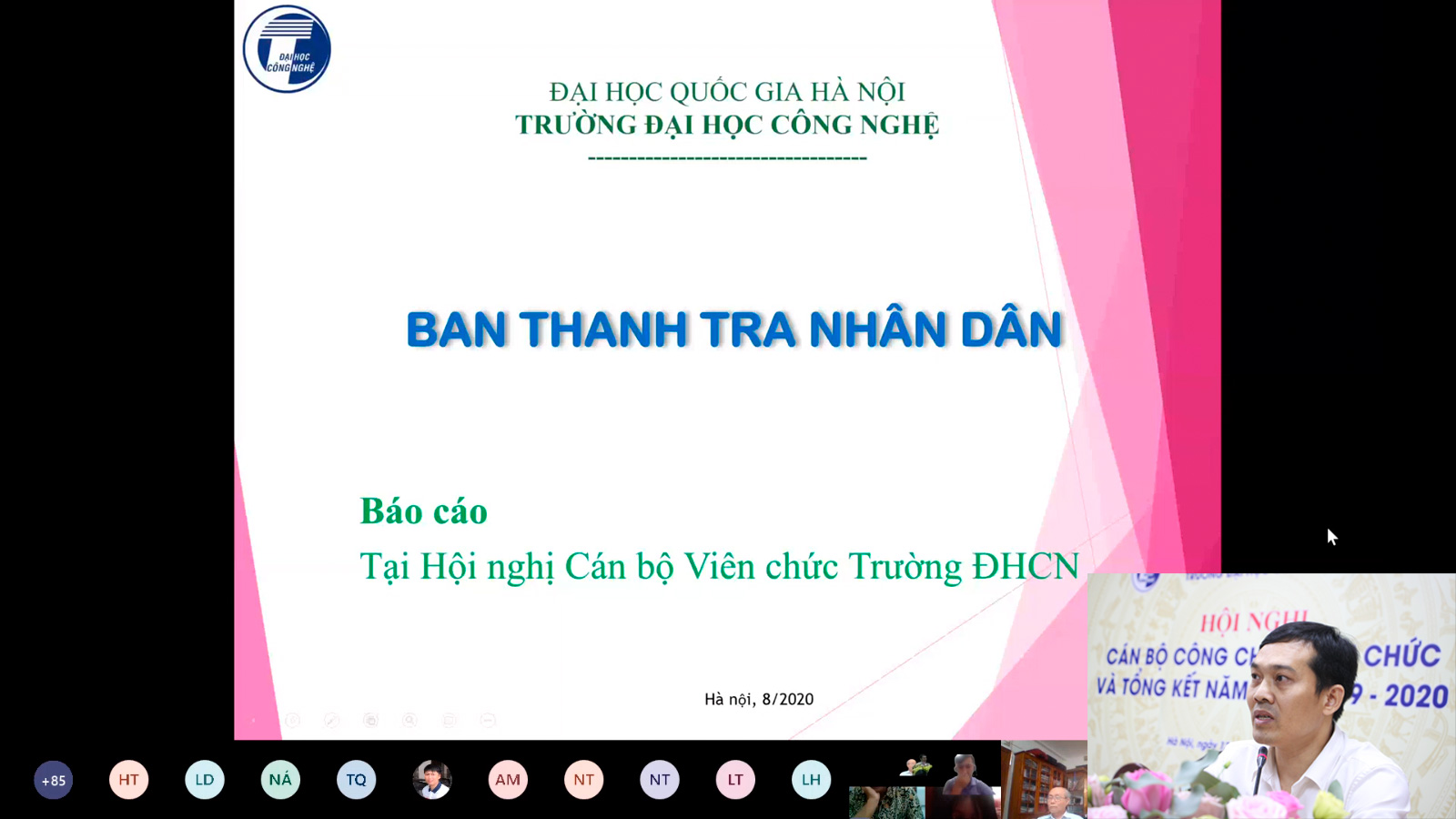 Ngày 13/08/2020, Trường Đại học Công nghệ (ĐHCN), Đại học Quốc gia Hà Nội (ĐHQGHN) đã long trọng tổ chức Hội nghị công chức, viên chức và tổng kết năm học 2019-2020 theo hình thức trực tuyến nhằm đánh giá kết quả hoạt động năm học 2019-2020 và đề ra kế hoạch, nhiệm vụ trọng tâm năm học 2020-2021. Bí thư Đảng ủy, Hiệu trưởng PGS.TS. Nguyễn Việt Hà, Phó Hiệu trưởng TS. Nguyễn Anh Thái và Chủ tịch Công đoàn PGS.TS. Trịnh Anh Vũ đồng chủ trì Hội nghị.