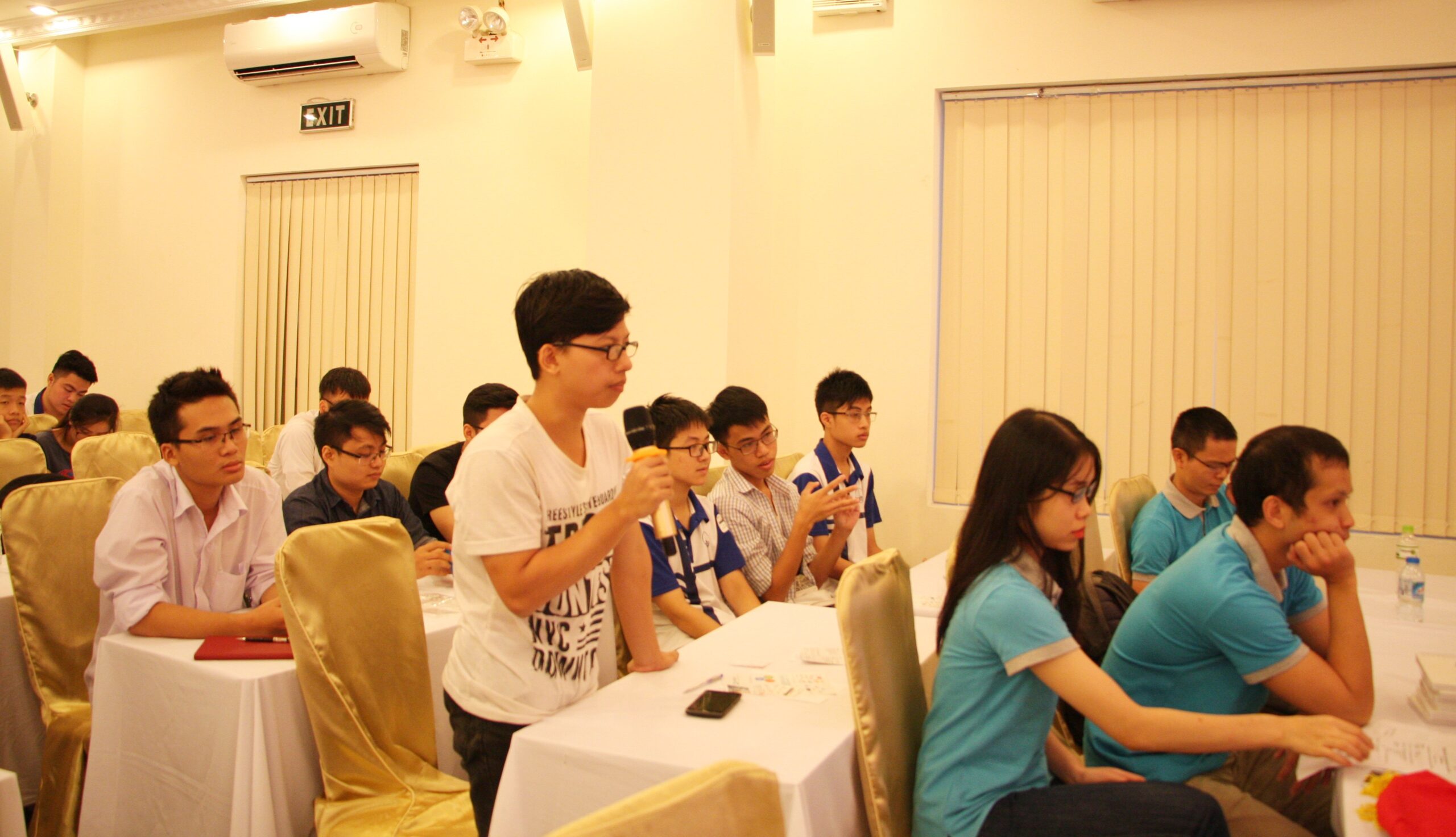 Phần giao lưu và thảo luận với anh Nguyễn Văn Thái (cựu sinh viên K47 Trường ĐHCN) được sinh viên hào hứng đón nhận với nhiều thắc mắc liên quan cơ hội phát triển cá nhân, môi trường làm việc, chế độ và chính sách đãi ngộ. Nhớ lại thời gian đầu vào SVTech anh Nguyễn Văn Thái chia sẻ, ban đầu với mức lương thử việc rất ít ỏi không đủ chi trả cho cuộc sống sinh hoạt, nhưng sau 1-2 năm tham gia dự án và được công ty cử đi học thì bản thân đã có những tiến bộ. Từ đó, chế độ đãi ngộ về mức lương và thưởng cũng tăng lên, đến nay tôi cảm thấy rất hài lòng với công việc.Vì thế, các bạn sinh viên mới ra trường nên tìm một công ty thực sự phù hợp và có môi trường làm việc tốt cho bản thân để phát triển đam mê.