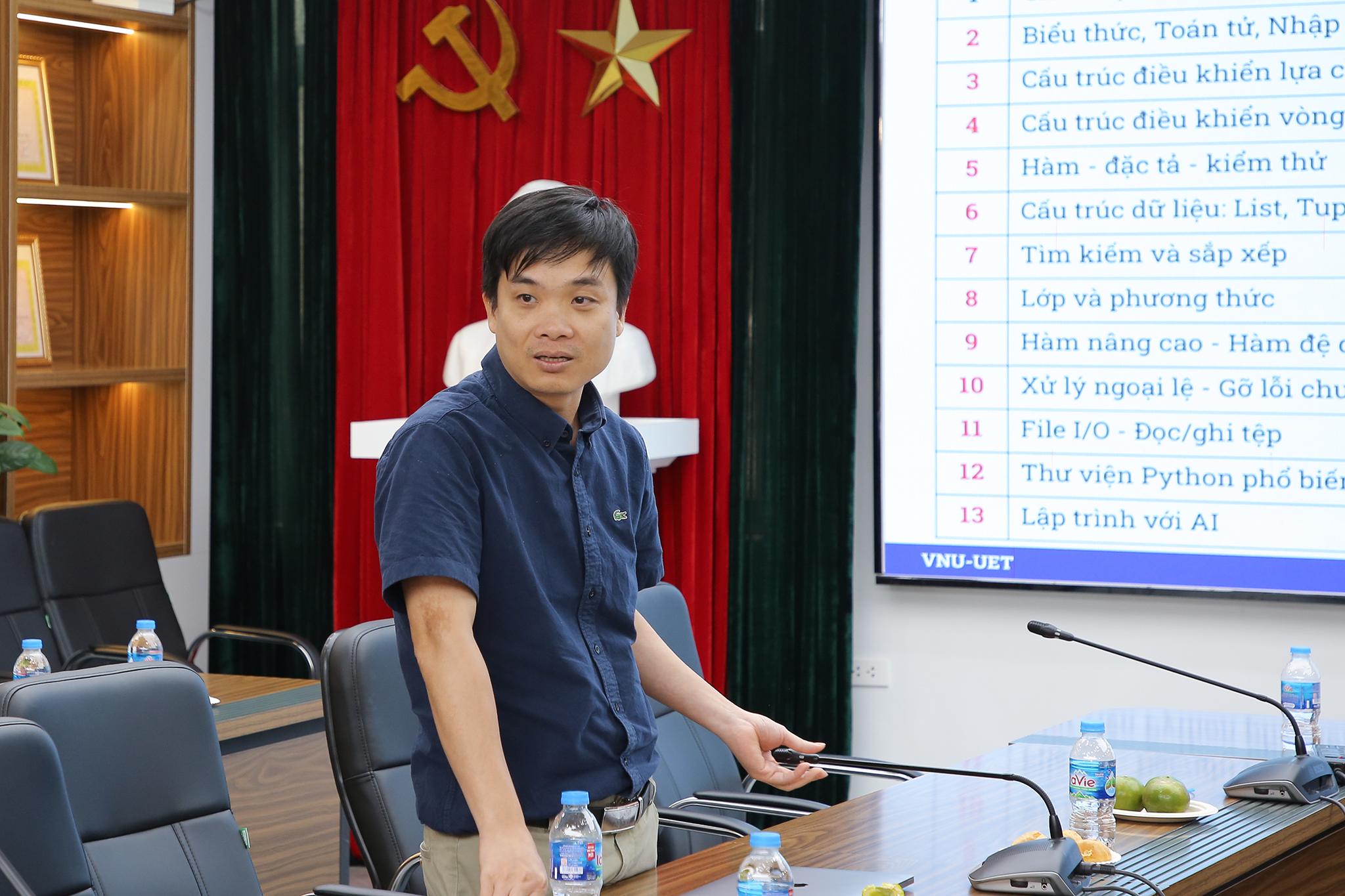 Đại diện tổ công tác, TS. Lê Đức Trọng – giảng viên Khoa Công nghệ thông tin trình bày báo cáo “Học phần Tư duy tính toán (Computational Thinking), tập trung các nội dung về học phần Nhập môn Lập trình, cơ sở xây dựng và đề cương học phần Tư duy tính toán với chuẩn đầu ra, nội dung giảng dạy và kiểm tra đánh giá. Học phần được xây dựng tương đương các học phần các trường ĐH Ivy League, top 10 thế giới kết hợp với đặc trưng của ngành công nghệ kỹ thuật và bản sắc riêng của Trường ĐH Công nghệ. Dựa trên cơ sở đó, mục tiêu của học phần về kiến thức giúp sinh viên hiểu rõ bản chất của tư duy tính toán là khả năng phân tích, phân rã và mô hình hóa bài toán theo cách thức máy tính có thể thực hiện được. Từ đó, người học biết cách biểu diễn giải pháp một cách logic thông qua các câu lệnh trong ngôn ngữ lập trình Python. Ngoài ra, sinh viên cũng nắm được nguyên lý máy tính thực thi chương trình, từ mã nguồn đến hành động cụ thể, qua các bước biên dịch, thông dịch và kiểm soát luồng lệnh. Về kỹ năng, sinh viên có khả năng phân tích và giải quyết bài toán theo hướng lập trình, từ việc xác định đầu vào, xử lý đến đầu ra một cách logic và rõ ràng; người học biết viết mã Python để mô tả lời giải một cách chính xác, dễ hiểu, đồng thời kiểm tra, phát hiện và sửa lỗi trong chương trình; sinh viên rèn luyện tư duy có cấu trúc, viết mã tối ưu và dễ bảo trì, đồng thời biết sử dụng công cụ lập trình, môi trường phát triển và tài liệu tiếng Anh để tự học, mở rộng kỹ năng và thích ứng với sự thay đổi của công nghệ.