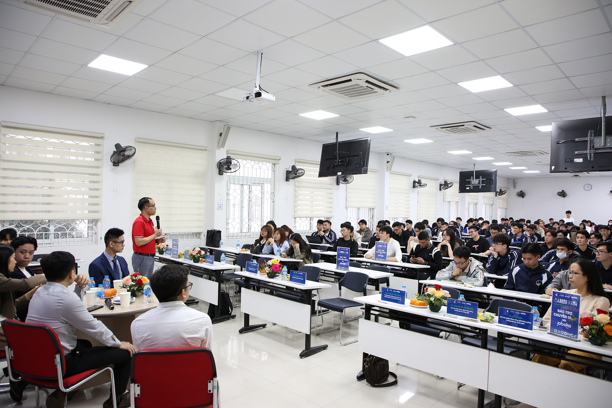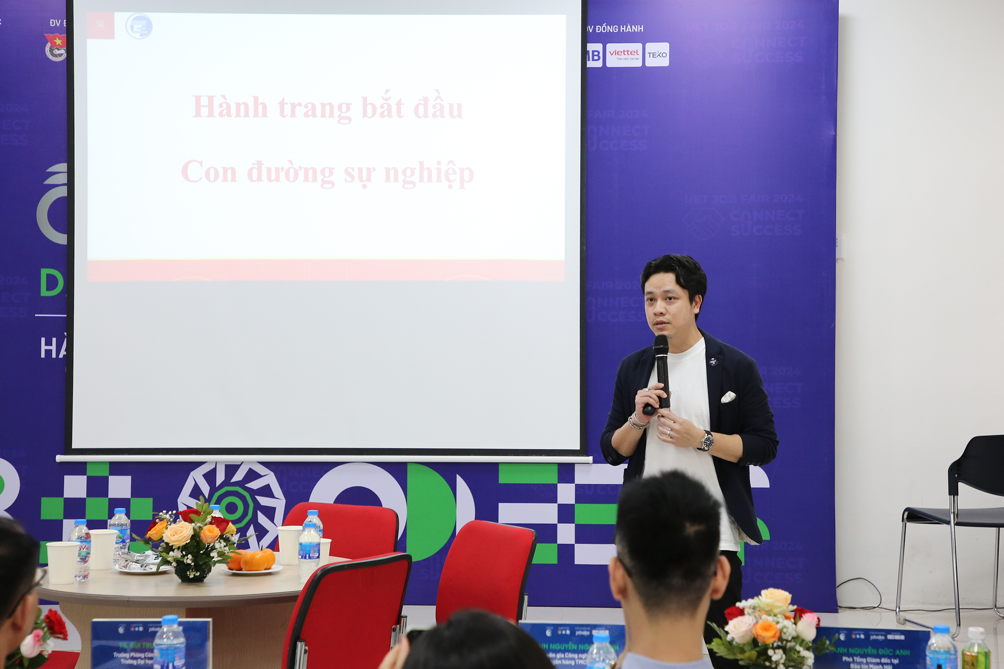 Tham dự hội thảo, về phía Trường ĐH Công nghệ có TS. Bùi Trung Ninh – Trưởng phòng Công tác sinh viên, TS. Trần Cường Hưng – Bí thư Đoàn thanh niên cùng đại diện lãnh đạo các khoa và đơn vị trong trường. Về phía doanh nghiệp có chị Nguyễn Thị Thùy Linh – Quản lý phòng Phát triển đối tác tại nền tảng công nghệ tuyển dụng JobOKO. Sự kiện còn có sự tham dự của các diễn giả gồm anh Nguyễn Ngọc Minh – Chuyên gia Công nghệ thông tin tại Ngân hàng TMCP Quân đội; anh Nguyễn Đức Anh – Phó Tổng Giám đốc tại Bảo tín Mạnh Hải; anh Hoàng Anh Dũng – Trưởng phòng Ứng dụng Phân tích dữ liệu dịch vụ tại Viettel Telecom; chị Phạm Thị Hoài Trang- Talent Acquisition Manager tại TEKO-VNLife Group.