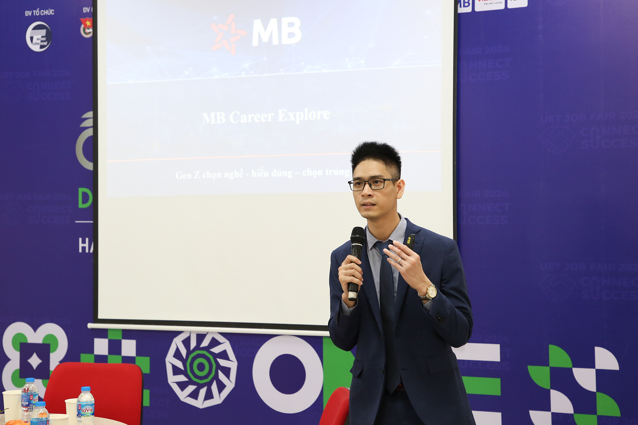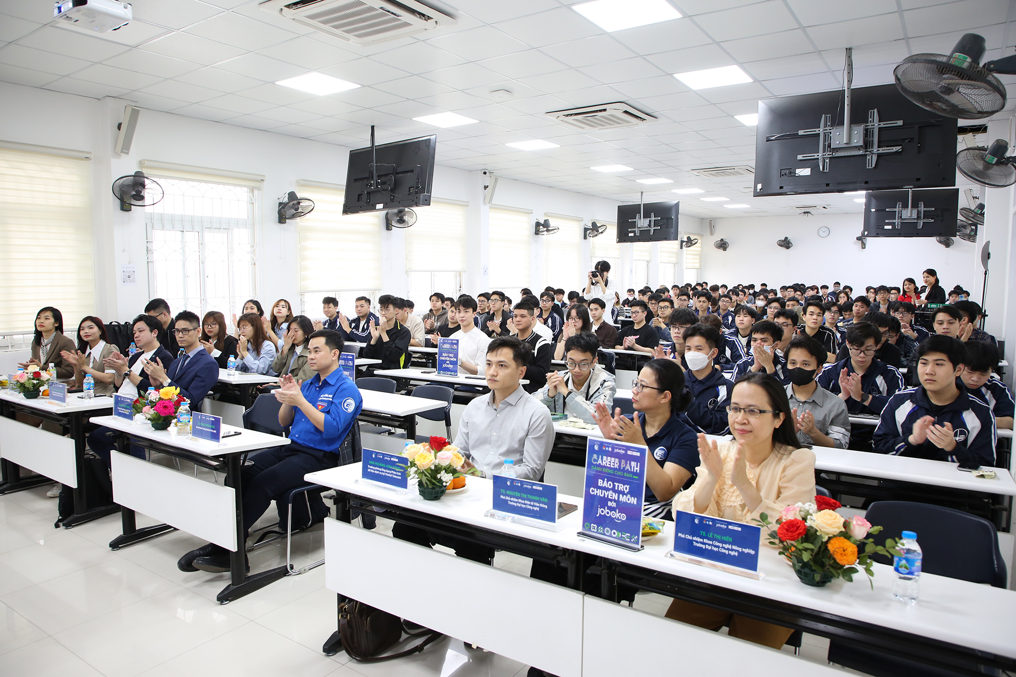 Tại buổi hội thảo, sinh viên đã lắng nghe chia sẻ của các diễn giả đến từ các doanh nghiệp lớn, tập đoàn với kinh nghiệm lâu năm trong lĩnh vực chuyên môn và tuyển dụng. Diễn giả Nguyễn Ngọc Minh – Chuyên gia Công nghệ thông tin tại Ngân hàng TMCP Quân đội đã giới thiệu môi trường làm việc,chia sẻ các cơ hội nghề nghiệp tại MB nói chung và cơ hội việc làm trong lĩnh vực công nghệ nói riêng. Hai diễn giả tiếp theo là anh Nguyễn Đức Anh – Phó Tổng Giám đốc tại Bảo tín Mạnh Hải và anh Hoàng Anh Dũng – Trưởng phòng Ứng dụng Phân tích dữ liệu dịch vụ tại Viettel Telecom đã cung cấp những phương pháp giúp sinh viên xây dựng lộ trình phát triển bản thân và kỹ năng phỏng vấn, hội nhập văn hóa công sở.