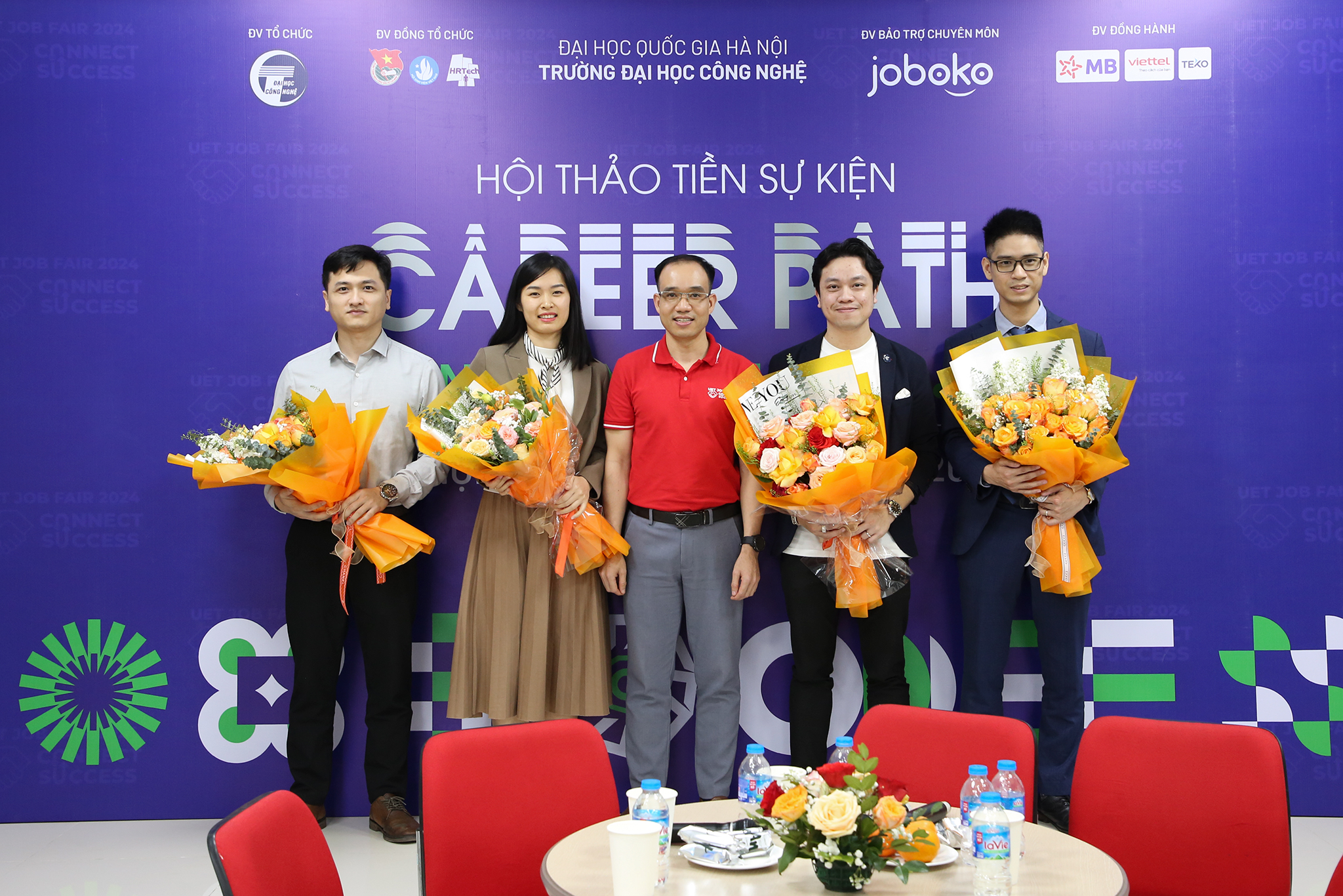 Tham dự hội thảo, về phía Trường ĐH Công nghệ có TS. Bùi Trung Ninh – Trưởng phòng Công tác sinh viên, TS. Trần Cường Hưng – Bí thư Đoàn thanh niên cùng đại diện lãnh đạo các khoa và đơn vị trong trường. Về phía doanh nghiệp có chị Nguyễn Thị Thùy Linh – Quản lý phòng Phát triển đối tác tại nền tảng công nghệ tuyển dụng JobOKO. Sự kiện còn có sự tham dự của các diễn giả gồm anh Nguyễn Ngọc Minh – Chuyên gia Công nghệ thông tin tại Ngân hàng TMCP Quân đội; anh Nguyễn Đức Anh – Phó Tổng Giám đốc tại Bảo tín Mạnh Hải; anh Hoàng Anh Dũng – Trưởng phòng Ứng dụng Phân tích dữ liệu dịch vụ tại Viettel Telecom; chị Phạm Thị Hoài Trang- Talent Acquisition Manager tại TEKO-VNLife Group.