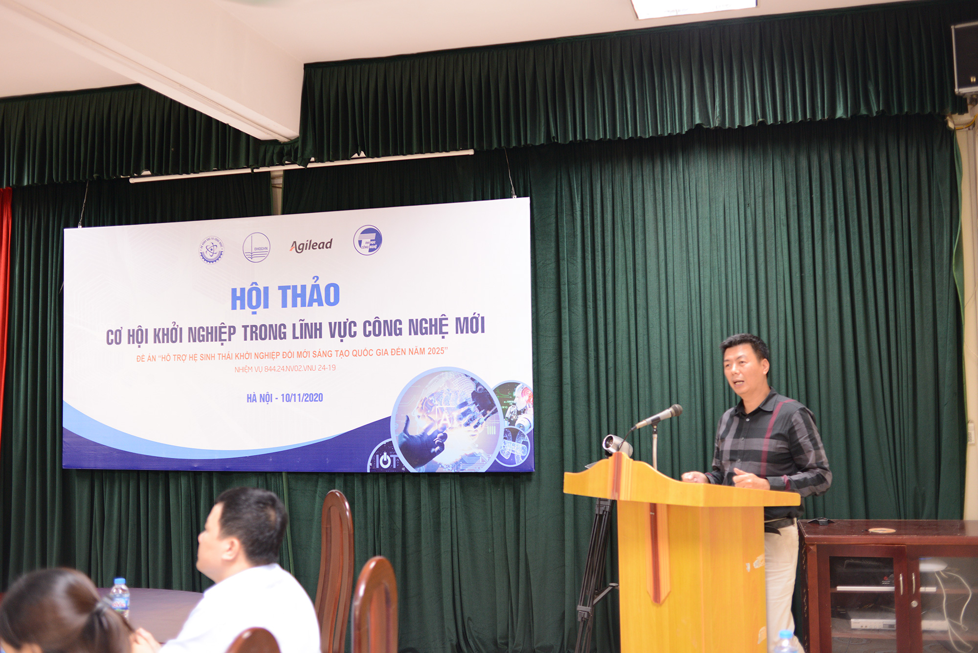 TS. Trần Quốc Long – Chủ nhiệm Bộ môn Khoa học máy tính, khoa Công nghệ thông tin, Trường ĐHCN trình bày tham luận “Nhu cầu và tiềm năng khởi nghiệp trong lĩnh vực công nghệ mới ở Việt Nam”