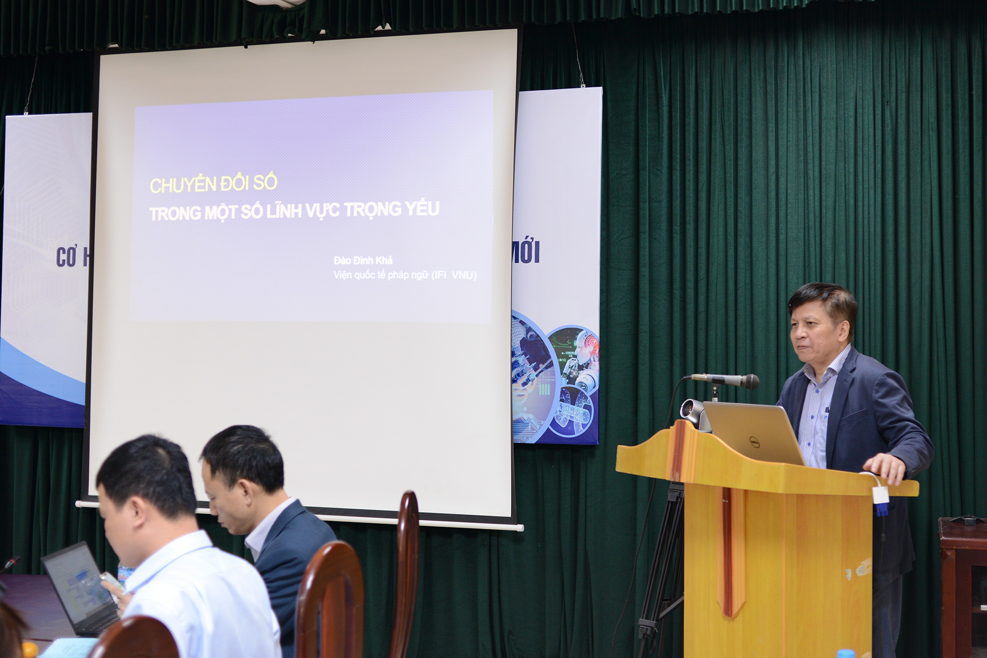 TS. Đào Đình Khả – Nguyên Vụ trưởng Vụ Công nghệ thông tin, Bộ Thông tin và truyền thông trình bày tham luận “Chuyển đổi số trong một số lĩnh vực trọng yếu”