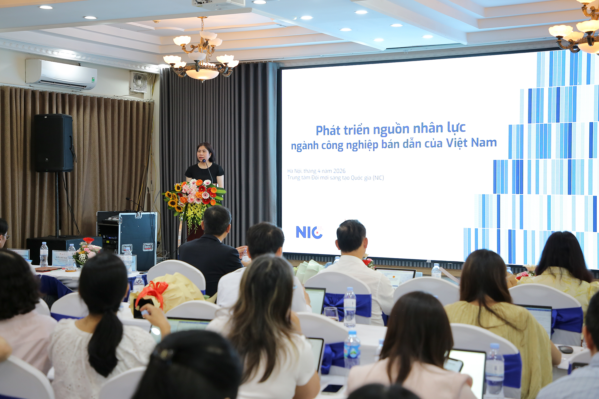 ThS. Tân Anh, Phụ trách Ban Phát triển nguồn nhân lực, Trung tâm Đổi mới sáng tạo Quốc gia, Bộ Tài chính trình bày tham luận “Phát triển nguồn nhân lực ngành công nghiệp bán dẫn của Việt Nam”