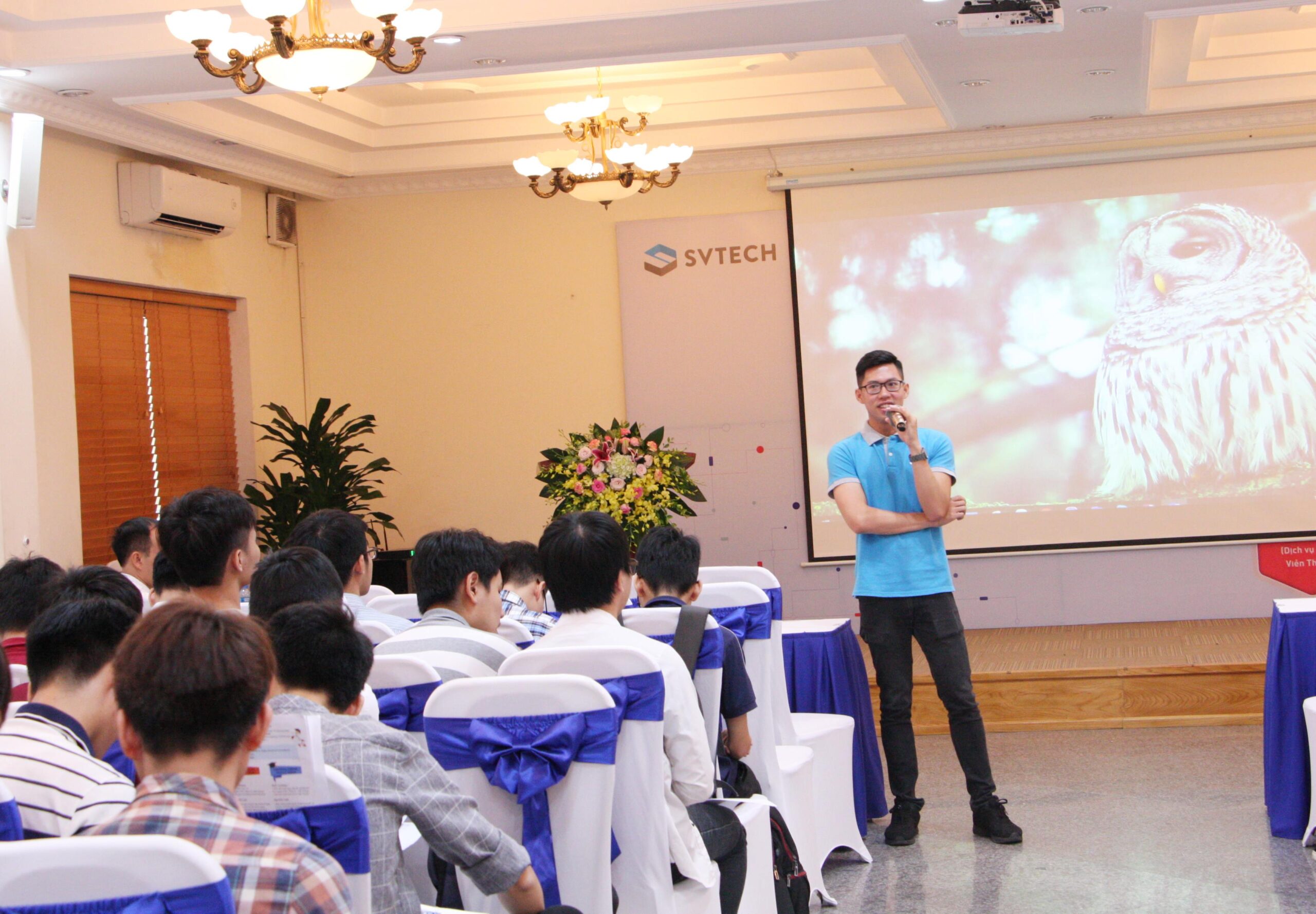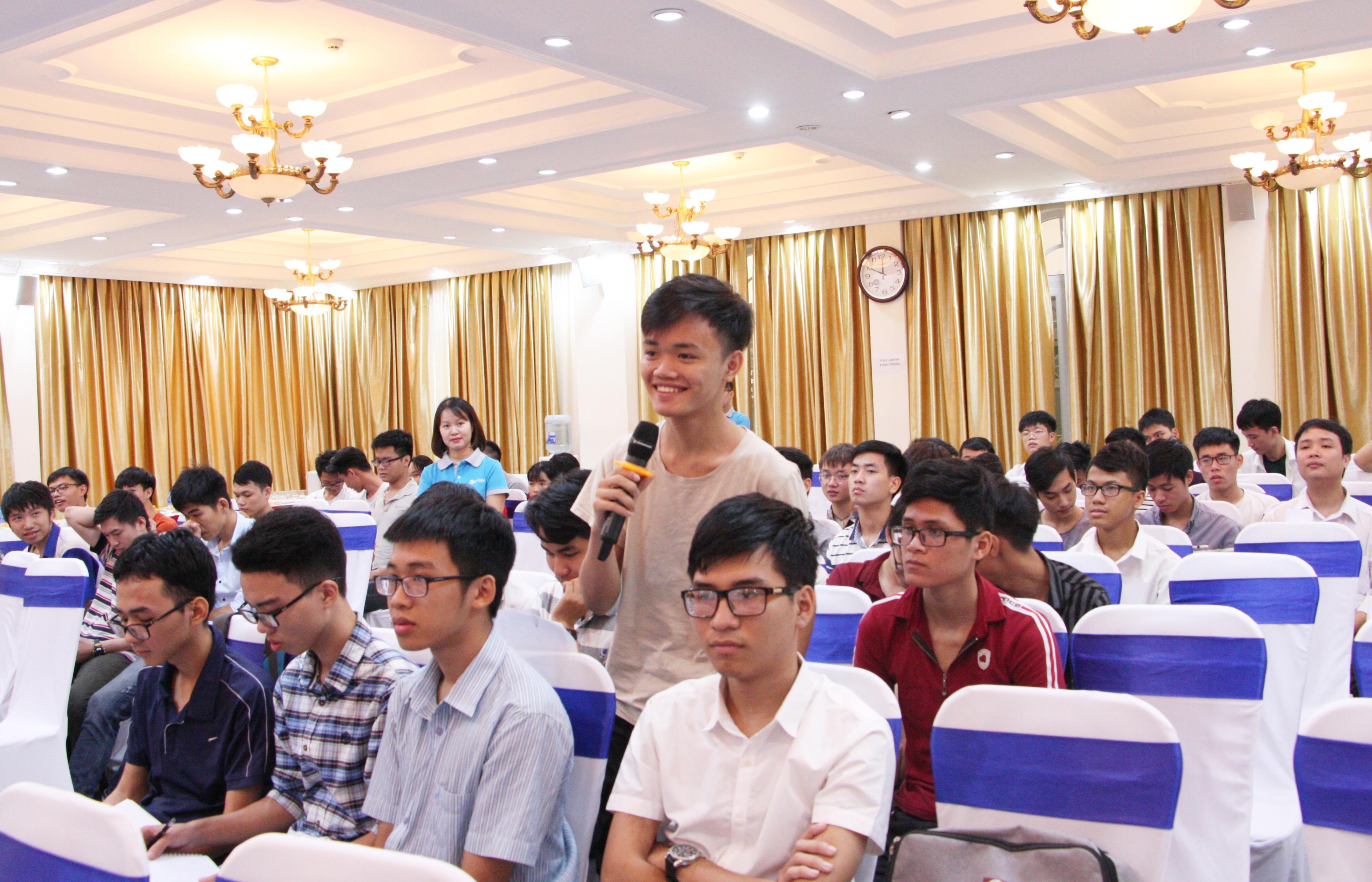 Phần giao lưu và thảo luận với anh Nguyễn Anh Tú (cựu sinh viên K58 Trường ĐHCN) được sinh viên hào hứng đón nhận với nhiều thắc mắc liên quan cơ hội phát triển cá nhân, môi trường làm việc, chế độ và chính sách đãi ngộ.Sau 01 năm quay lại trường với tư cách cựu sinh viên để chia sẻ những kinh nghiệm làm việc tại SVTech từ lúc ra trường đến nay, anh Nguyễn Anh Tú chia sẻ,những ngày đầu làm việc tại công ty, kiến thức về System của bản thân bằng 0.Ba tháng đầu tiên, tôi được các anh/chị trong công ty training nội bộ về kỹ thuật, sau đấy được đưa đi trải nghiệm thực tế. Từ đó, khả năng tay nghề của bản thân đã phát triển rất nhanh. So với 01 năm về trước, tôi đã tự tin hơn hẳn khi bản thân có thể thực hiện triển khai làm một sản phẩm hoàn chỉnh.