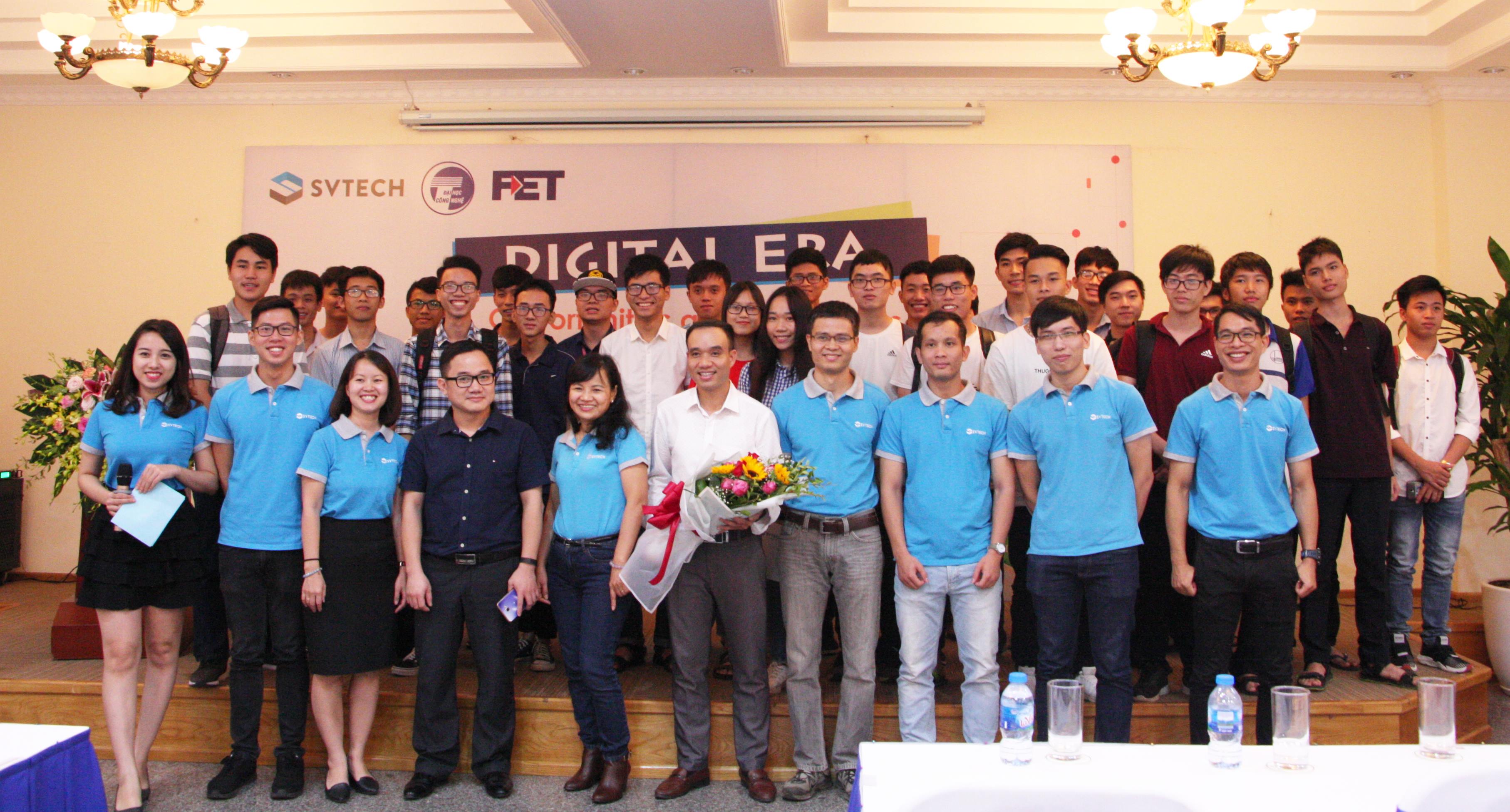Cán bộ, sinh viên trường ĐHCN chụp ảnh lưu niệm cùng các cán bộ công ty SVTech