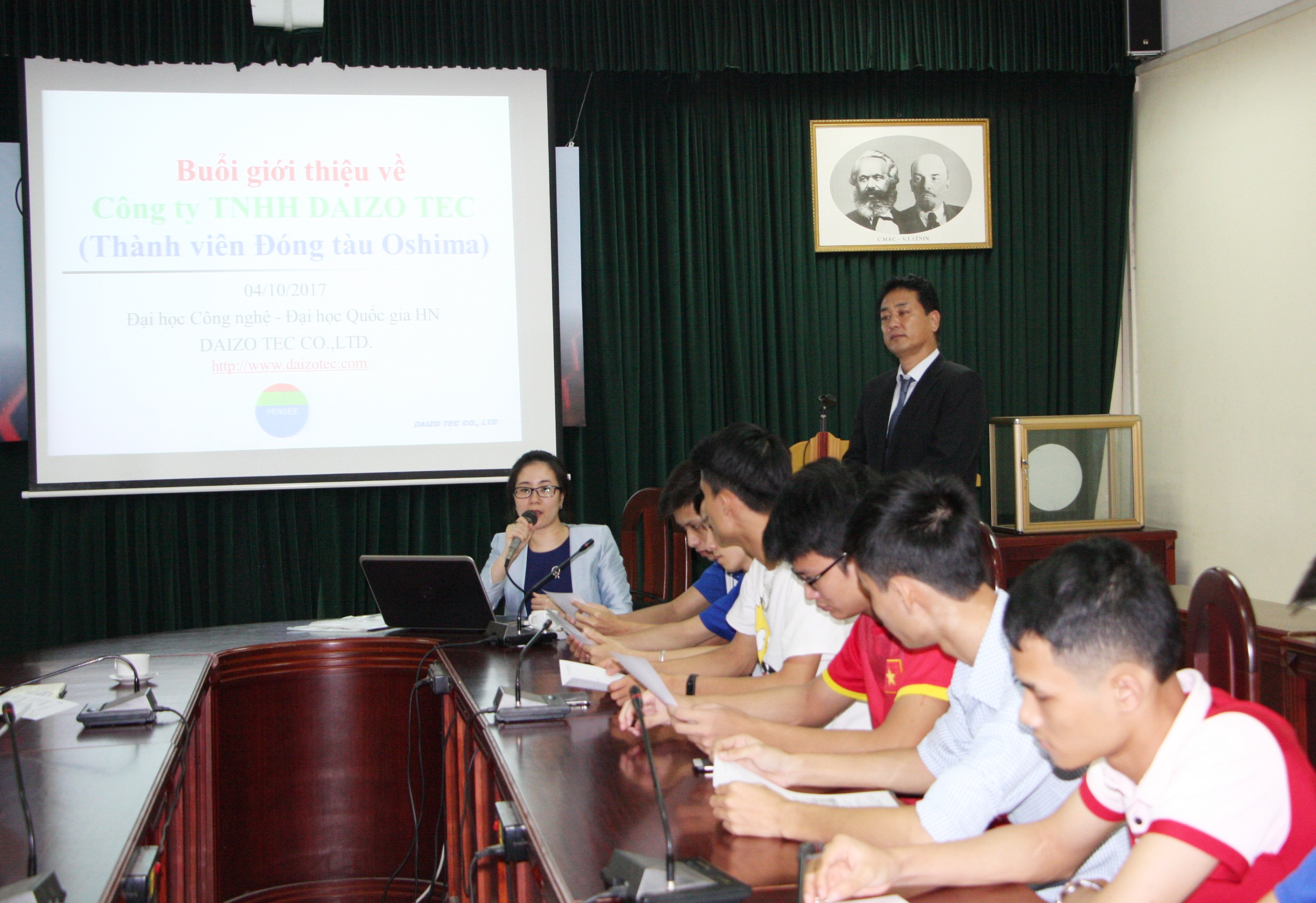 Ngày 04/10, Trường Đại học Công nghệ phối hợp với Công ty TNHH Daizo Tec (thuộc Công ty Cổ phần đóng tàu Oshima)- Nhật Bản tổ chức hội thảo tuyển dụng nhằm tìm kiếm cơ hội đầu ra cho sinh viên tốt nghiệp Khoa Cơ học kỹ thuật và Tự động hóa.