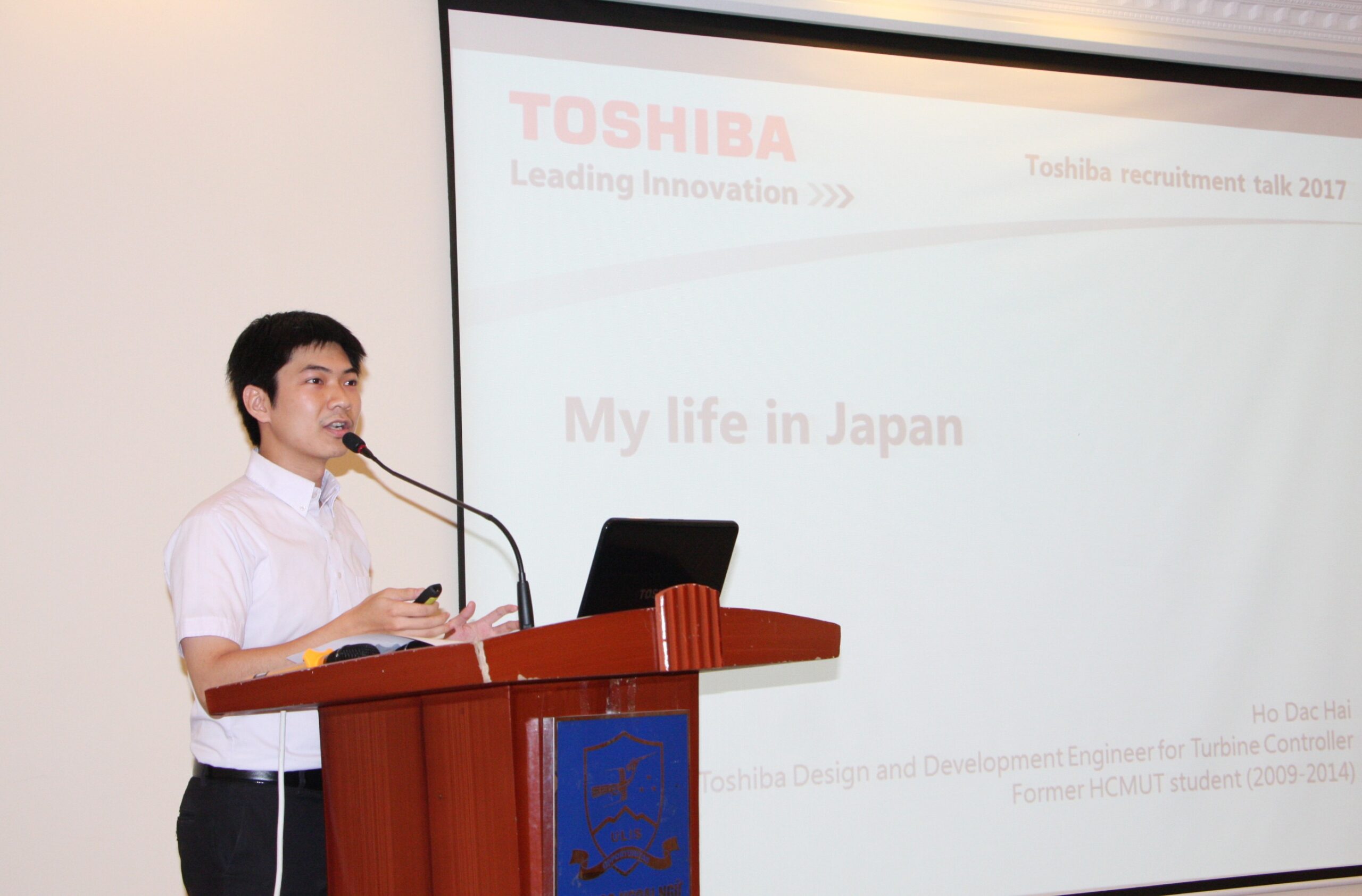 Hội thảo đã thu hút nhiều sinh viên năm cuối các ngành quan tâm tham dự. Tại hội thảo, đại diện Tập đoàn Toshiba – ông Mai Huy đã có bài giới thiệu về tập đoàn Toshiba, các lĩnh vực kinh doanh, các vị trí cần tuyển dụng cho năm 2017. Danh mục các vị trí tuyển dụng, ngành nghề tuyển dụng, thời gian bắt đầu làm việc đối với ứng viên trúng tuyển, những chế độ đãi ngộ cho nhân viên (http://www.toshiba.co.jp/saiyou/international/entrylevel/)… Hằng năm, Toshiba thu hút nhiều ứng viên tại Việt Nam cũng như các nước khu vực Đông Nam Á nộp hồ sơ ứng tuyển. Hiện nay, Tập đoàn Toshiba đang có 20 sinh viên Việt Nam làm việc tại Nhật Bản.