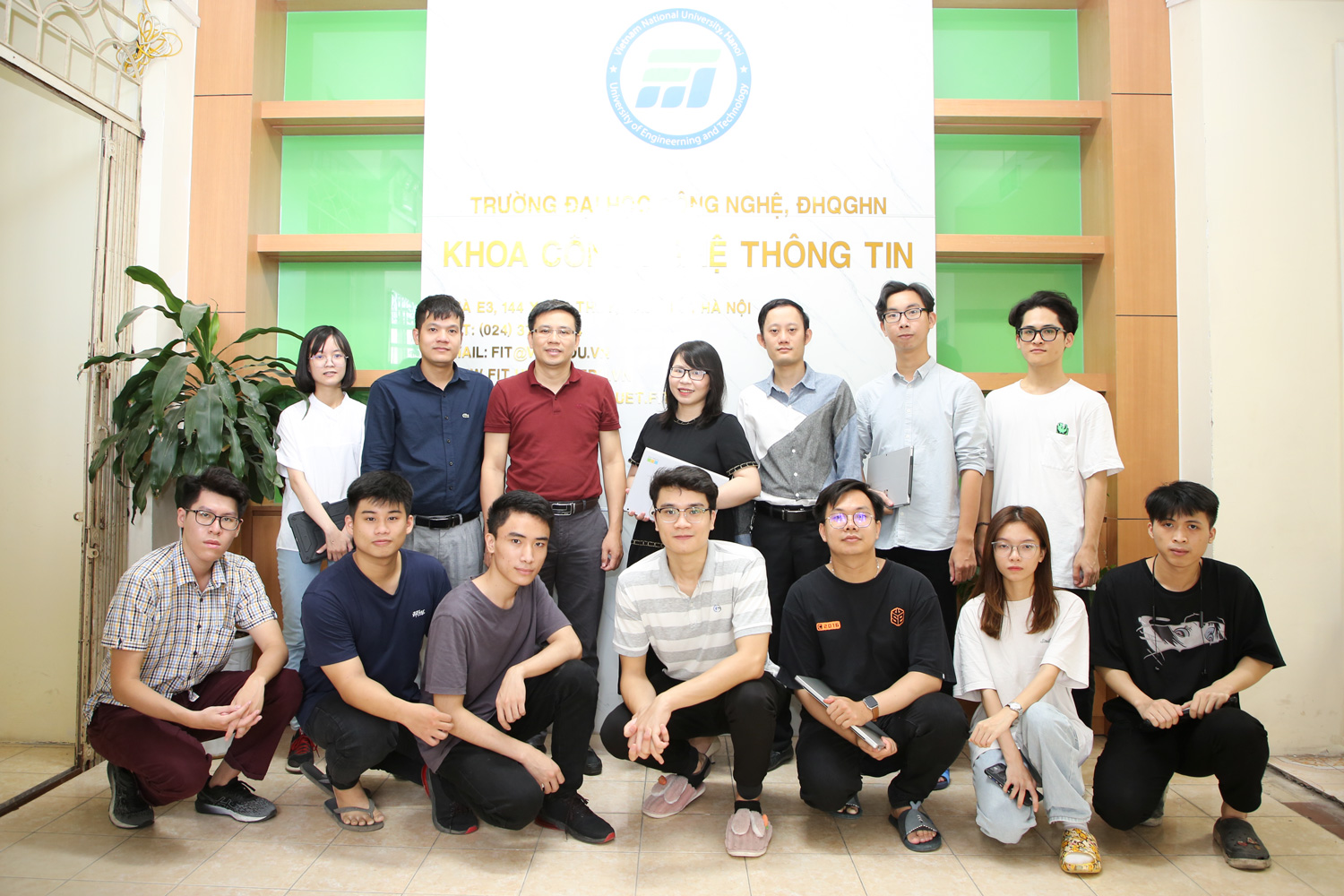 Nhóm nghiên cứu hai dự án “DSMiner – hệ thống phân tích và thấu hiểu khách hàng” và “DSWatcher – hệ thống lắng nghe mạng xã hội” (PGS. TS. Phan Xuân Hiếu (hàng trên, thứ ba từ trái sang), TS. Lê Đức Trọng (hàng trên, thứ hai từ trái sang), TS. Lê Hoàng Quỳnh (hàng trên, thứ tư từ trái sang),TS. Trần Mai Vũ (hàng trên, thứ năm từ trái sang).