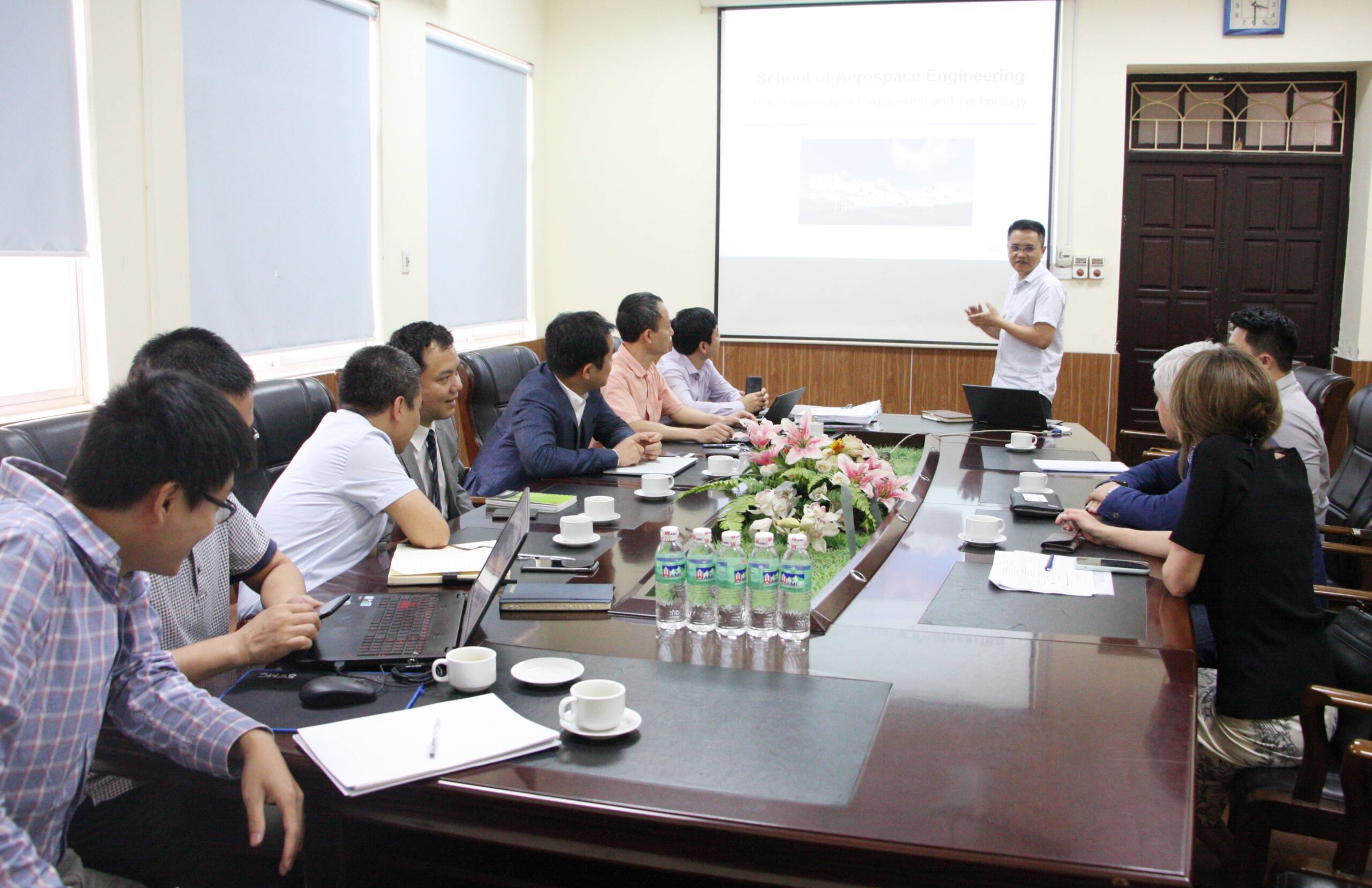 Tham dự buổi làm việc có PGS.TS. Nguyễn Việt Hà – Hiệu trưởng Nhà trường, PGS.TS. Phạm Bảo Sơn – Phó Hiệu trưởng, PGS.TS. Trần Xuân Tú – Trưởng phòng KHCN&HTPT cùng đại diện lãnh đạo Viện Công nghệ Hàng không vũ trụ.
