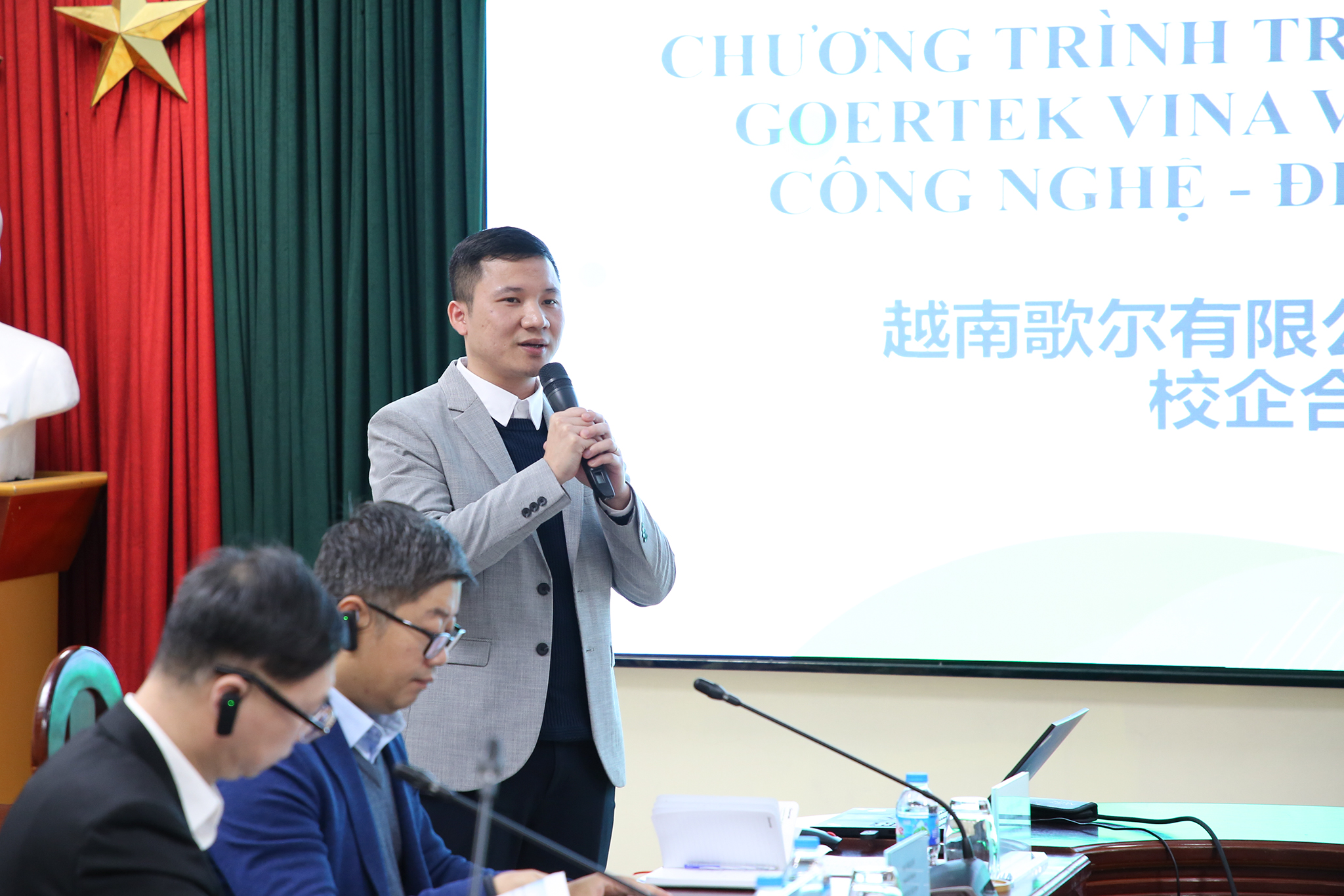 Tại buổi làm việc, TS. Nguyễn Ngọc An – Phó Trưởng phòng Khoa học công nghệ và hợp tác phát triển đã giới thiệu về các chương trình đào tạo, đội ngũ giảng viên, cơ sở vật chất, và các chương trình hợp tác về đào tạo, tuyển dụng giữa Trường ĐH Công nghệ và doanh nghiệp. Để hai bên hiểu rõ thế mạnh và có phương hướng hợp tác, ông Tống Văn Kiên – Trưởng phòng tuyển dụng Goertek Việt Nam đã trình bày về Tập đoàn Goertek và Goertek tại Việt Nam. Tập đoàn Goertek được thành lập năm 2001 chủ yếu nghiên cứu, chế tạo và phát triển các lĩnh vực như âm học, quang học, vi điện tử, kết cấu chính xác, phần cứng thông minh… Hiện nay, Goertek có hơn 80.000 nhân viên, trong đó có hơn 13.000 nhân viên nghiên cứu và phát triển sản phẩm R&D. Trong đó, Goertek Việt Nam đi vào hoạt động sản xuất năm 2013, chuyên sản xuất các lĩnh vực linh kiện âm học và quang học cũng như sản xuất các thiết bị thông minh. Với mục tiêu phát triển trong tương lai, Tập đoàn Goertek nói chung và Goertek Việt Nam nói riêng có kế hoạch tinh anh và chương trình đào tạo 2+1+1 nhằm bồi dưỡng, tuyển dụng sinh viên xuất sắc tại các trường đại học.