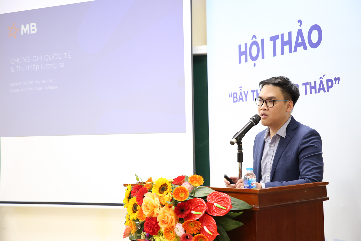 Tại buổi hội thảo, sinh viên đã lắng nghe diễn giả Nguyễn Duy Hải – Kiến trúc sư Công nghệ thông tin (Ngân hàng TMCP Quân đội MB) chia sẻ góc nhìn về “Chứng chỉ Quốc tế có thực sự cần và đủ cho thu nhập tương lai”. Với những kinh nghiệm “theo đuổi” chứng chỉ quốc tế 6-7 năm, ông Nguyễn Duy Hải đã chia sẻ cho sinh viên những lợi ích thực tế của chứng chỉ quốc tế. Trong đó, diễn giả khẳng định ngày nay với xu hướng toàn cầu hóa, sự đa dạng của chứng chỉ công nghệ xuất phát từ hãng công nghệ hàng đầu trên thế giới hoặc từ các tổ chức lợi nhuận, phi lợi nhuận, sinh viên có thể dễ dàng tiếp cận với những chứng chỉ này. Để đạt được những chứng chỉ này, ngoài việc sinh viên mất nhiều thời gian và tốn kém về kinh kế, chưa nói đến một số chứng chỉ còn yêu cầu về kinh nghiệm nghề nghiệp, diễn giả Nguyễn Duy Hải nhấn mạnh những giá trị quan trọng mà chứng chỉ quốc tế đem lại cho bản thân trong tương lai. Cụ thể là, sinh viên sẽ có hành trang tự tin để ứng tuyển vào các công ty hàng đầu trong lĩnh vực công nghệ thông tin với một CV đẹp, để duy trì khả năng cạnh và việc làm; chứng minh được kỹ năng và kiến thức của bản thân; đặt ra mục tiêu chinh phục bản thân và chiến thắng thử thách; xây dựng được cộng đồng chuyên gia hỗ trợ trong công việc, học tập.
