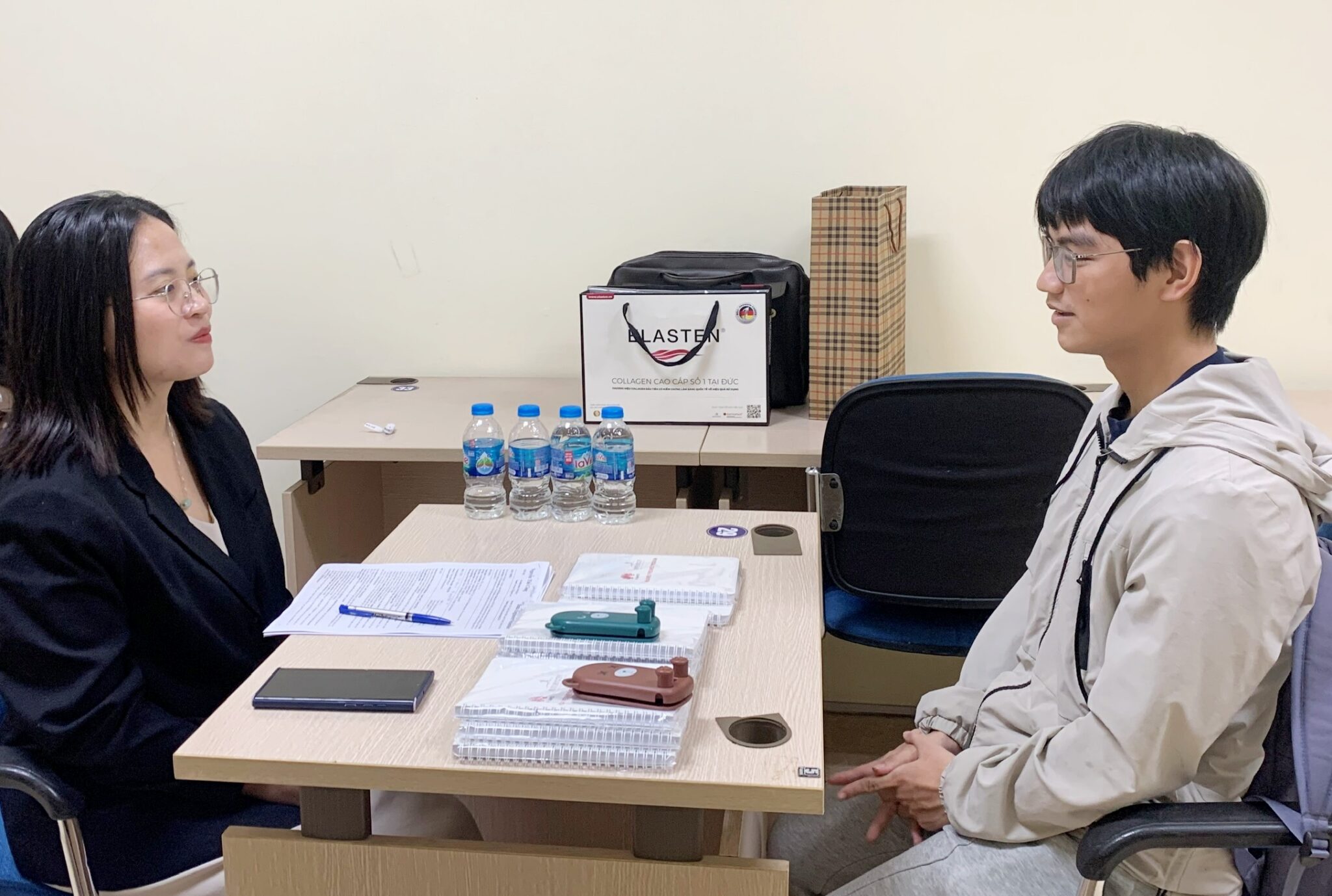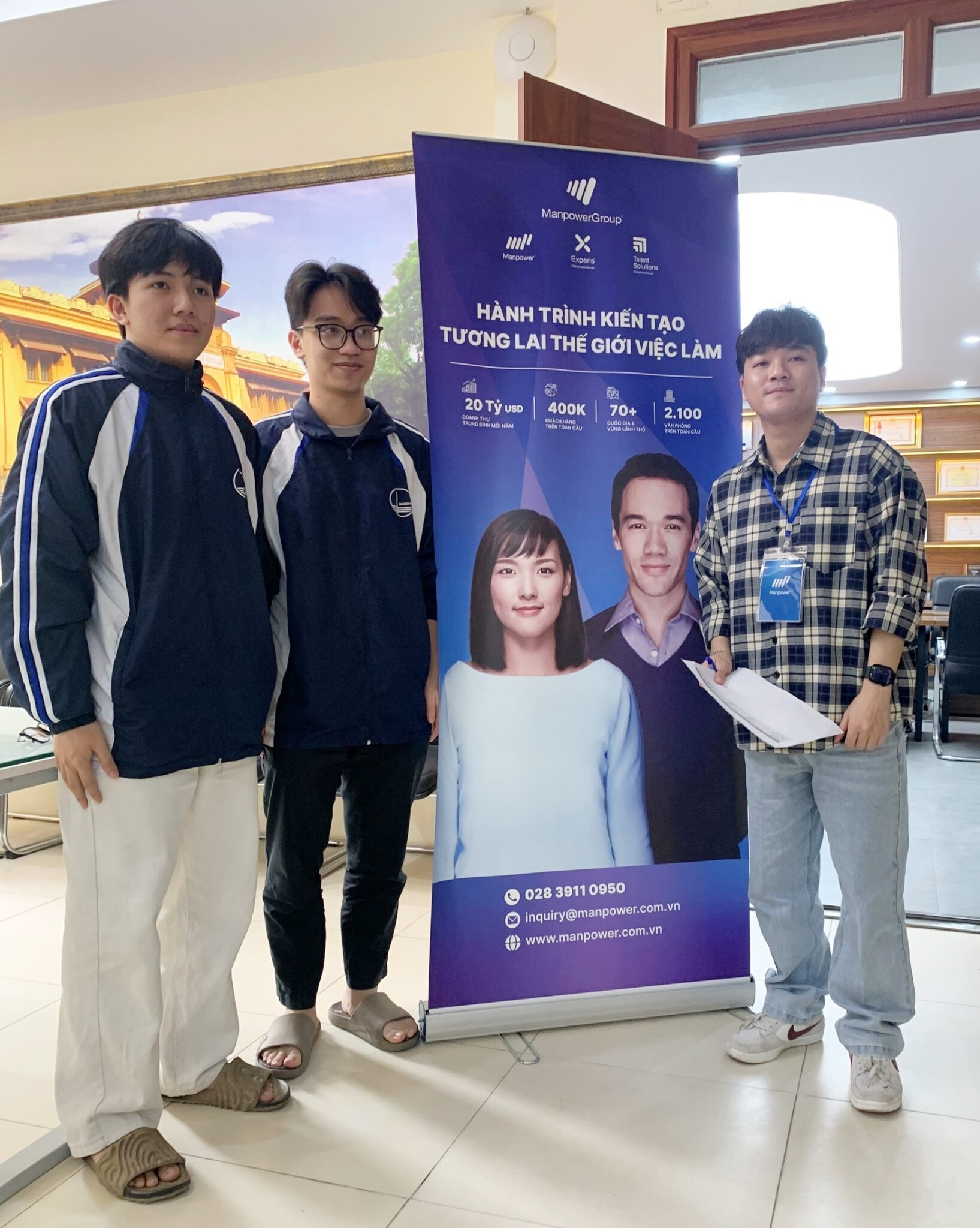 Sinh viên K70 Phùng Thế Đạt và Đặng Khánh Duy, ngành Công nghệ thông tin tham gia phỏng vấn thử tại Công ty TNHH Manpower Việt Nam