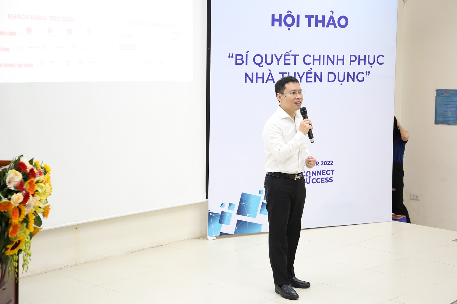 Mở đầu buổi hội thảo, TS. Bùi Trung Ninh phát biểu: “Trường ĐHCN với 23 năm truyền thống, 18 năm thành lập đã tiếp tục lớn mạnh và là một trong những đơn vị đào tạo có uy tín về chất lượng với các ngành công nghệ mũi nhọn như Công nghệ thông tin, Khoa học máy tính, Hệ thống thông tin, Công nghệ kỹ thuật điện tử – viễn thông, Công nghệ kỹ thuật Cơ điện tử… Đây là nơi đào tạo nguồn nhân lực chất lượng cao cho các doanh nghiệp, các trung tâm và các viện nghiên cứu. Hiện tại, Trường đang là đối tác của nhiều doanh nghiệp, tập đoàn trong nước và quốc tế. Với chủ trương, định hướng của Nhà trường, mong muốn của sinh viên và nhu cầu của nhà tuyển dụng, Trường ĐHCN đã tổ chức Ngày hội việc làm năm 2022 với mục tiêu trở thành cầu nối uy tín giữa Trường với các đơn vị tuyển dụng, cũng như sinh viên các khối ngành công nghệ kỹ thuật. Nhà trường hi vọng sau buổi hội thảo, sinh viên có cái nhìn đa chiều, thiết thực hơn trong việc chuẩn bị kiến thức còn thiếu khi bước vào thị trường lao động và tuyển dụng”. TS còn gửi lời cảm ơn đến các doanh nghiệp đã cùng đồng hành với Nhà trường trong lĩnh vực đào tạo và nghiên cứu suốt thời gian qua.