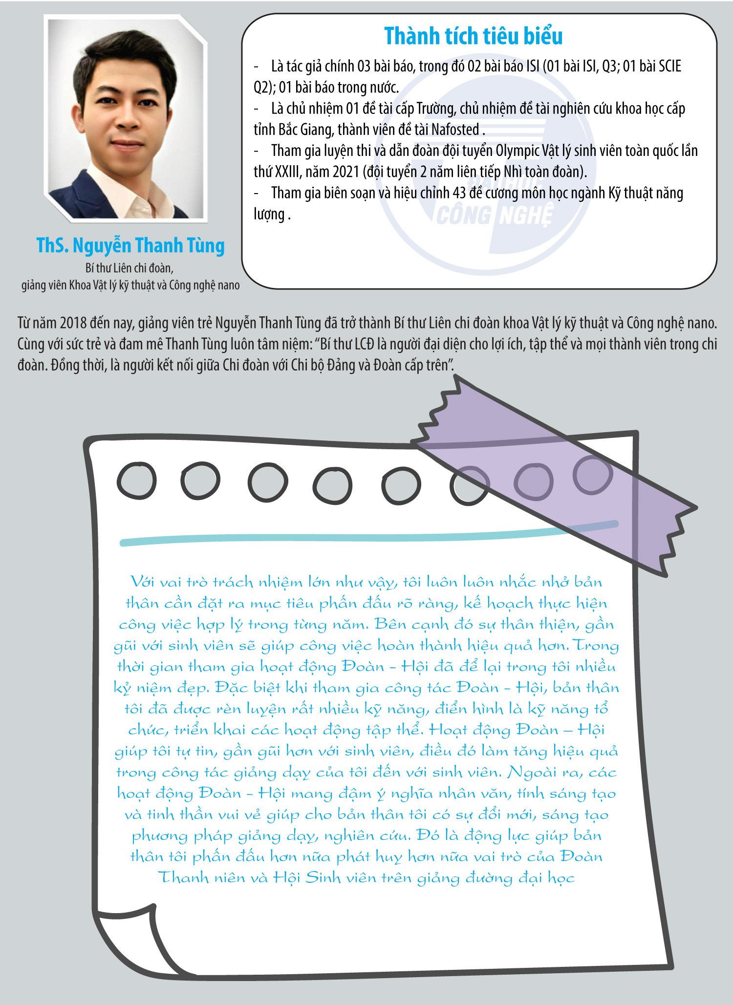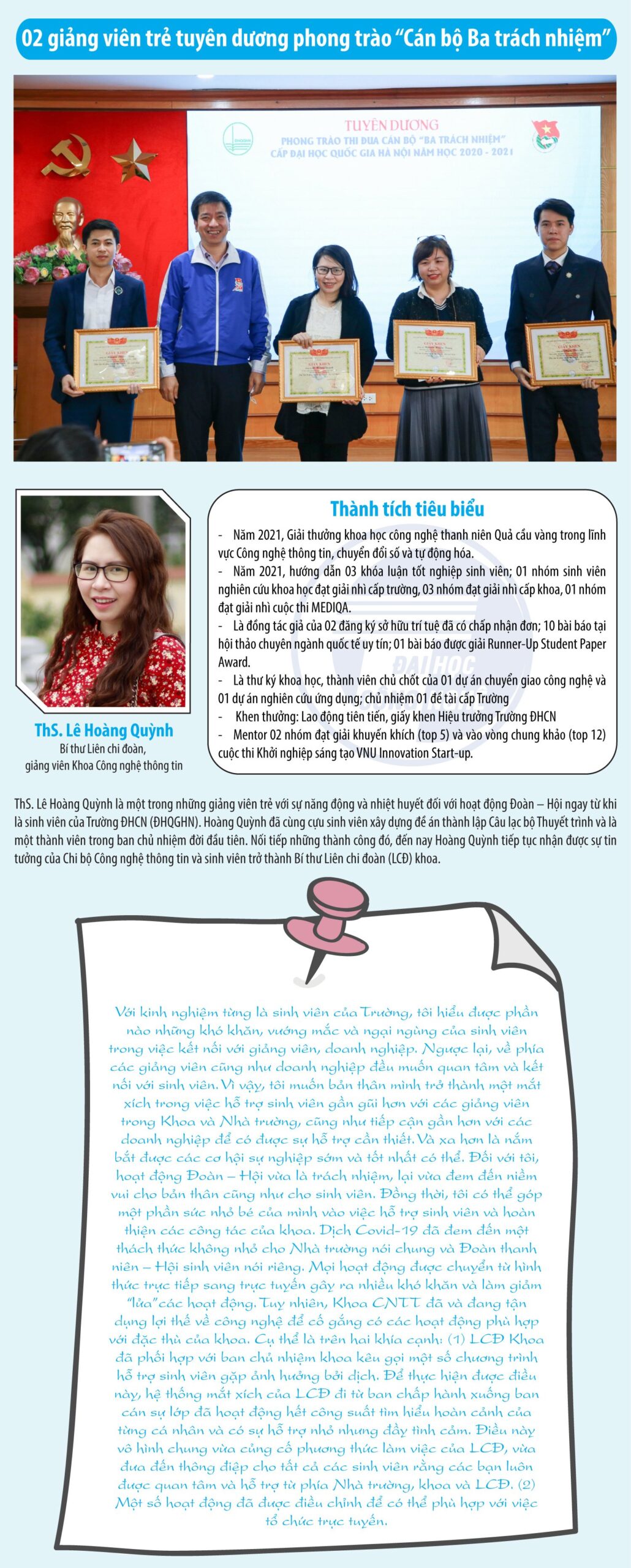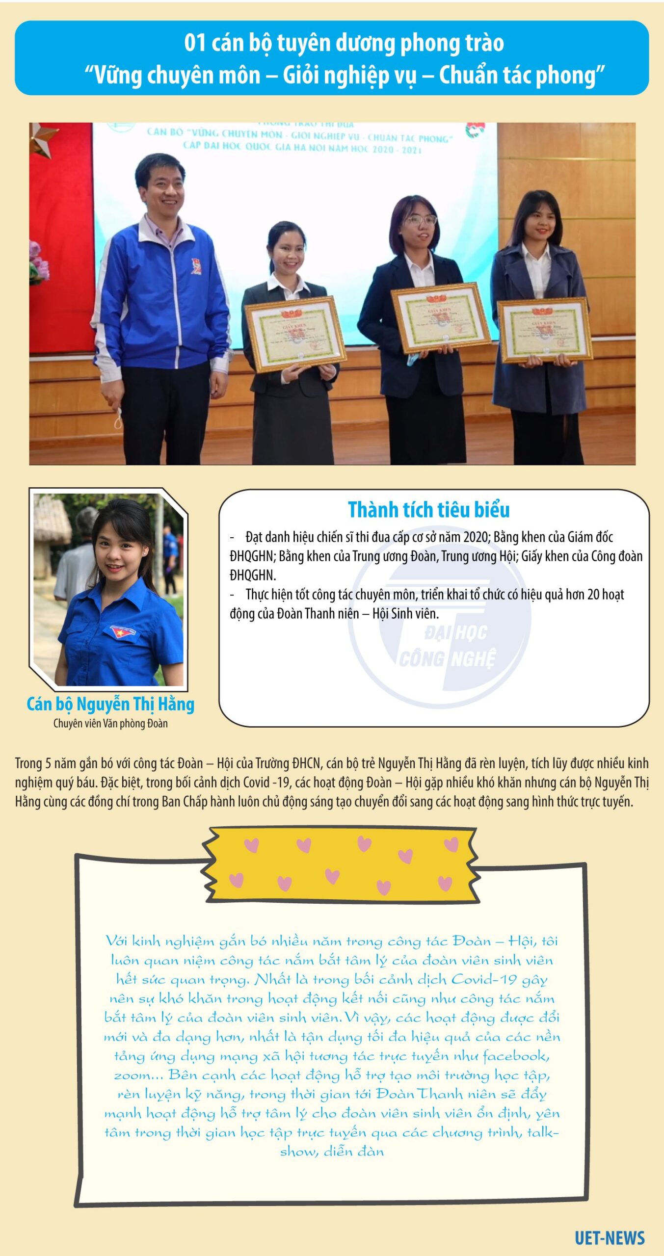 Năm học 2020-2021, Trường Đại học Công nghệ (Đại học Quốc gia Hà Nội) có 03 giảng viên và cán bộ trẻ được tuyên dương thực hiện tốt phong trào “Cán bộ Ba trách nhiệm” và phong trào “Vững chuyên môn – Giỏi nghiệp vụ – Chuẩn tác phong” gồm giảng viên Nguyễn Thanh Tùng (Khoa Vật lý kỹ thuật và Công nghệ nano), giảng viên Lê Hoàng Quỳnh (Khoa Công nghệ thông tin) và cán bộ Nguyễn Thị Hằng – chuyên viên Văn phòng Đoàn.