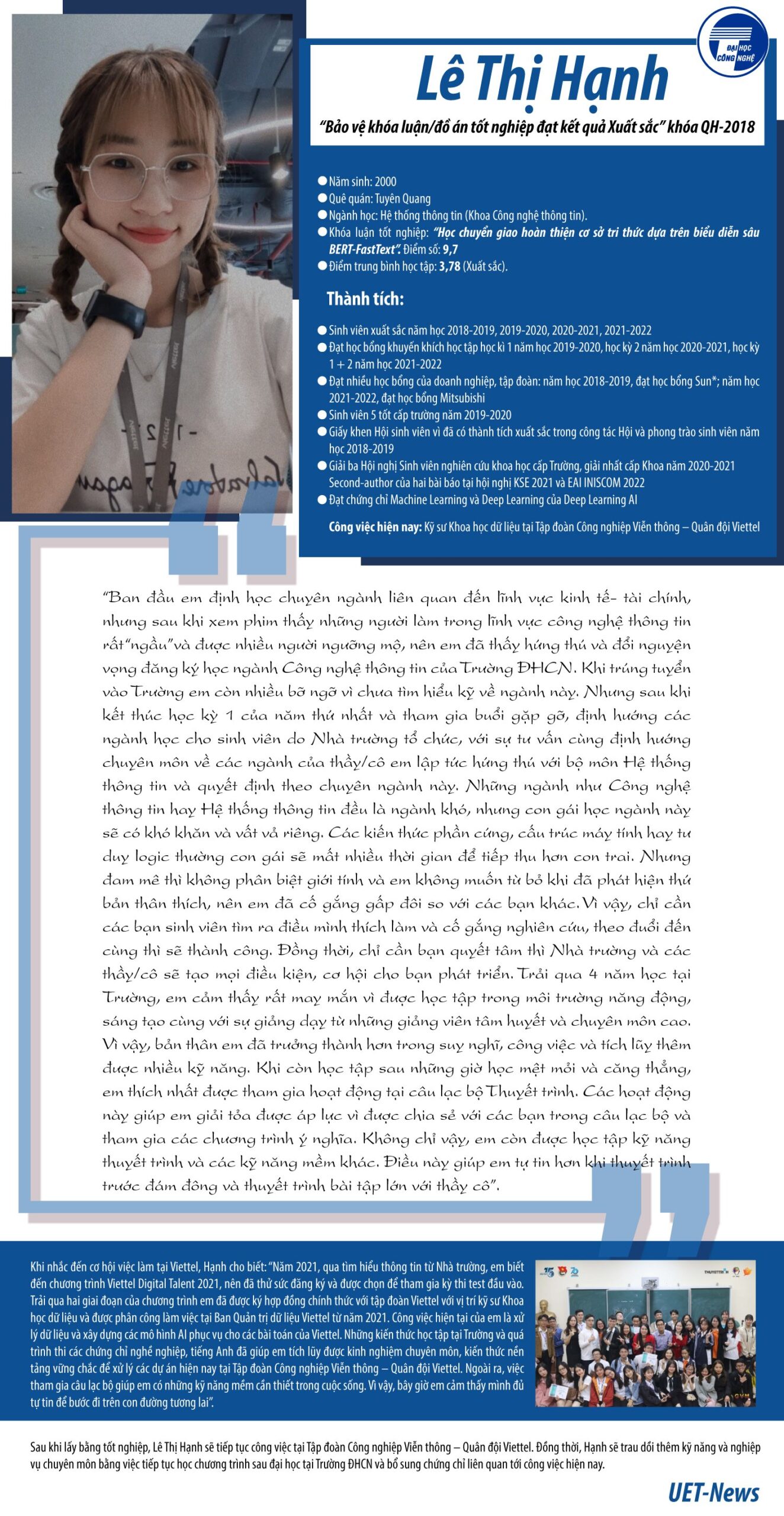 Sau 4 năm học Hệ thống thông tin, Lê Thị Hạnh (Trường Đại học Công nghệ, Đại học Quốc gia Hà Nội) với kết quả học tập Xuất sắc 3,78/4 cùng nhiều thành tích “đáng nể” trong học tập và nghiên cứu. Đồng thời, Hạnh là một trong những sinh viên được khen thưởng “Bảo vệ khóa luận/đồ án tốt nghiệp đạt kết quả Xuất sắc”.