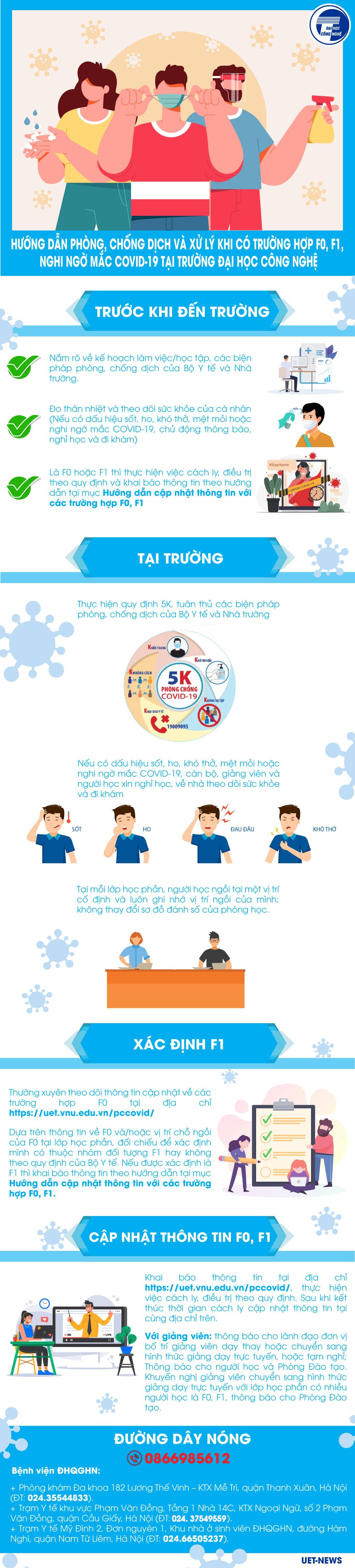 [Infographic] Hướng dẫn phòng, chống dịch và xử lý khi có trường hợp F0, F1, nghi ngờ mắc COVID-19 tại Trường Đại học Công nghệ