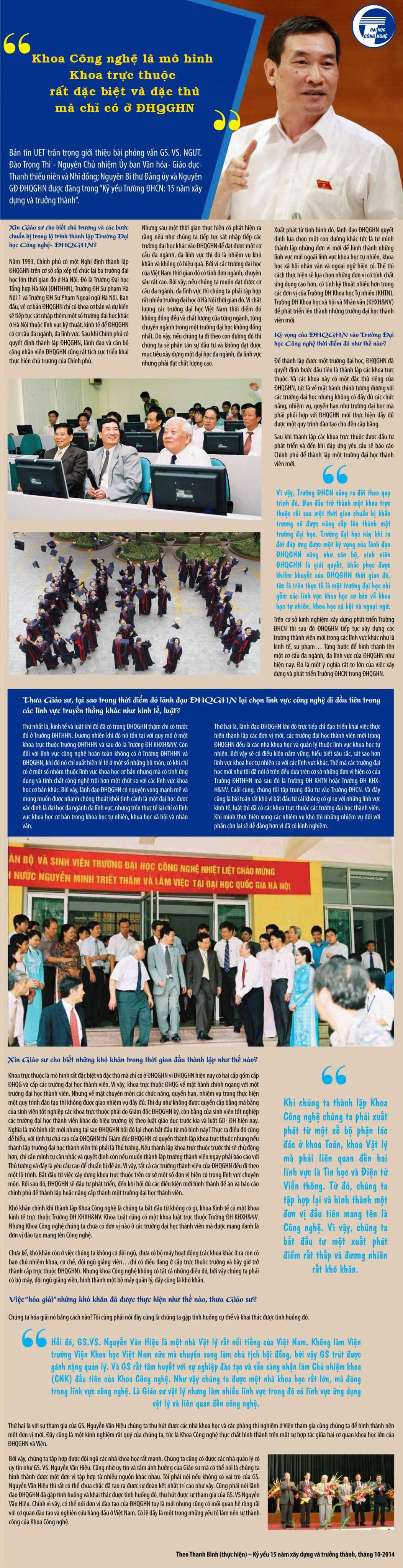 Nhân dịp kỷ niệm 22 năm ngày truyền thống Trường Đại học Công nghệ (18/10/1999-18/10/2021), Bản tin UET giới thiệu bài phỏng vấn của GS.VS. Đào Trọng Thi – nguyên Giám đốc Đại học Quốc gia Hà Nội chia sẻ về quan điểm, định hướng và khó khăn trong những ngày đầu thành lập Khoa Công nghệ (nay là Trường Đại học Công nghệ), được đăng trong Kỷ yếu “15 năm xây dựng và trưởng thành”.