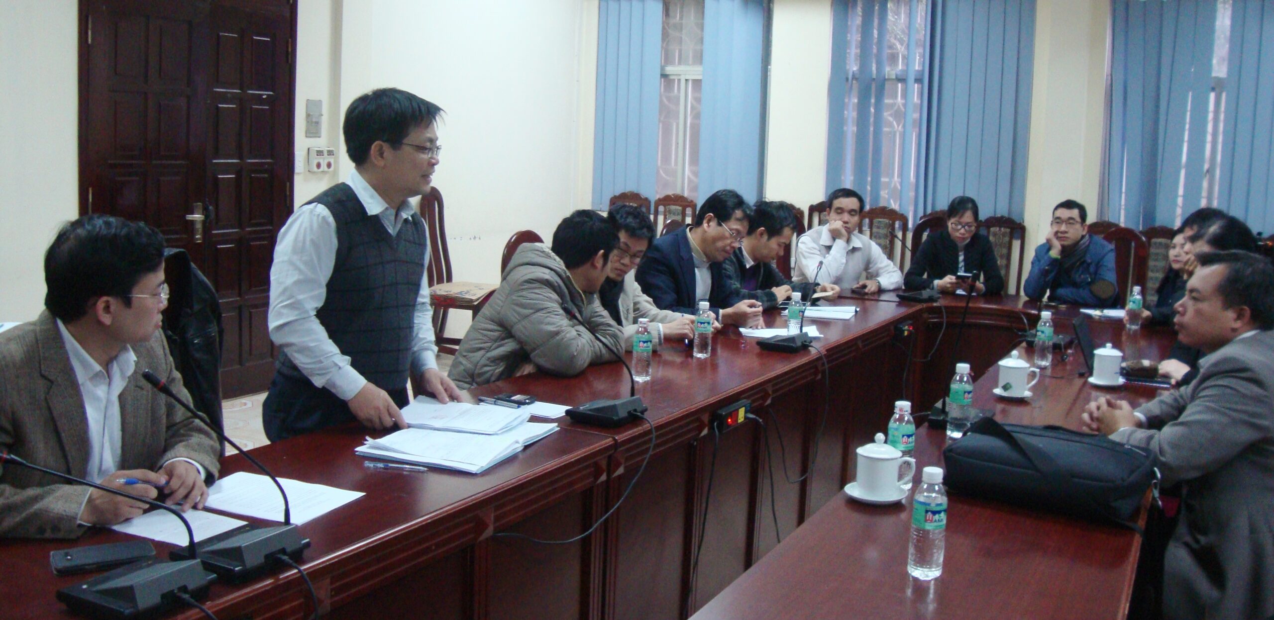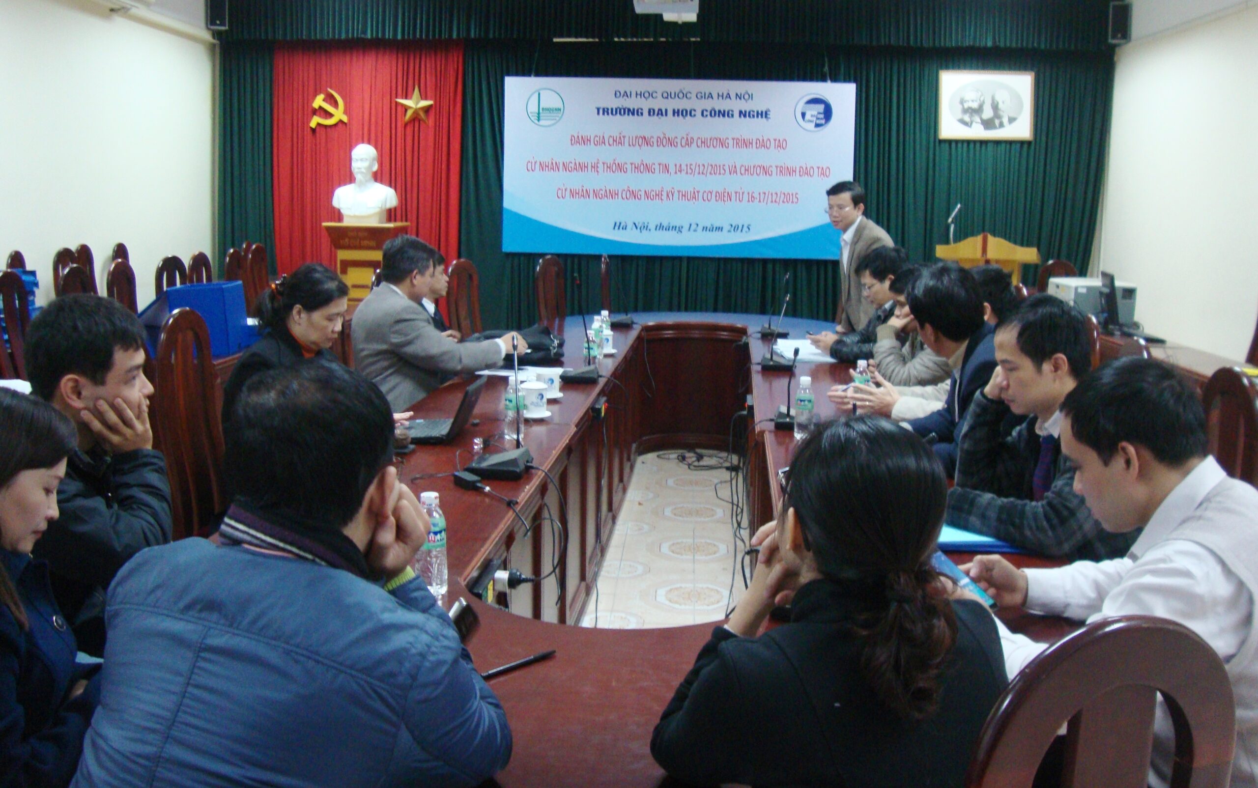 Tham gia buổi làm việc có Trưởng đoàn PGS.TS. Nguyễn Tiến Dũng – Trường Đại học Bách Khoa Hà Nội; TS. Mai Thị Quỳnh Lan- Thư ký, Viện Đảm bảo chất lượng giáo dục; PGS.TS. Phạm Trung Kiên – Ủy viên, Khoa Y dược. Về phía Trường Đại học Công nghệ có GS.TS. Nguyễn Thanh Thủy – Phó Hiệu trưởng Nhà trường và Ban Chủ nhiệm khoa Cơ học kỹ thuật và Tự động hóa cùng các cán bộ, giảng viên của Khoa.
