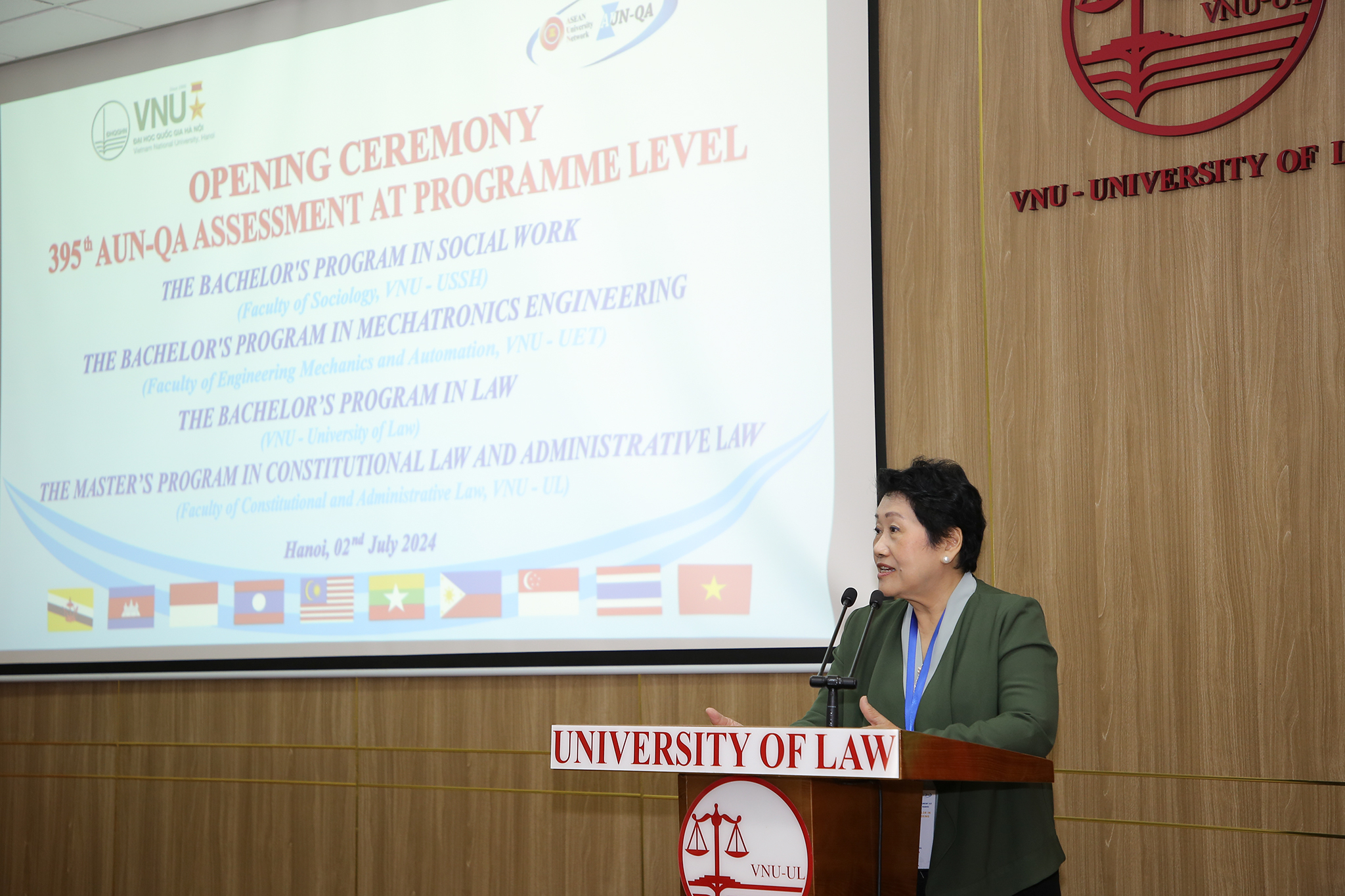 Đại diện đoàn đánh giá ngoài AUN-QA, GS.TS Wyona C. Patalinghug chia sẻ kể từ khi thành lập AUN-QA từ năm 1998, AUN-QA đã tiếp tục mở rộng sang những tầm nhìn xa hơn và không ngừng hoàn thiện để trở thành cơ quan Đảm bảo Chất lượng hàng đầu trong khu vực ASEAN. Chương trình đầu tiên đánh giá vào tháng 12/2007 và đến nay đã đánh giá 1.254 chương trình tại 8 quốc gia ASEAN. GS.TS Wyona C. Patalinghug cũng gửi lời cảm ơn tới ĐHQGHN cùng các trường đại học thành viên đã hỗ trợ trong suốt thời gian qua để chuẩn bị và tổ chức chương trình kiểm định lần này. Nhờ vậy công tác kiểm định sẽ mang lại những hiệu quả và hiệu ứng tích cực.