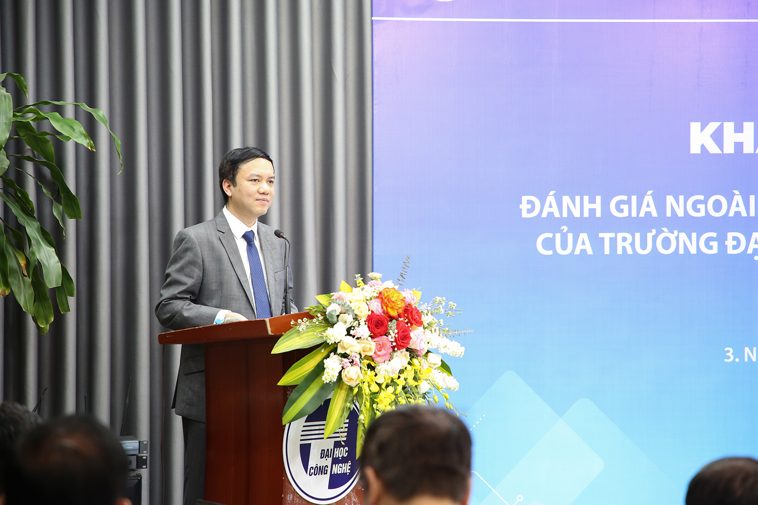 Phát biểu tại phiên khai mạc, PGS.TS. Nguyễn Việt Hà – Hiệu trưởng Trường ĐH Công nghệ trân trọng chào đón đoàn đánh giá ngoài đến kiểm định 4 chương trình đào tạo của Trường ĐH Công nghệ. Hiệu trưởng hi vọng trong thời gian Đoàn ĐGN khảo sát chính thức tại Trường sẽ là ngày hội của công tác đảm bảo chất lượng để trao đổi, chia sẻ thông tin và kinh nghiệm quản lý. Nhà trường sẽ phối hợp tích cực và tạo điều kiện thuận lợi để Đoàn ĐGN hoàn thành chương trình khảo sát chính thức 4 chương trình đào tạo theo kế hoạch.