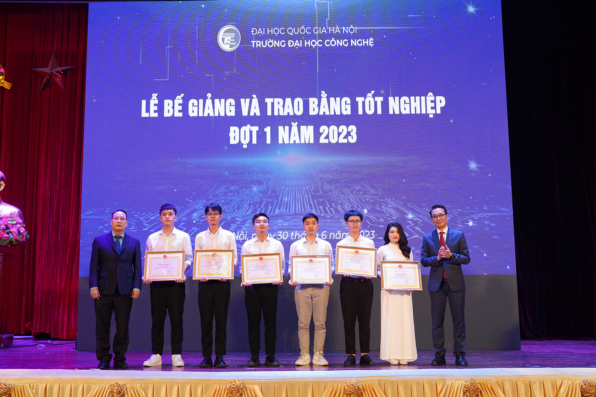 Thủ khoa tốt nghiệp Đoàn Việt Hưng (đứng thứ ba, bên trái ảnh) được khen thưởng tại lễ bế giảng