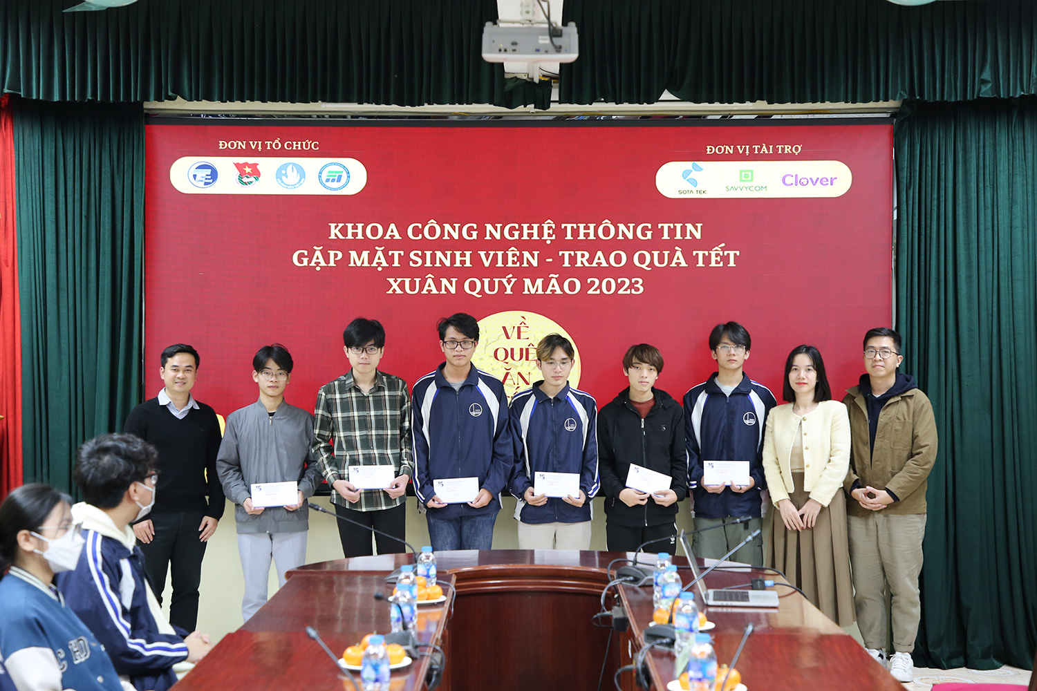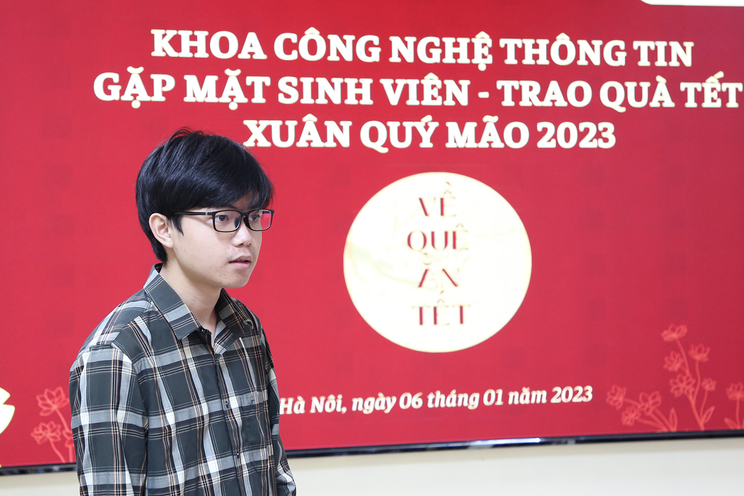 Chiều ngày 06/01/2023, Khoa Công nghệ thông tin (Trường Đại học Công nghệ – Đại học Quốc gia Hà Nội) đã tổ chức trao các suất quà Tết cho sinh viên nhằm hỗ trợ, động viên những sinh viên có hoàn cảnh khó khăn được về quê đón Tết, vui xuân Quý Mão 2023 cùng gia đình.