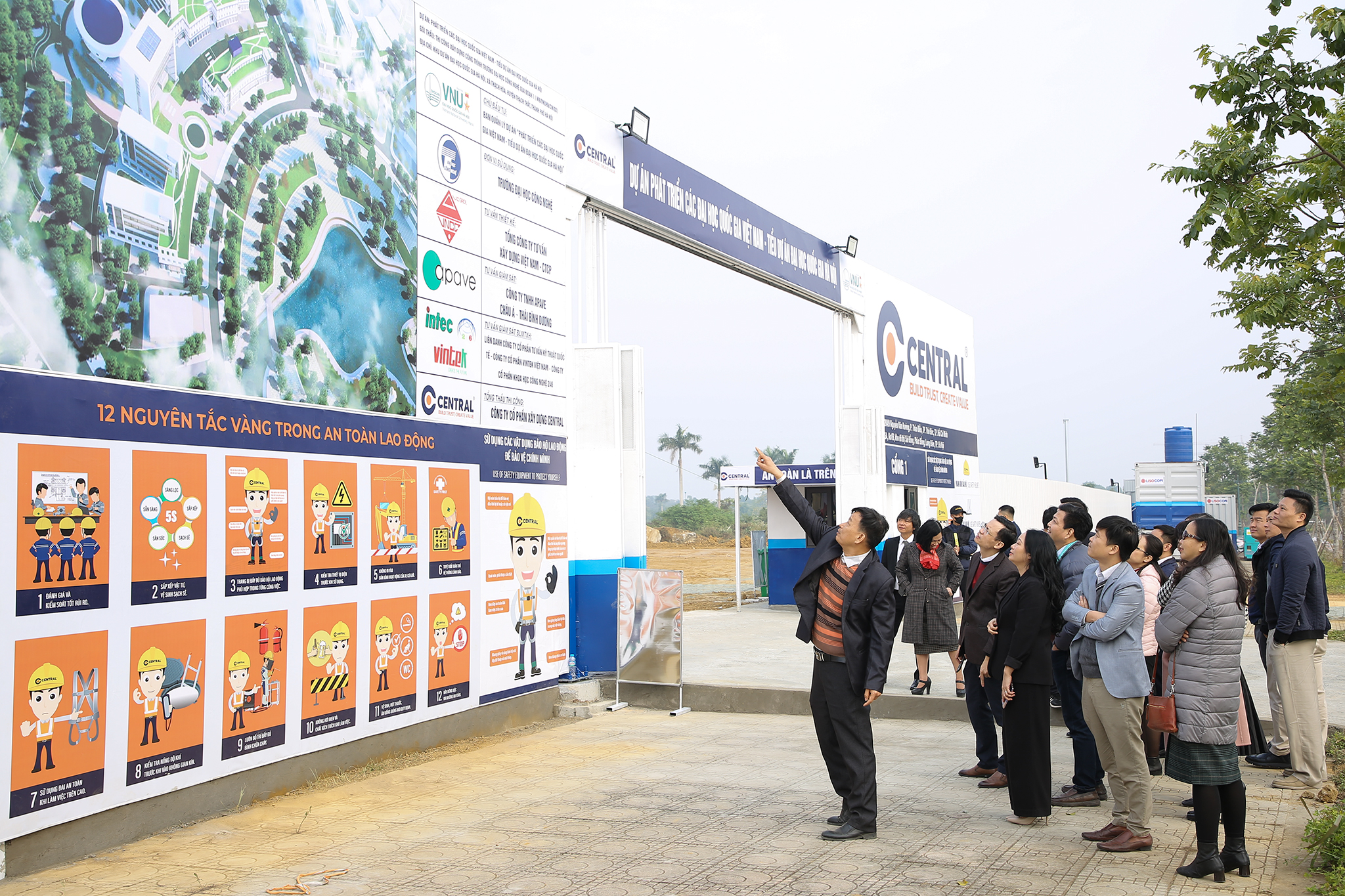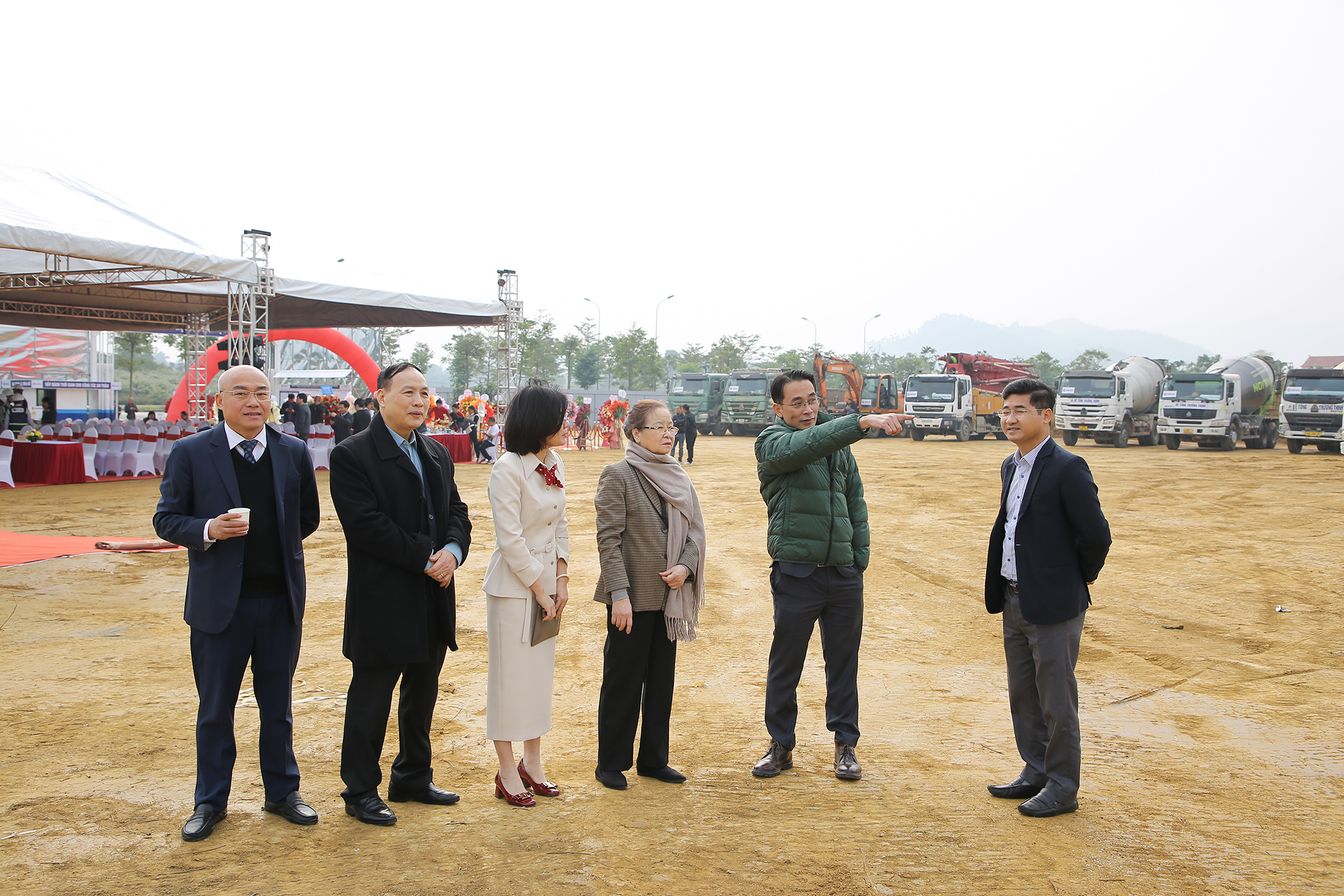 Ban lãnh đạo Trường ĐH Công nghệ giới thiệu khu vực xây dựng trường với TS. Nguyễn Thị Bích Hà – phu nhân GS.VS. Nguyễn Văn Hiệu – Hiệu trưởng sáng lập Trường