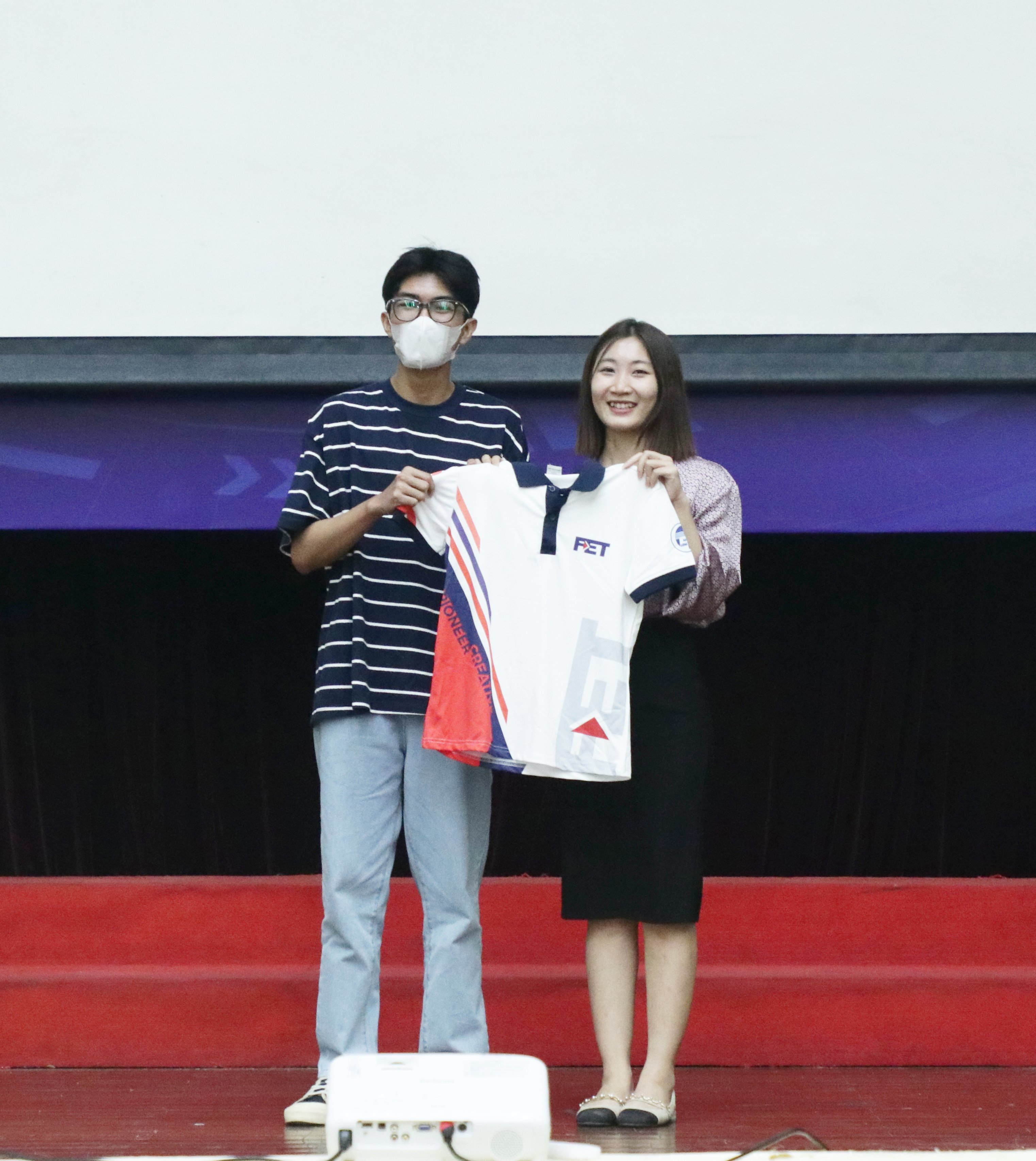 Hiệu trưởng đã giới thiệu về lịch sử hình thành, phát triển Trường ĐH Công nghệ; sứ mạng “bồi dưỡng nhân tài”, “đào tạo nguồn nhân lực chất lượng cao” và giá trị cốt lõi của Nhà trường là “Đổi mới sáng tạo, Hợp tác, Chất lượng cao, Nhân văn” cùng triết lý giáo dục “Sáng tạo và vun đắp giá trị nhân văn của công nghệ”.