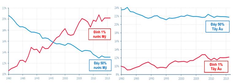 Hình 4. Trong giai đoạn 1980-2016, phân cực giàu-nghèo về thu nhập tại nước Mỹ ngày càng tăng (trái) còn Tây Âu không có biến động đáng kể (phải) [60]