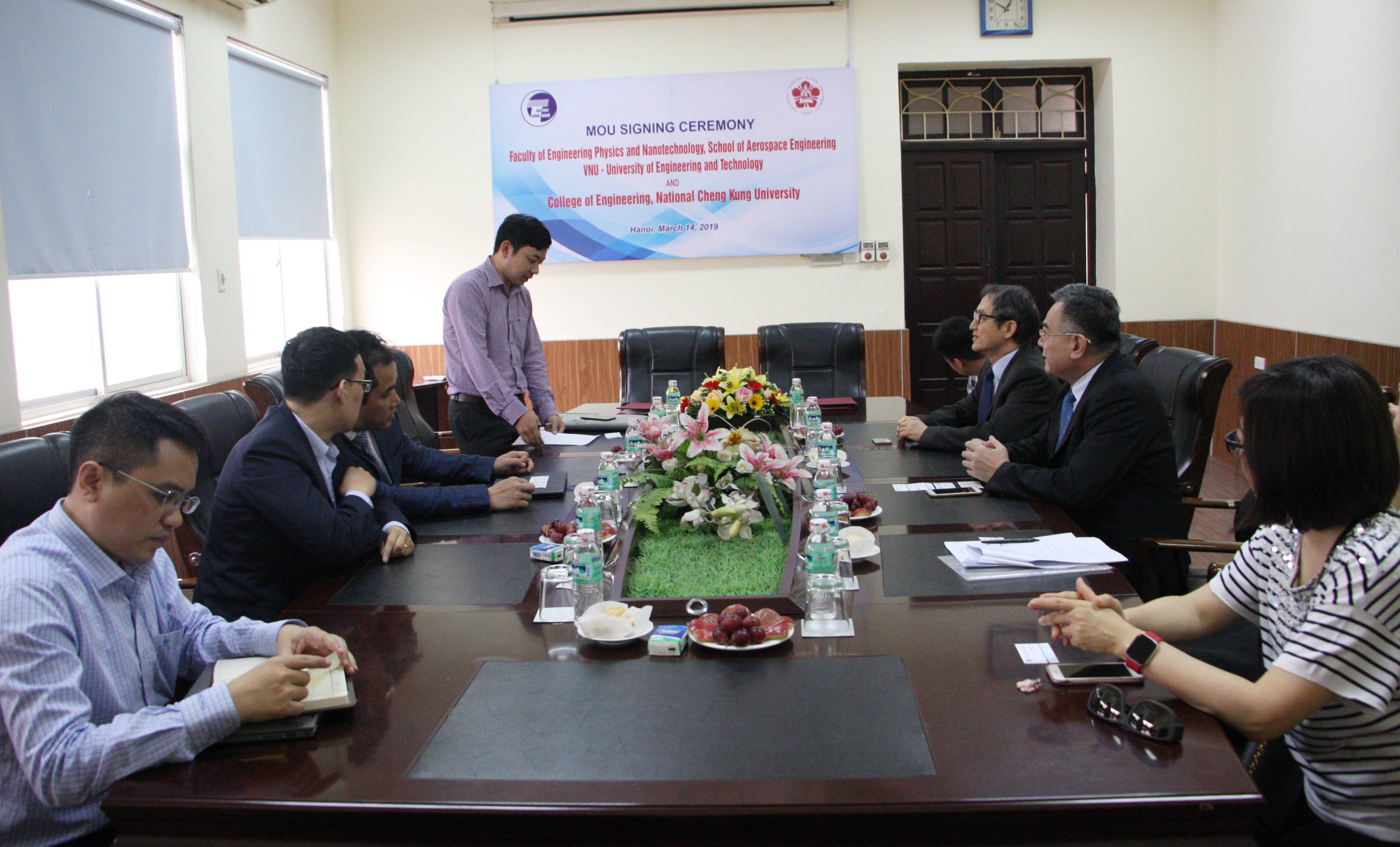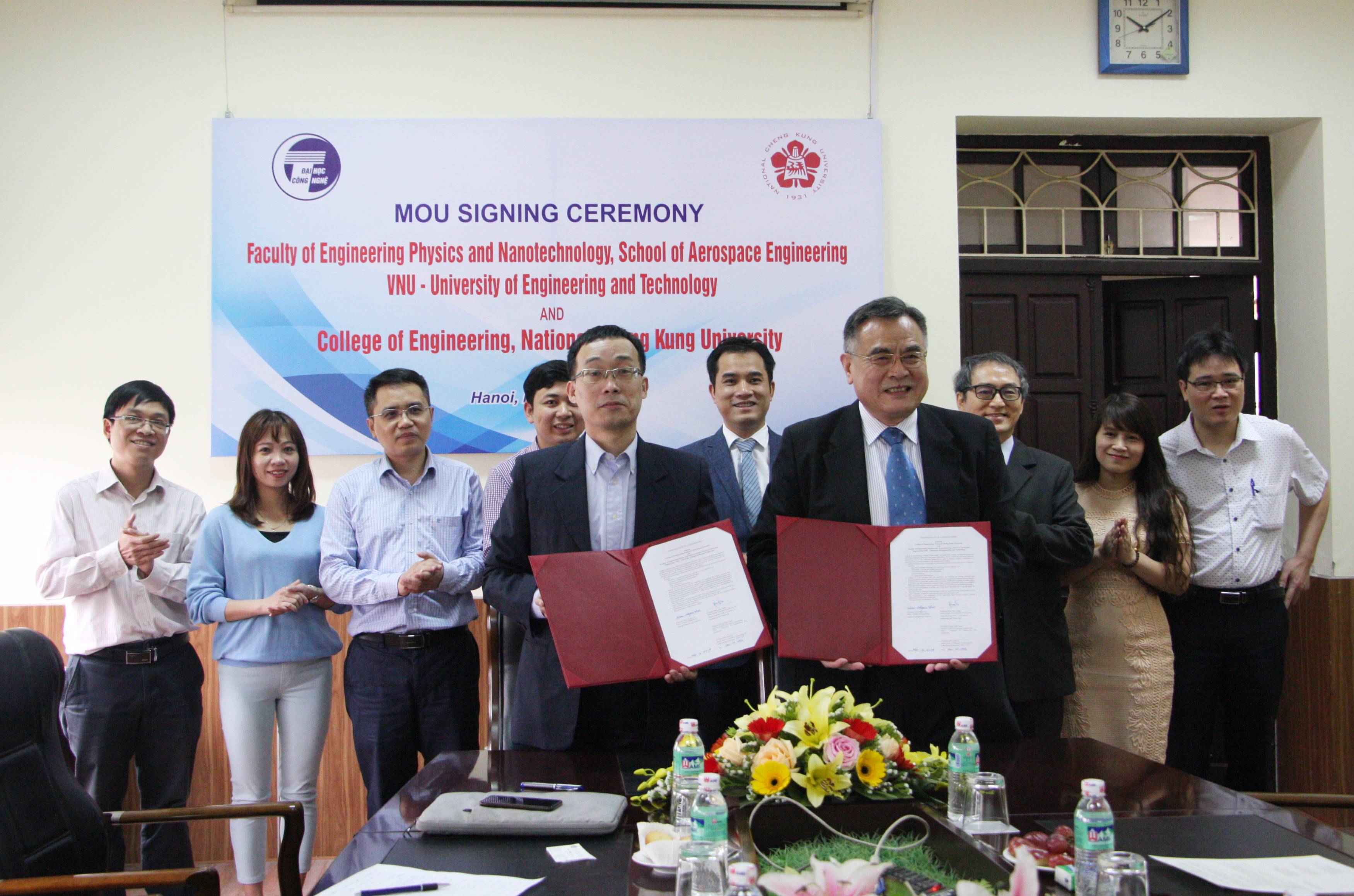 Sáng ngày 14/03, khoa Vật lý kỹ thuật & Công nghệ nano và Viện Công nghệ Hàng không vũ trụ – Trường Đại học Công nghệ (ĐHQGHN) đã tổ chức Lễ ký kết biên bản hợp tác toàn diện về lĩnh vực đào tạo, nghiên cứu khoa học, trao đổi giảng viên và sinh viên với khoa Kỹ thuật, Đại học Quốc Gia Cheng Kung (NCKU), Đài Loan tại nhà E3.