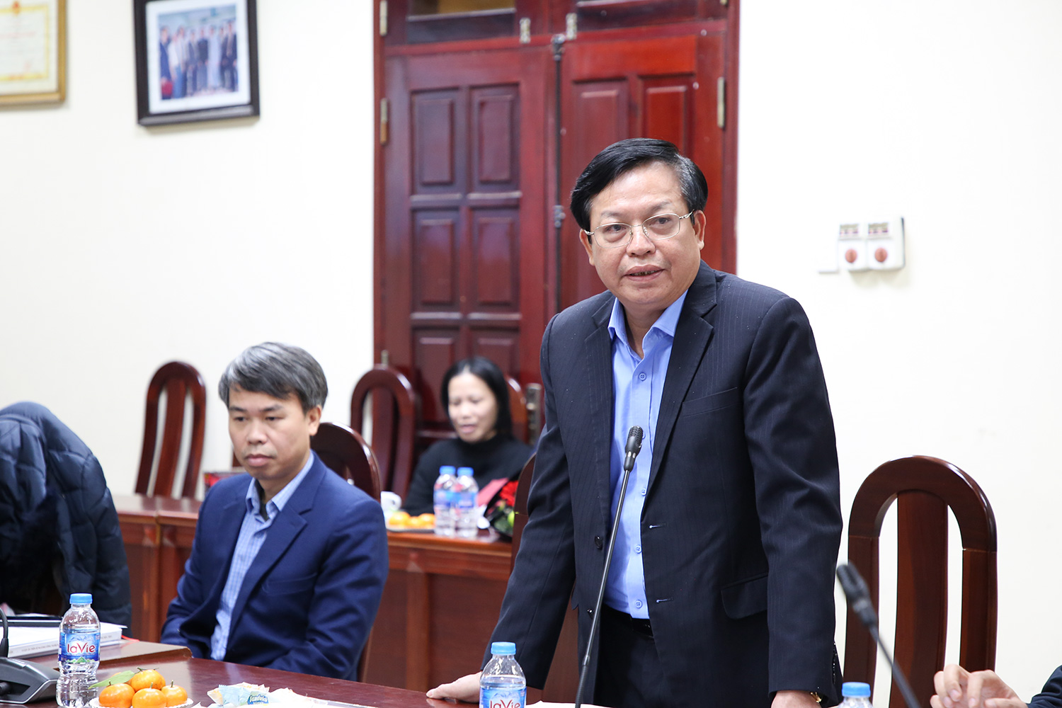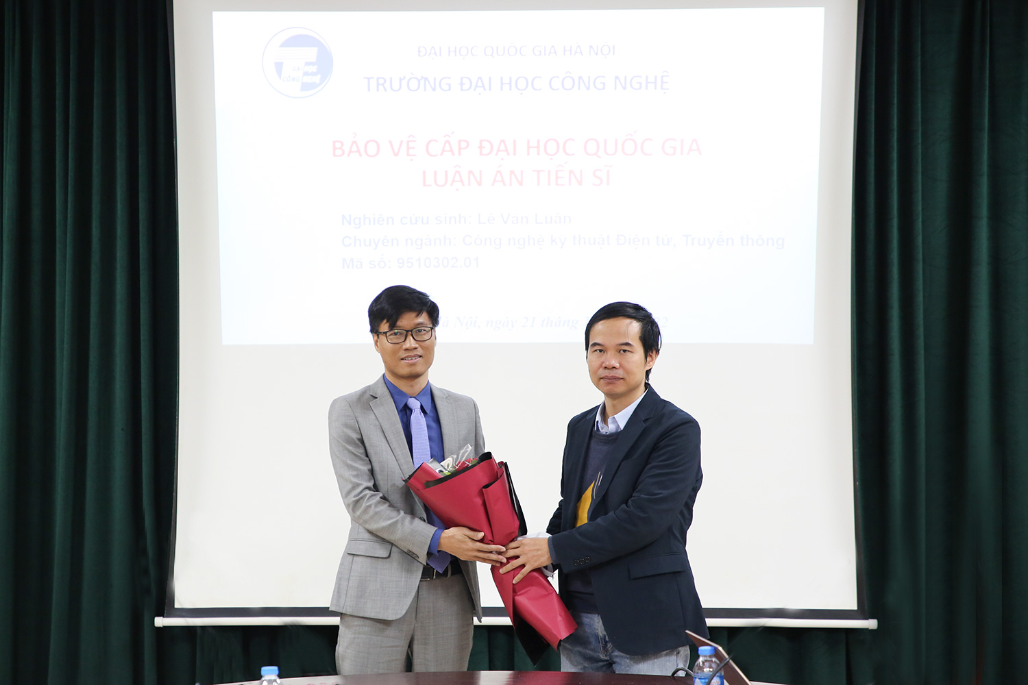PGS.TS. Nguyễn Phương Thái – Trưởng phòng Đào tạo tặng hoa chúc mừng NCS bảo vệ thành công luận án Tiến sĩ cấp Đại học Quốc gia