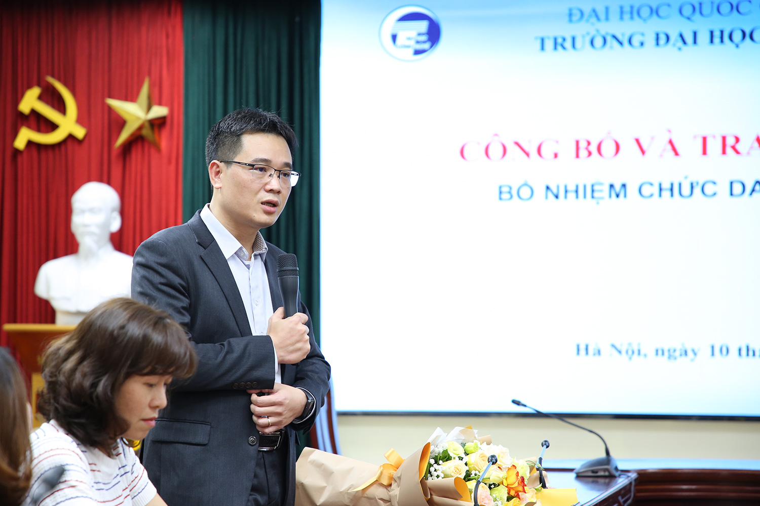 Tham dự buổi lễ có GS.TS. Chử Đức Trình – Phó Hiệu trưởng Nhà trường, TS. Nguyễn Anh Thái – Phó Hiệu trưởng, TS. Nguyễn Thu Hương – Phó Hiệu trưởng, Lãnh đạo khoa Vật lý kỹ thuật và công nghệ nano, phòng thí nghiệm trọng điểm Công nghệ Micro & nano cùng đồng nghiệp của tân PGS.