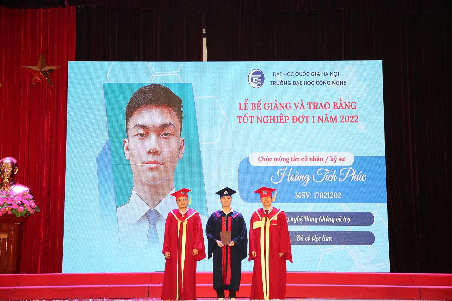 GS.TSKH Nguyễn Đình Đức và Hiệu trưởng Nguyễn Việt Hà trao bằng khen của ĐHQGHN dành cho thủ khoa tốt nghiệp Nguyễn Quốc An (ngoài cùng, bên phải, thủ khoa tốt nghiệp ngành Khoa học máy tính), Lương Đức Huy (thứ 3 bên phải, thủ khoa tốt nghiệp ngành Công nghệ kỹ thuật điện tử – viễn thông), Đỗ Văn Hậu (thứ 2 bên trái, thủ khoa tốt nghiệp ngành Công nghệ kỹ thuật cơ điện tử) và tân cử nhân Bùi Duy Nam (ngoài cùng, bên trái, ngành Kỹ thuật robot) đạt thành tích xuất sắc toàn khóa học