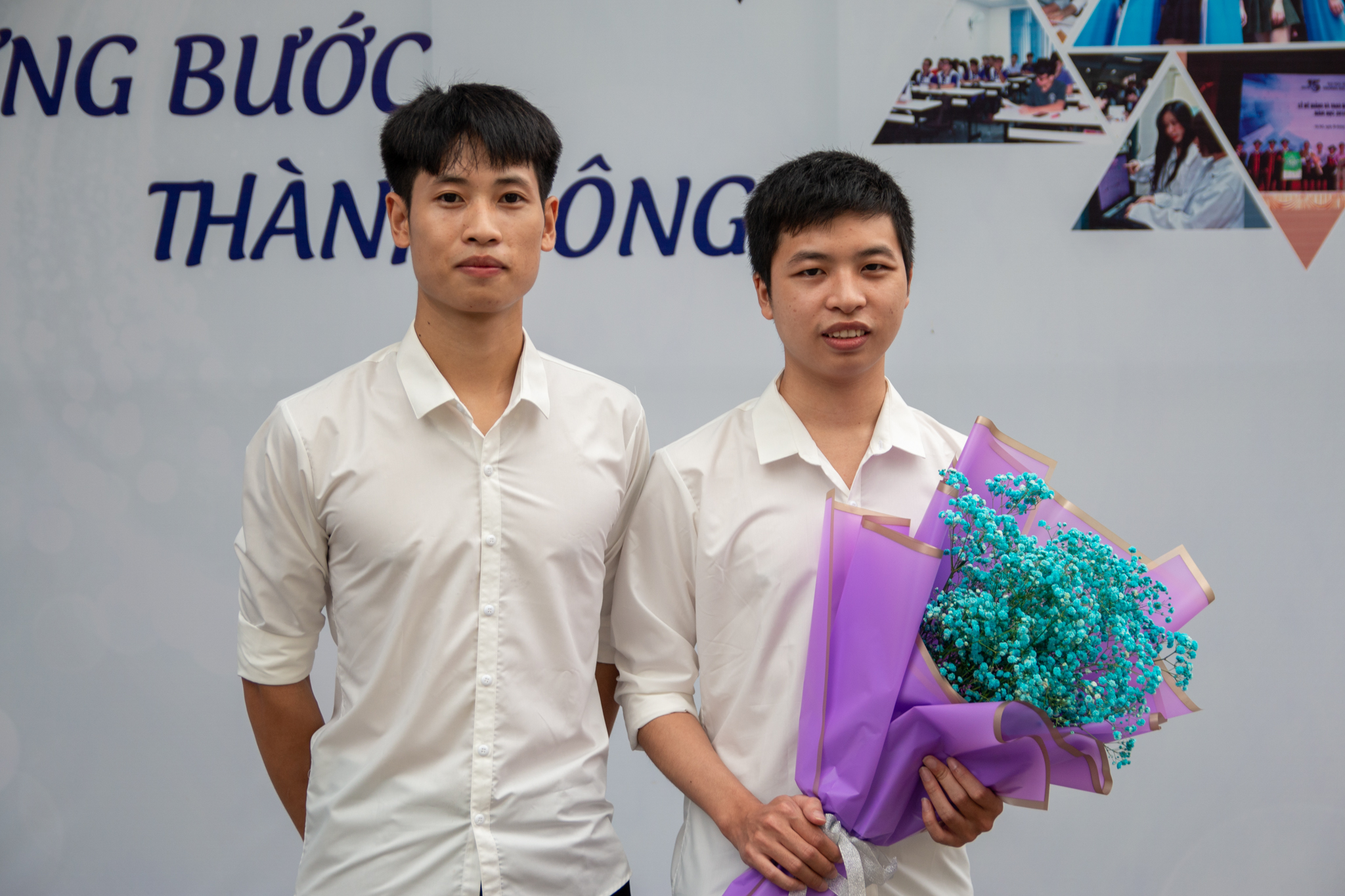 Tân cử nhân Nguyễn Hữu Điệp (bên phải ảnh) chụp ảnh cùng em trai Nguyễn Hữu Đạt tại Lễ tốt nghiệp