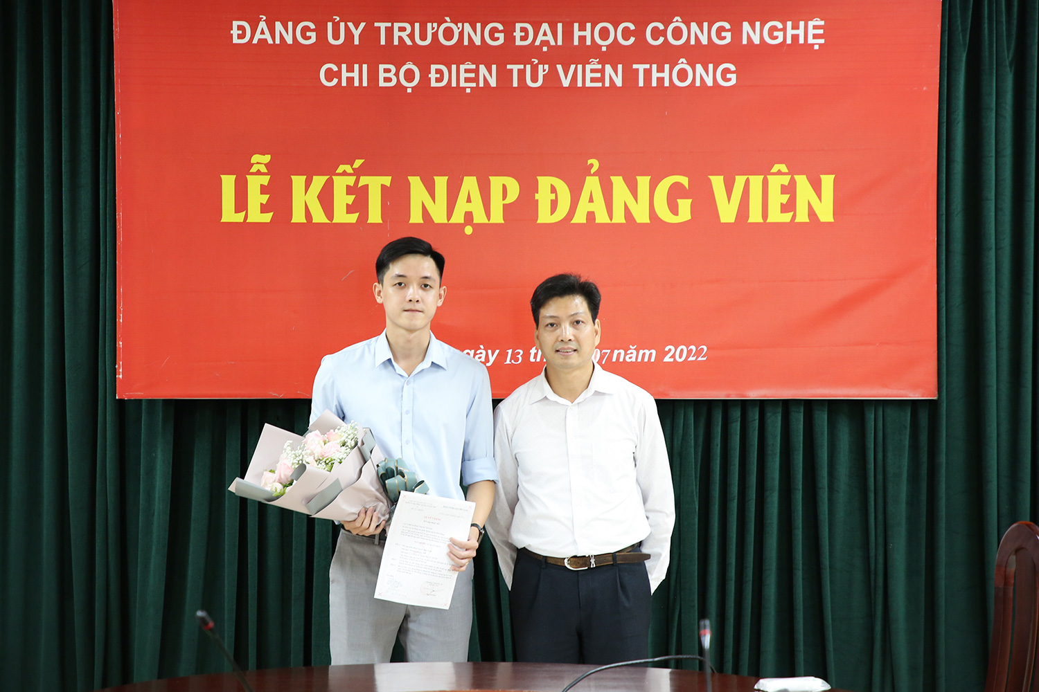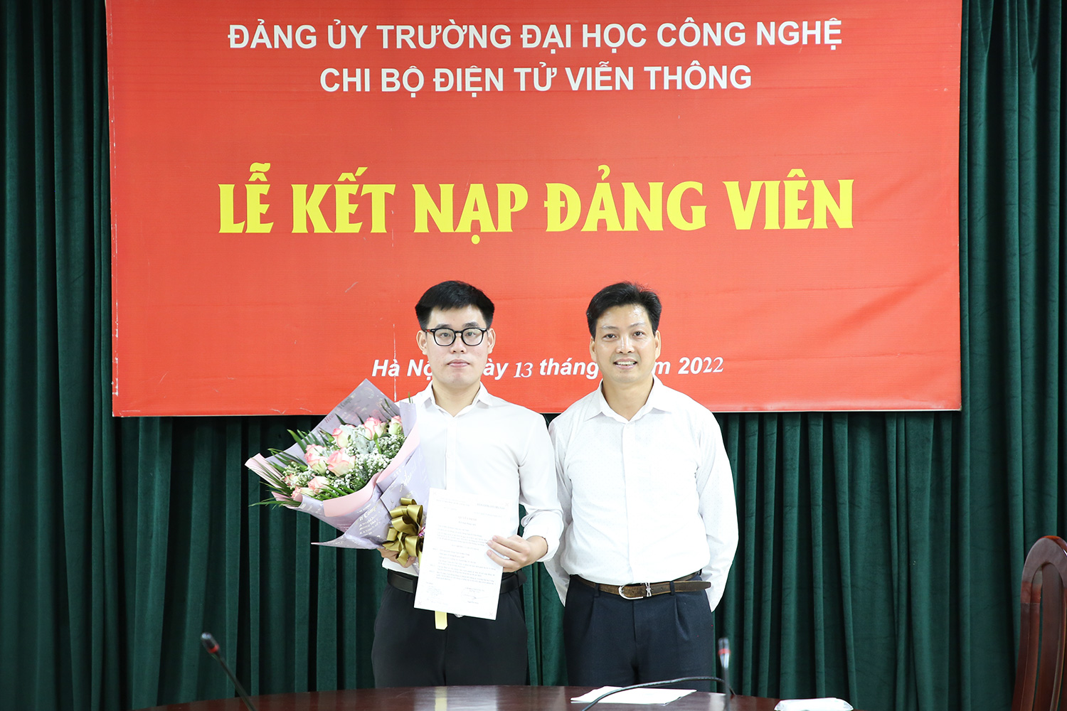 Trong không khí trang nghiêm khi nhận quyết định kết nạp, dưới cờ Tổ quốc, cờ Đảng và chân dung Chủ tịch Hồ Chí Minh, các tân đảng viên đã tuyên thệ lời thề của người đảng viên Đảng Cộng sản Việt Nam, hứa sẽ tiếp tục phấn đấu để luôn xứng đáng là người đảng viên gương mẫu, đóng góp sức mình thực hiện thành công nhiệm vụ chính trị của Chi bộ, góp phần xây dựng Đảng bộ Trường ĐHCN ngày càng vững mạnh.Tại buổi Lễ, TS. Đinh Triều Dương – Bí thư Chi bộ Điện tử viễn thông đã lần lượt trao Quyết định kết nạp Đảng viên cho 02 quần chúng ưu tú, căn dặn và giao nhiệm vụ cho các đồng chí tân đảng viên tiếp tục phát huy vai trò trách nhiệm trong tu dưỡng, rèn luyện, phấn đấu, học tập, nâng cao nhận thức chính trị và năng lực chuyên môn, nghiệp vụ, góp phần xây dựng Chi bộ trong sạch, vững mạnh; thực hiện đúng nghĩa vụ của người đảng viên Đảng Cộng sản Việt Nam, đặc biệt là thực hiện tốt quy định về những điều Đảng viên không được làm.