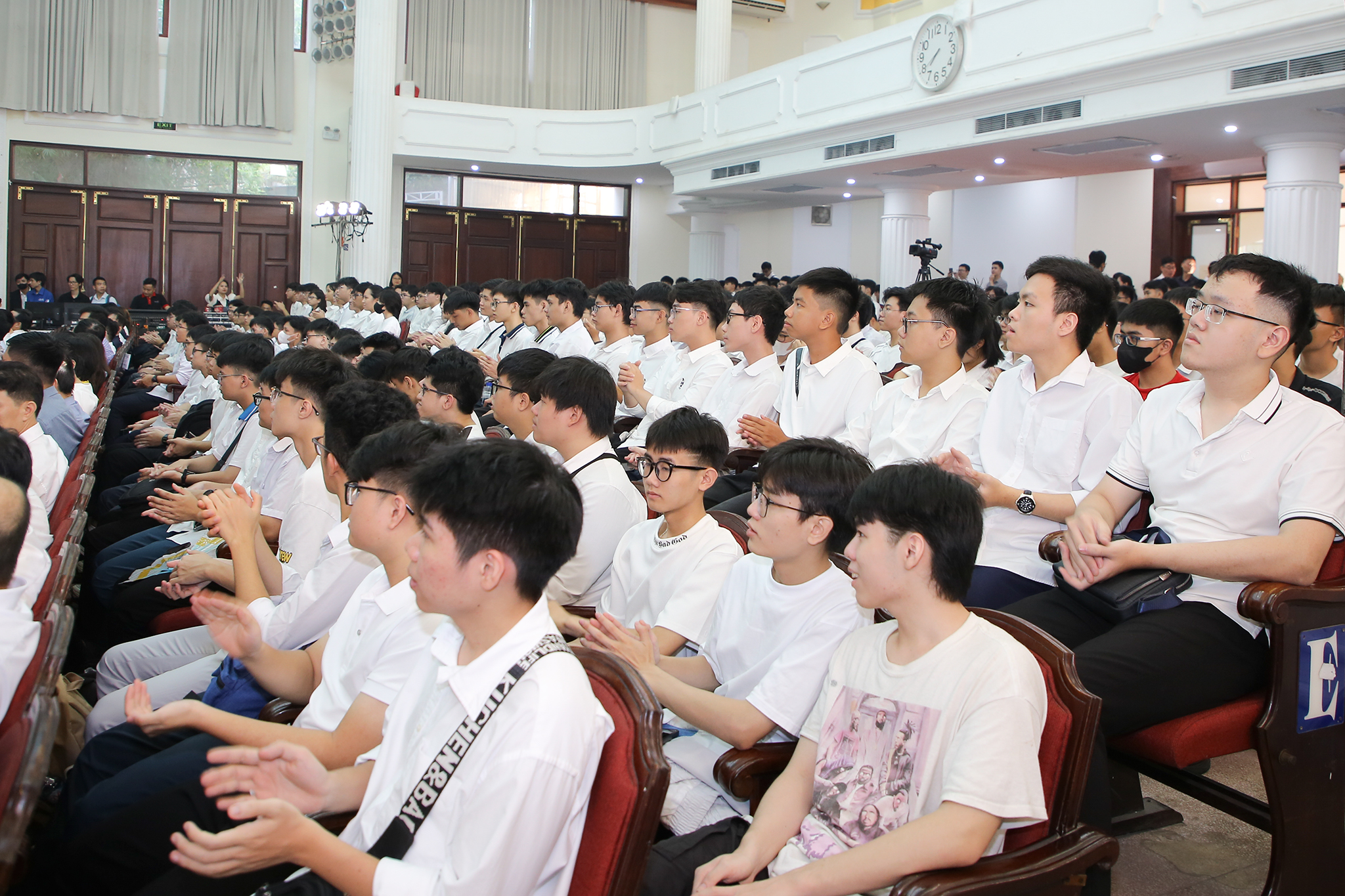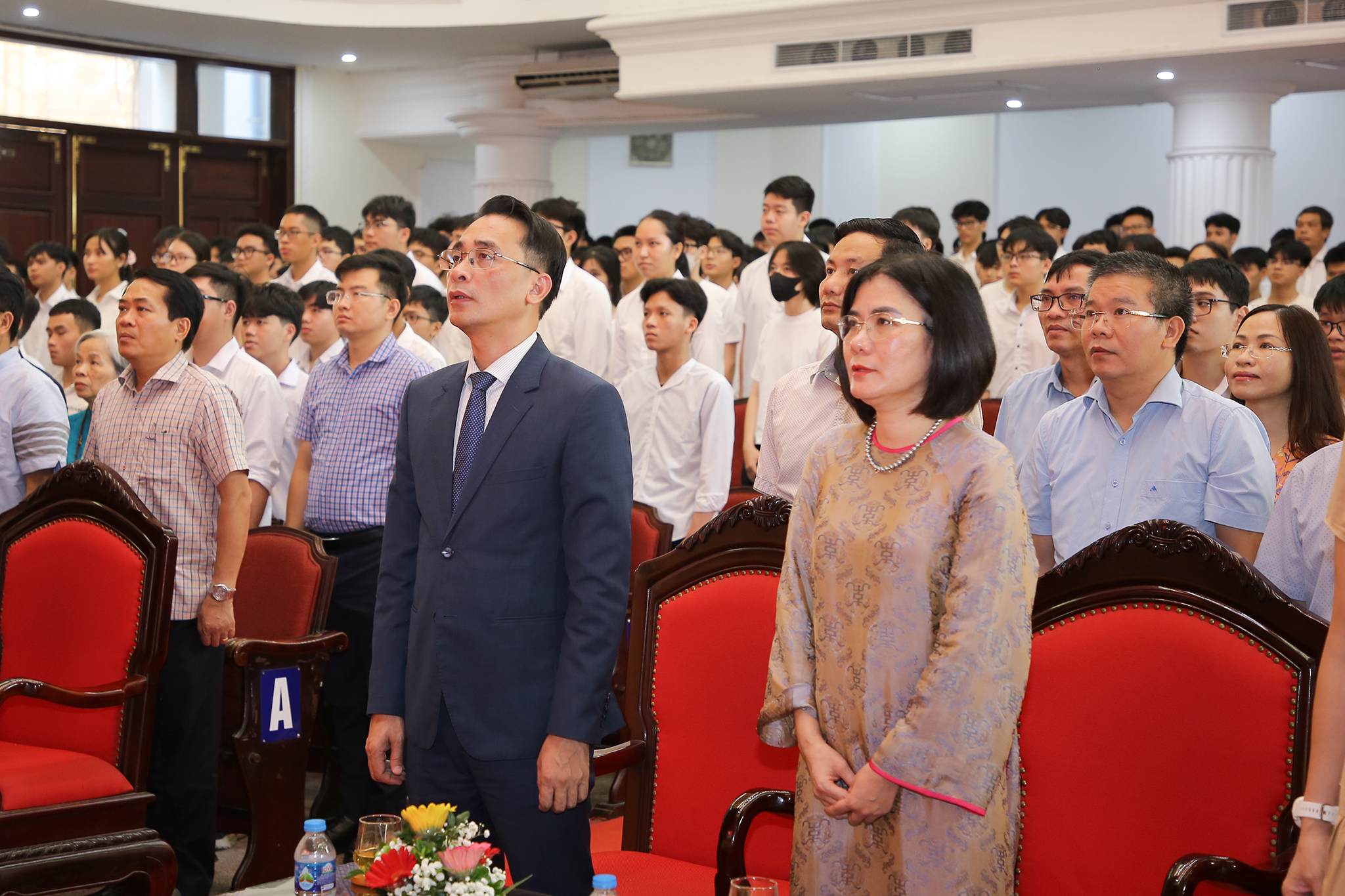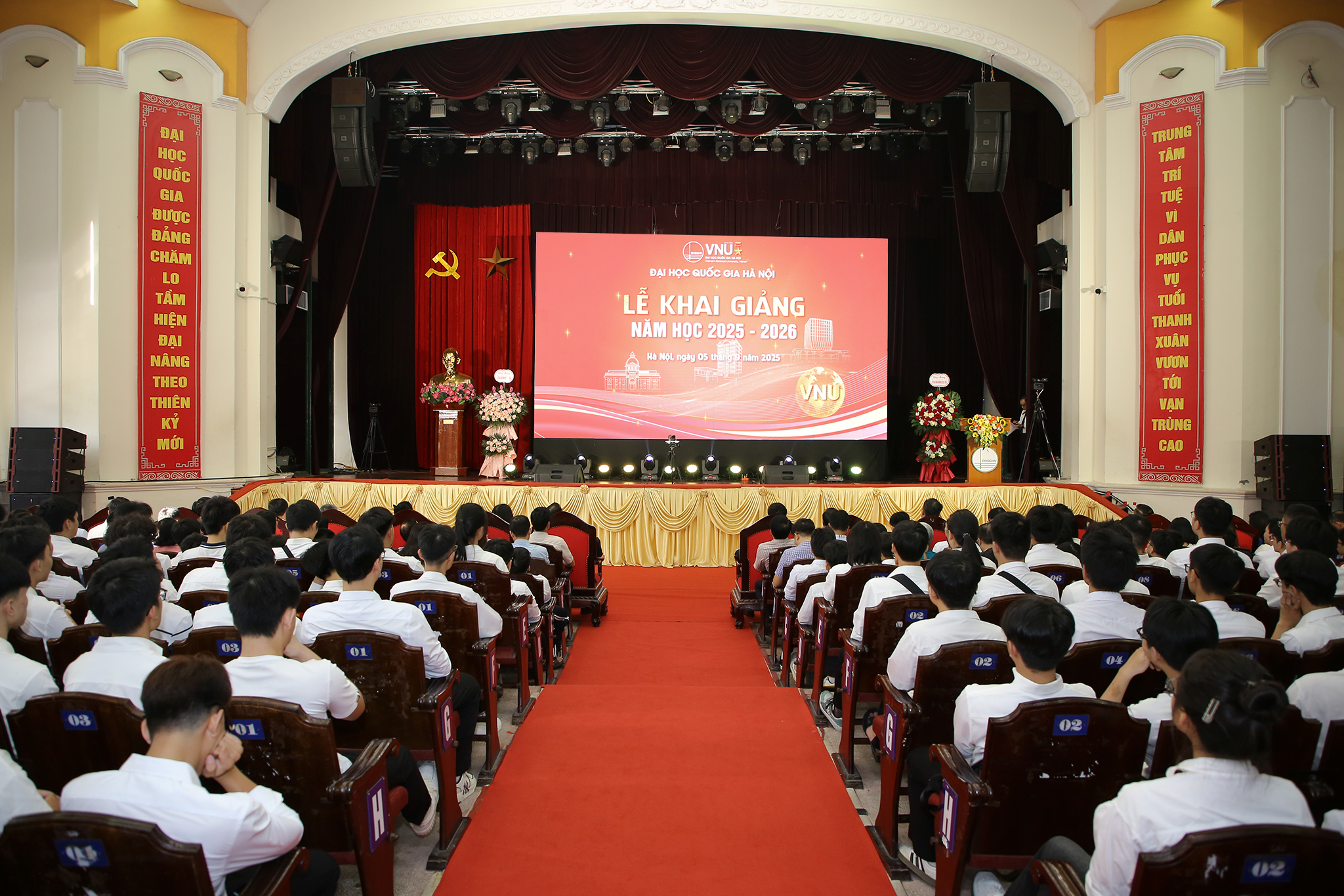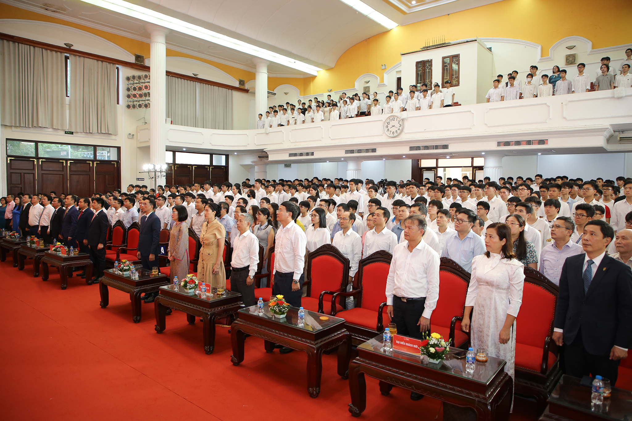 Đặc biệt, đây là lần đầu tiên trong lịch sử, toàn bộ học sinh, sinh viên cả nước cùng thực hiện nghi lễ chào cờ, hát Quốc ca cùng một thời điểm trong lễ khai giảng năm học mới. Tại điểm cầu Trường ĐH Công nghệ, gần 2000 tân sinh viên đại diện cho hơn 4000 sinh viên khóa QH-2025 và hơn 6000 sinh viên các khóa của Trường ĐH Công nghệ đã tham dự trực tiếp và trực tuyến trong không khí tự hào, xúc động.