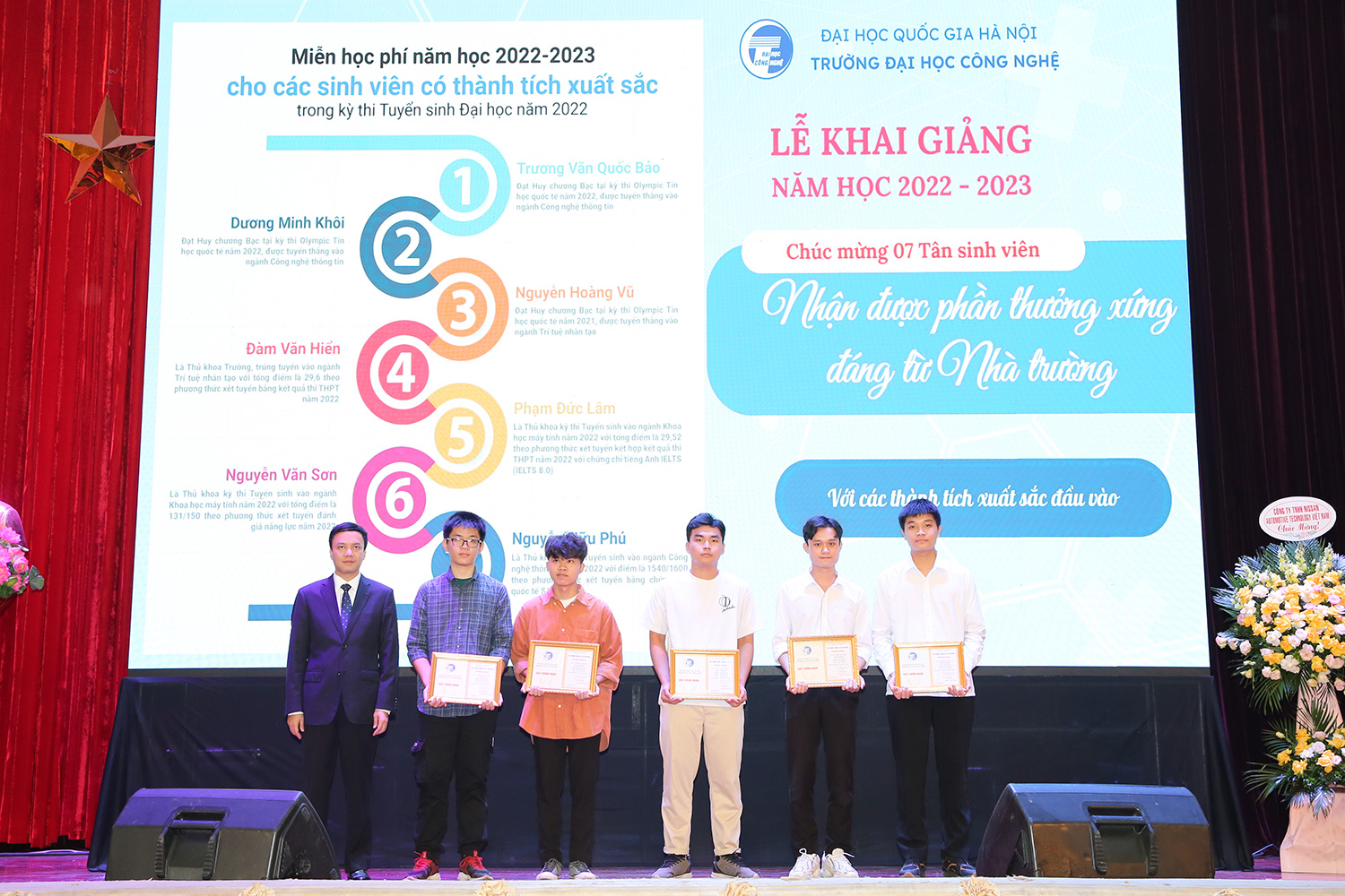 Với học bổng bằng hình thức miễn giảm học phí năm học 2022-2023 dành cho thủ khoa tuyển sinh và những sinh viên được tuyển thẳng trong kỳ tuyển sinh năm 2022 đã hỗ trợ và trở thành động lực cho nhiều tân sinh viên cố gắng học tập, học hỏi hơn nữa trong tương lai. Là 3 trong 7 sinh viên nhận học bổng, Nguyễn Hữu Phú, Phạm Đức Lâm và Đàm Văn Hiển đều bày tỏ sự vinh dự và lời cảm ơn tới Ban Giám hiệu Nhà trường khi được nhận học bổng. Sau 2 tuần hội nhập và học tập, với việc bắt nhịp được môi trường học tập và nghiên cứu, các bạn đều rất ấn tượng bởi sự thân thiện, nhiệt tình của các thầy/cô đối với sinh viên. Hiển khẳng định: “Được học tập tu dưỡng dưới dưới mái trường ĐH Công nghệ là mơ ước và niềm tự hào của chúng em. Đây là ngôi trường có truyền thống học thuật chất lượng cao. Nơi đây bản thân được bồi dưỡng chuyên môn và kỹ năng, lập thân, lập nghiệp, thỏa sức thực hiện hoài bão ước mơ của mình để sau này trở thành những nhân tài có đóng góp cho sự phát triển của đất nước”.