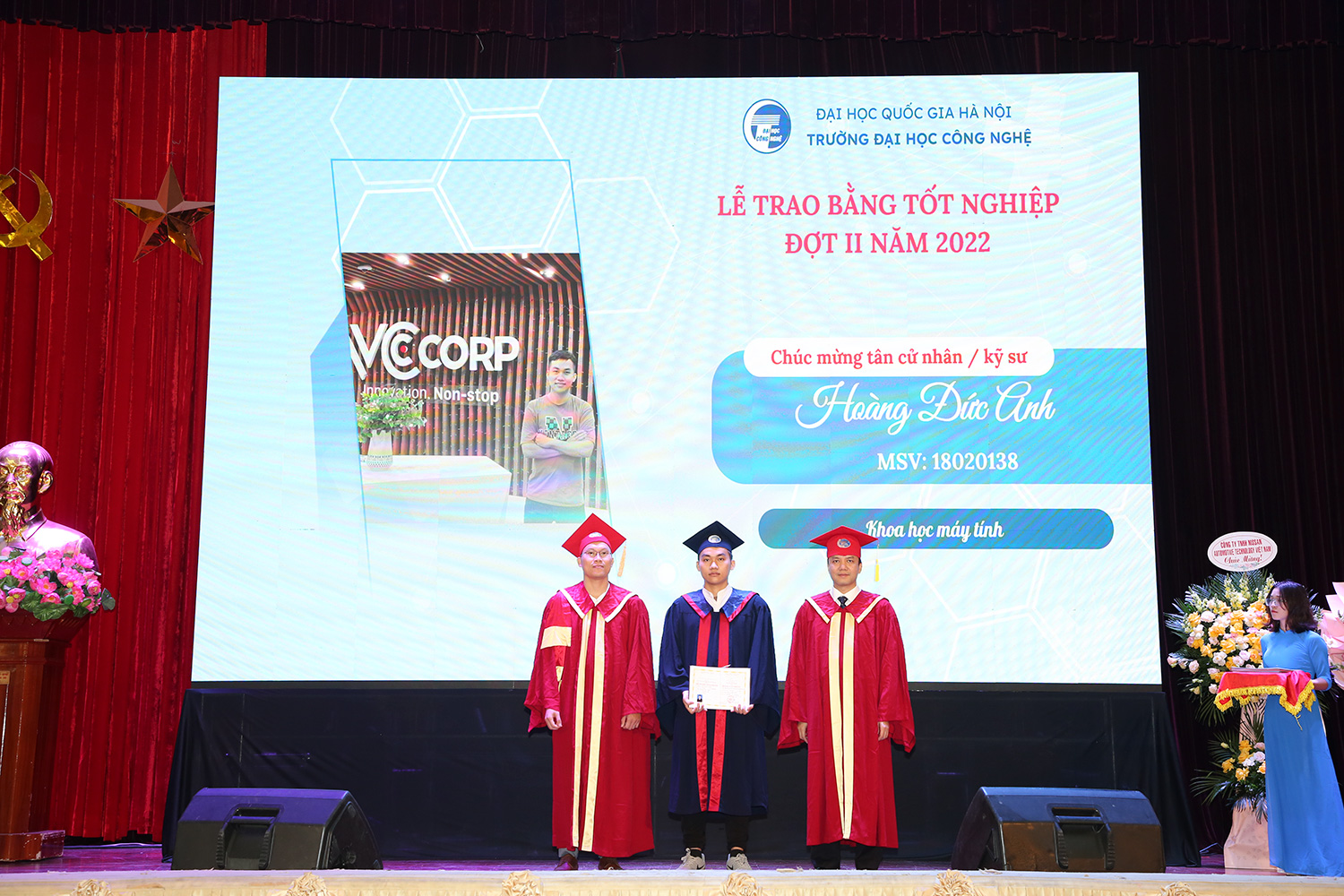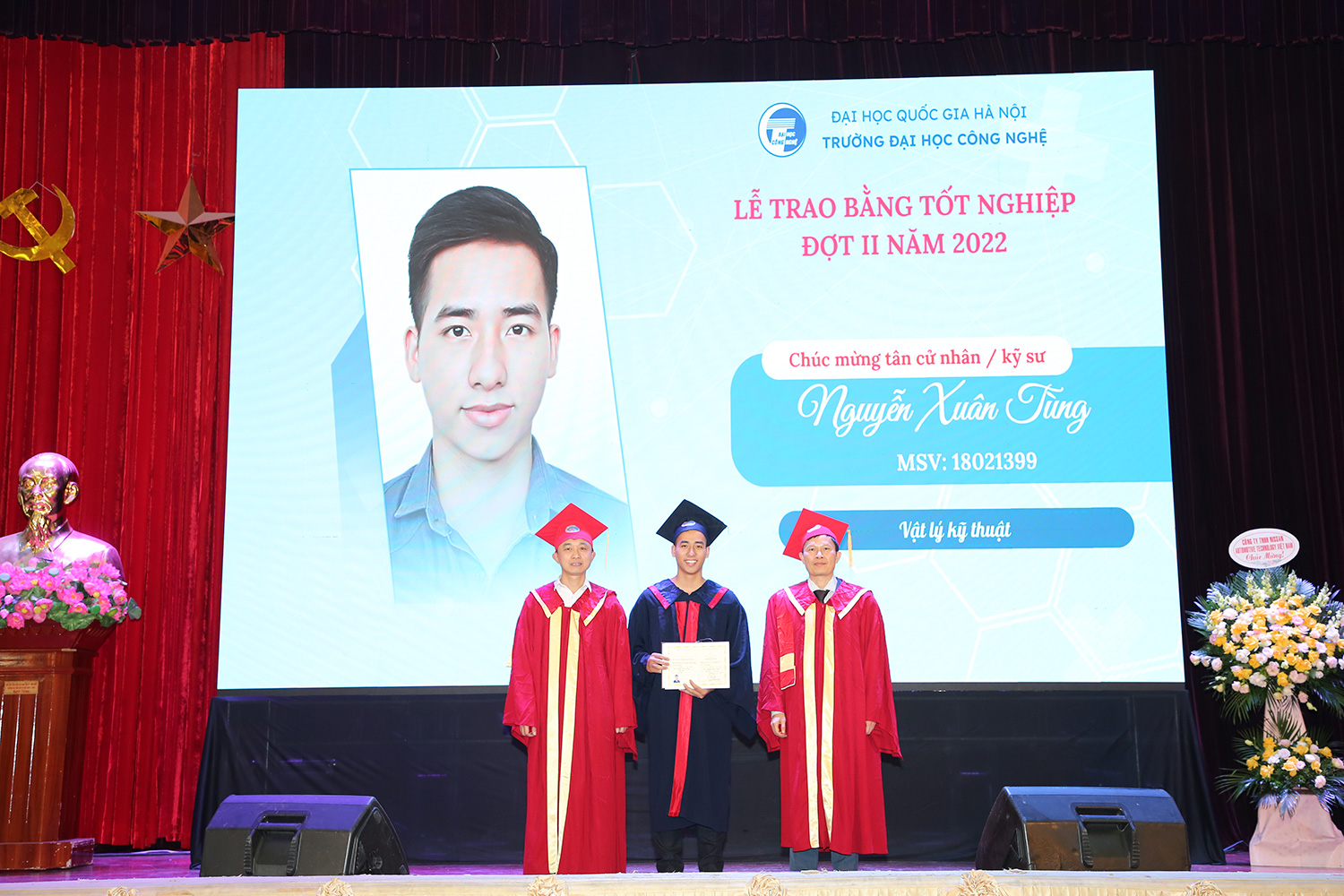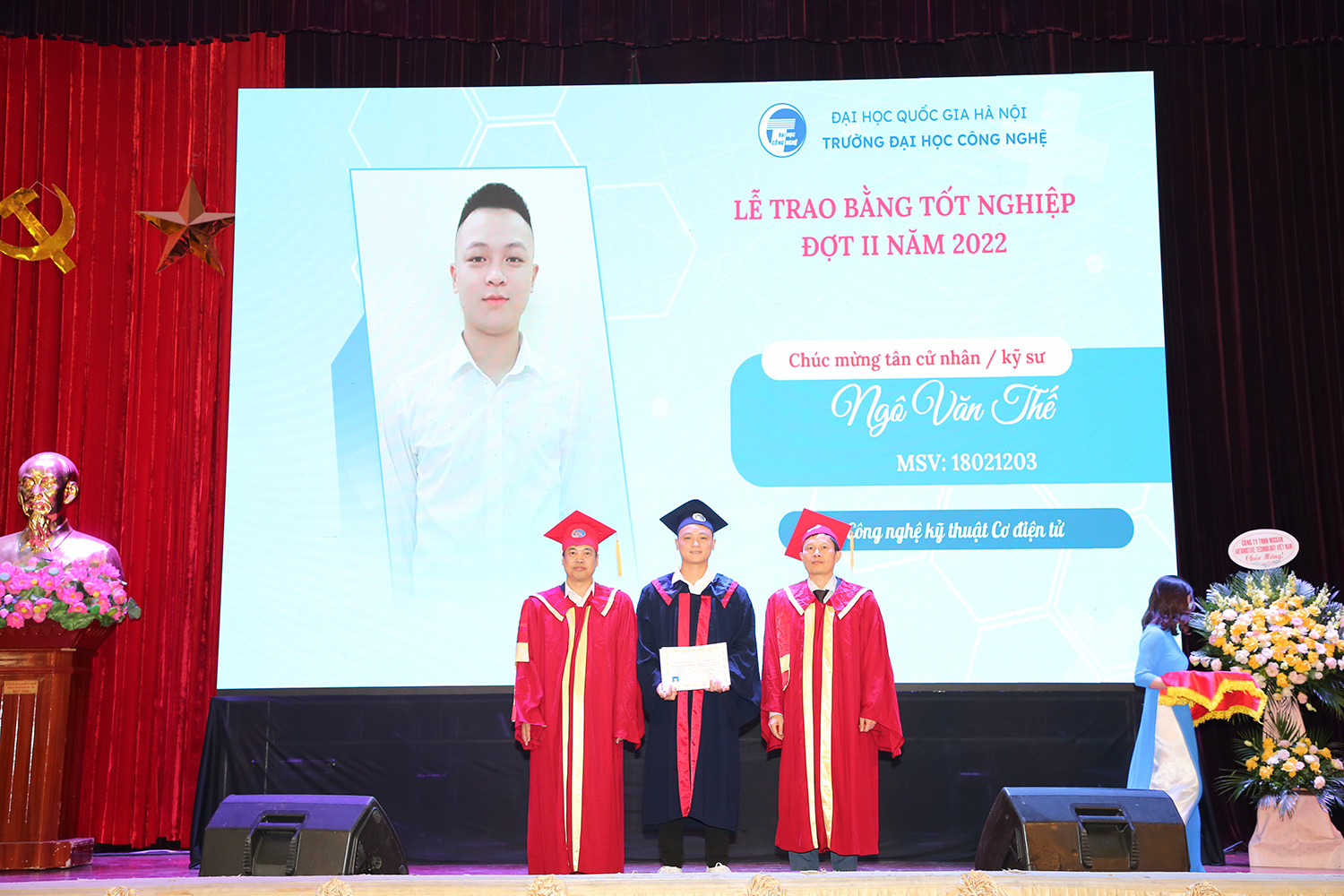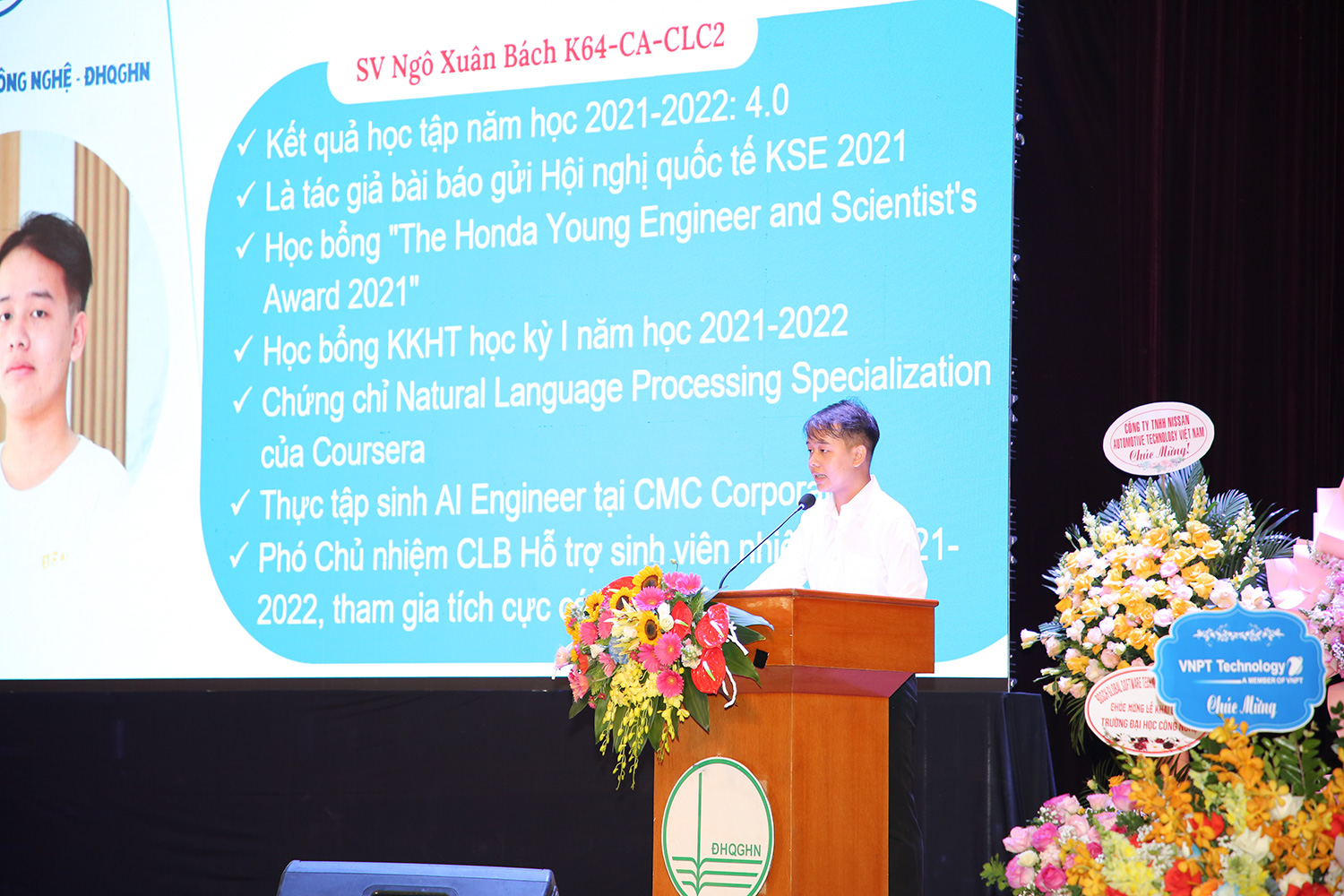 Thay mặt các sinh viên, sinh viên Ngô Xuân Bách (K64, ngành Khoa học máy tính) với điểm trung bình học tập năm học 2021-2022 đạt 4.0/4.0 đã gửi lời cảm ơn đến các thầy/cô dạy dỗ trong suốt thời gian qua và nhấn mạnh: “Em vẫn không quên cảm xúc lần đầu tiên đặt chân đến ngôi trường này, vừa bỡ ngỡ, vừa tự hào, xen chút kiêu hãnh vì đã thực sự trở thành một thành viên của UET. Đó là mơ ước mà em đã ấp ủ trong suốt quãng đời học sinh của mình, và đến hôm nay sau ba năm rèn luyện học tập dưới mái trường ĐH Công nghệ, em tự nhận thấy rằng mình đã chọn con đường đúng đắn, tuổi trẻ của mình không có gì hối tiếc khi đã là sinh viên của ngôi trường danh giá và có chất lượng giảng dạy hàng đầu của Việt Nam và trên trường quốc tế. Từ mái trường này, biết bao nhân tài với đầy đủ phẩm chất đạo đức và kỹ năng nghề nghiệp đã tốt nghiệp để phục vụ cho xã hội, cho đất nước”.