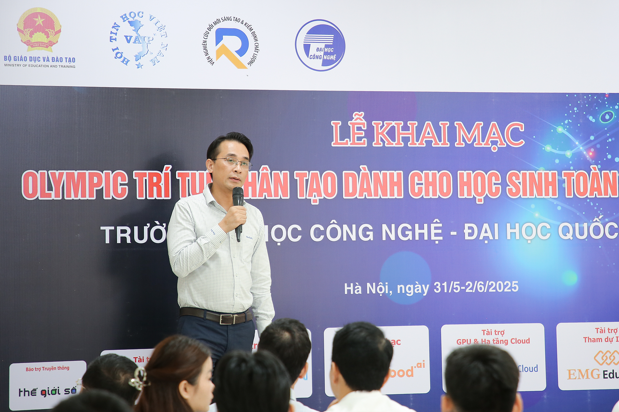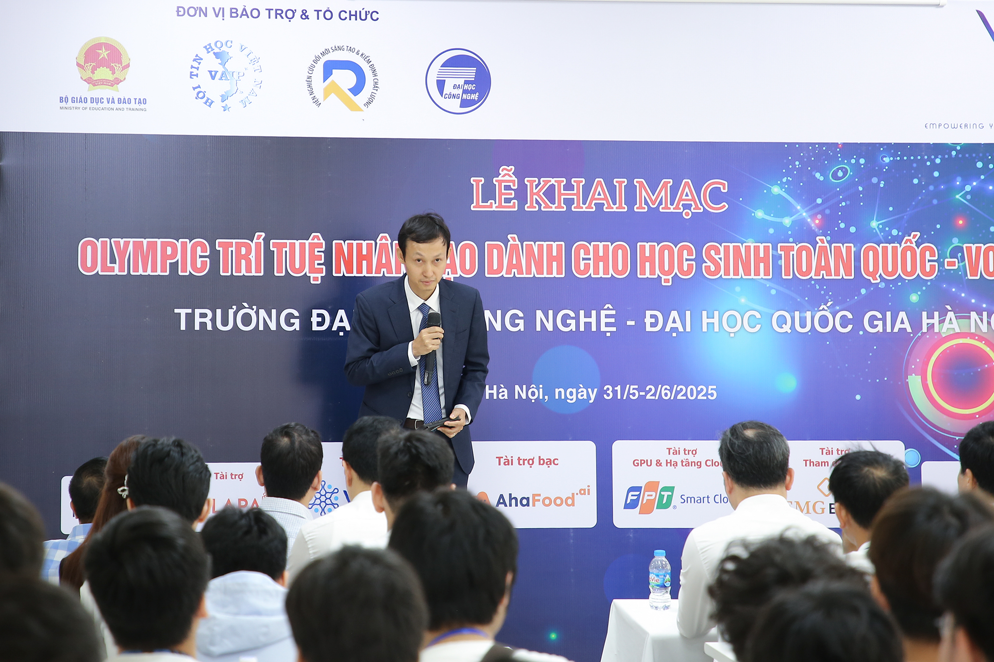 Phát biểu tại lễ khai mạc, GS.TS Nguyễn Ngọc Hà – Phó Cục trưởng Cục Quản lý chất lượng, Bộ Giáo dục và Đào tạo chia sẻ về tầm quan trọng của AI trong bối cảnh chuyển đổi số quốc gia và sự quan tâm của Bộ Giáo dục và Đào tạo trong việc đẩy mạnh dạy và học AI trong các chương trình đào tạo. Bên cạnh nhiệm vụ phát hiện và bồi dưỡng tài năng trẻ, Phó Cục trưởng cho biết AI sẽ không chỉ dừng lại ở lĩnh vực nghiên cứu hay ứng dụng kỹ thuật, mà sẽ trở thành một trụ cột quan trọng thúc đẩy các ngành kinh tế, xã hội của Việt Nam trong tương lai.