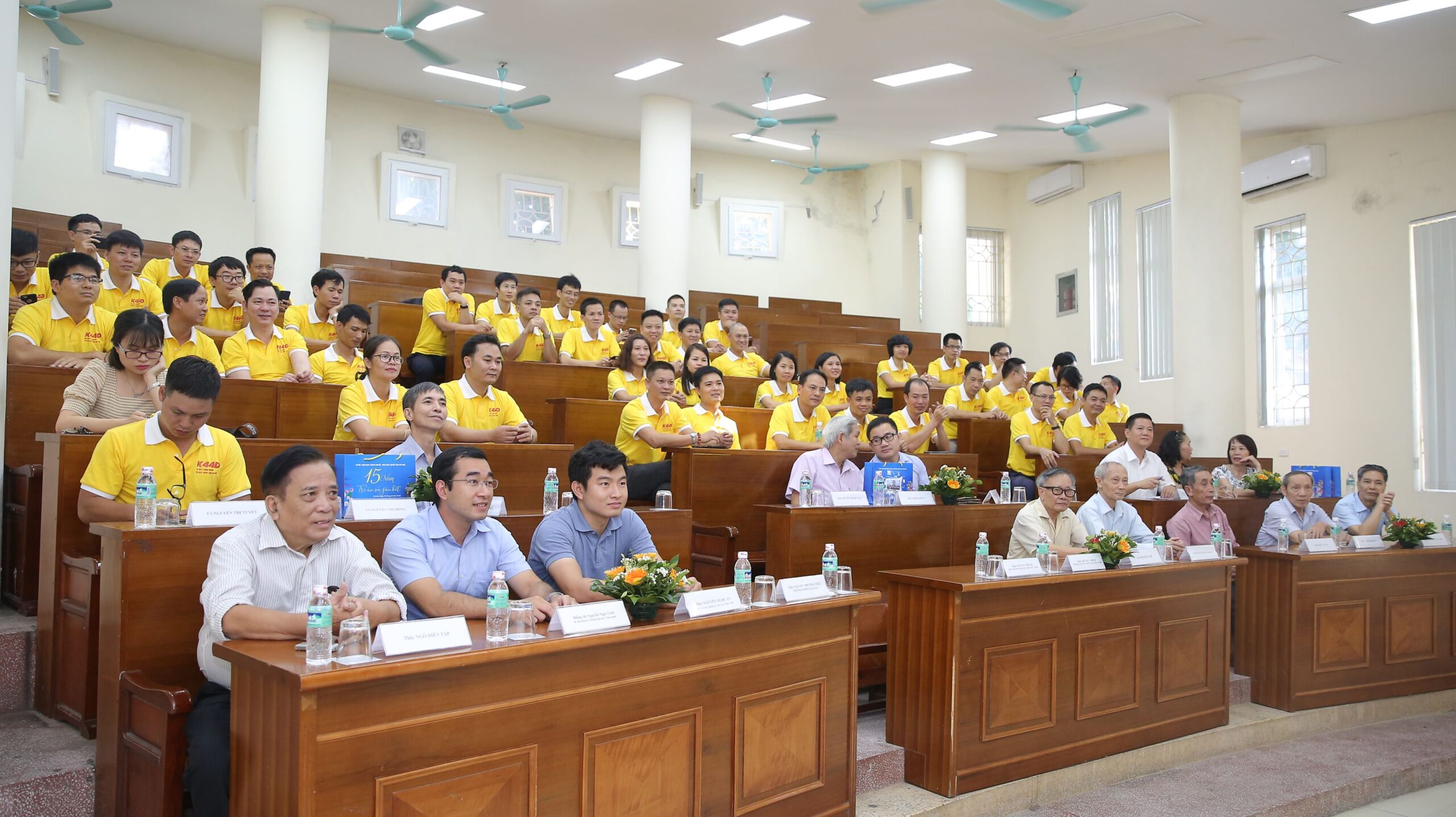 Tập thể cựu sinh viên chụp ảnh lưu niệm với thầy cô giáo tại Hội trường 3-G3
