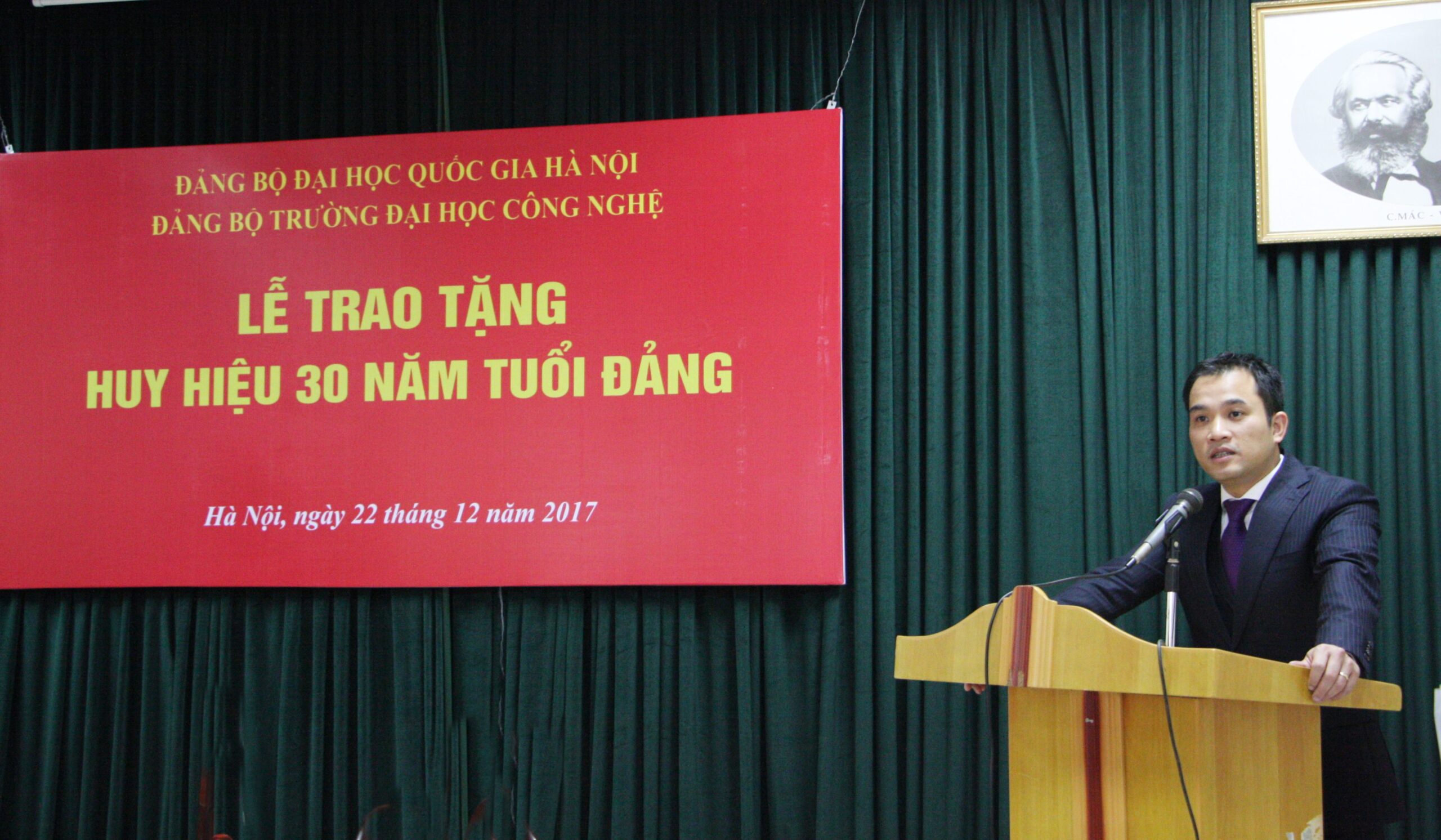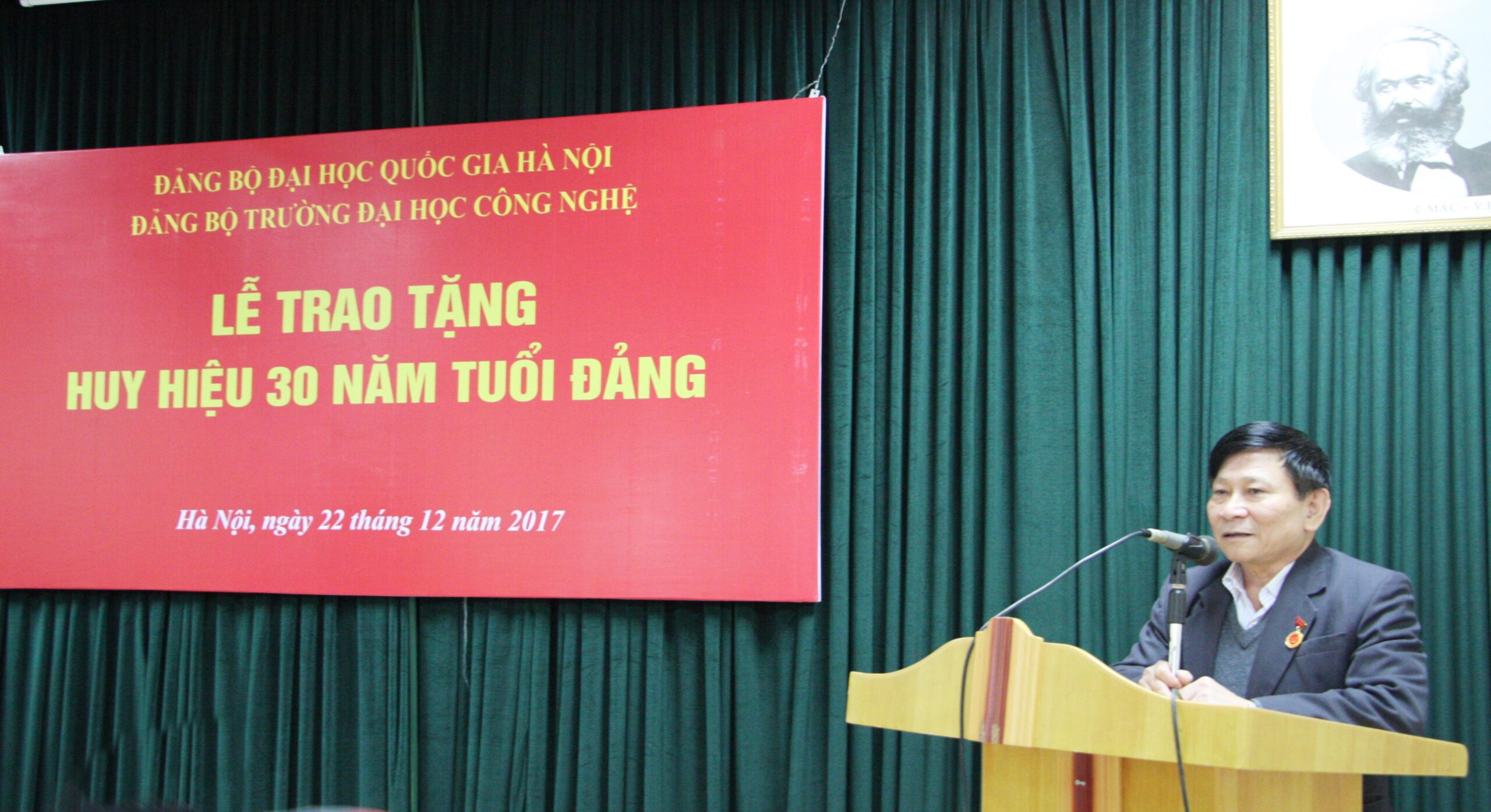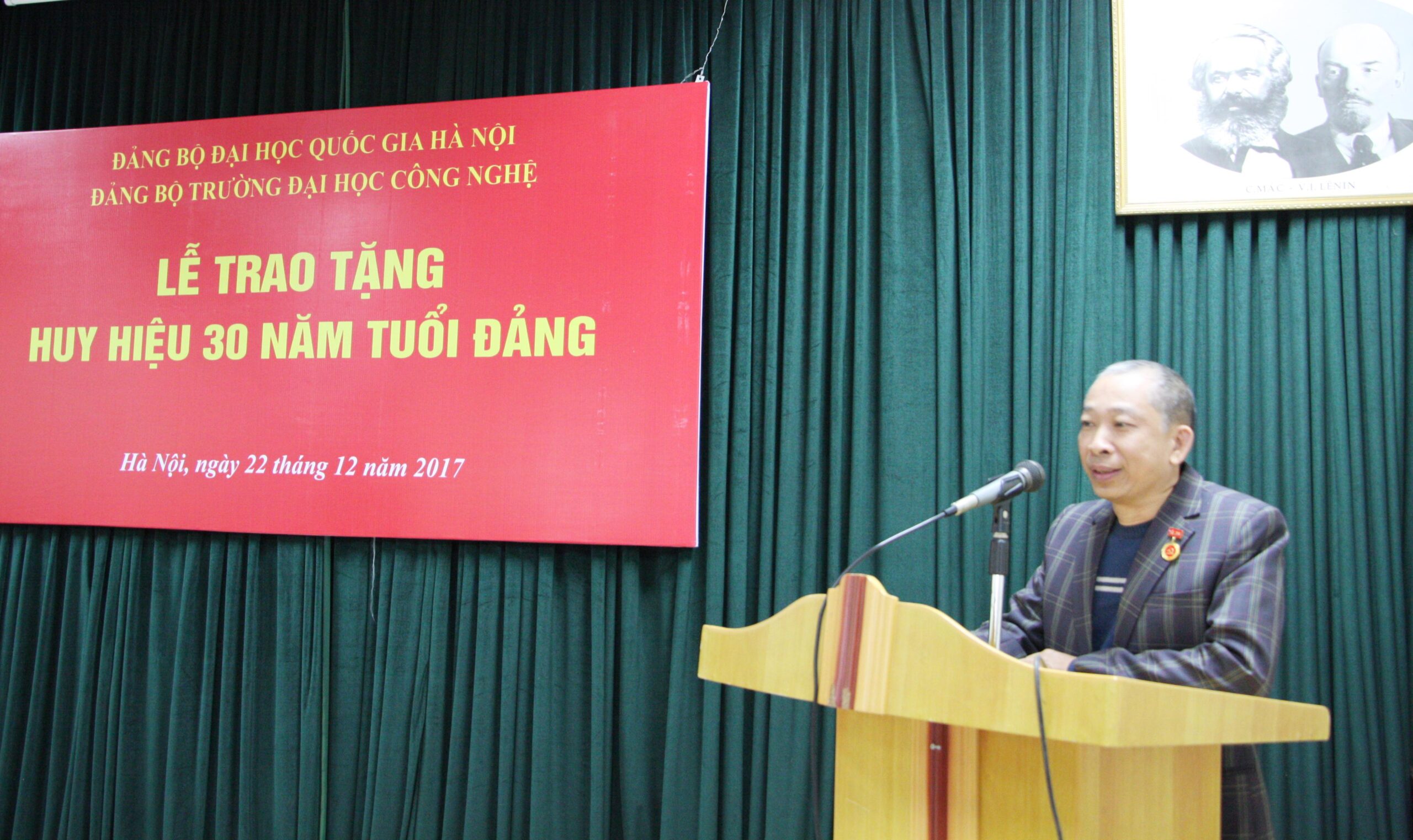 Tại buổi lễ, đồng chí Phạm Bảo Sơn đã trao tặng huy hiệu, tặng hoa và phát biểu chúc mừng đồng chí Bạch Gia Dương thuộc Chi bộ Điện tử viễn thông và đồng chí Trần Mậu Danh thuộc Chi bộ Hiệu bộ 1 được tặng Huy hiệu 30 năm tuổi Đảng; đồng thời đánh giá cao những đóng góp của các đồng chí cho sự phát triển của Trường. Đây là niềm vinh dự của cá nhân các đồng chí đảng viên, và cũng là niềm tự hào đối với tập thể Chi bộ Điện tử viễn thông, Chi bộ Hiệu bộ 1 và tập thể Đảng bộ Trường ĐHCN nói chung đã có các đồng chí đảng viên ưu tú nhiều năm đóng góp cho sự phát triển Trường. Đồng chí Bí thư Đảng uỷ hy vọng và tin tưởng các đồng chí đảng viên sẽ tiếp tục cống hiến hết mình cho sự nghiệp của Đảng trên từng vị trí công tác của mình, góp phần đưa Đảng bộ Nhà trường ngày càng vững mạnh.