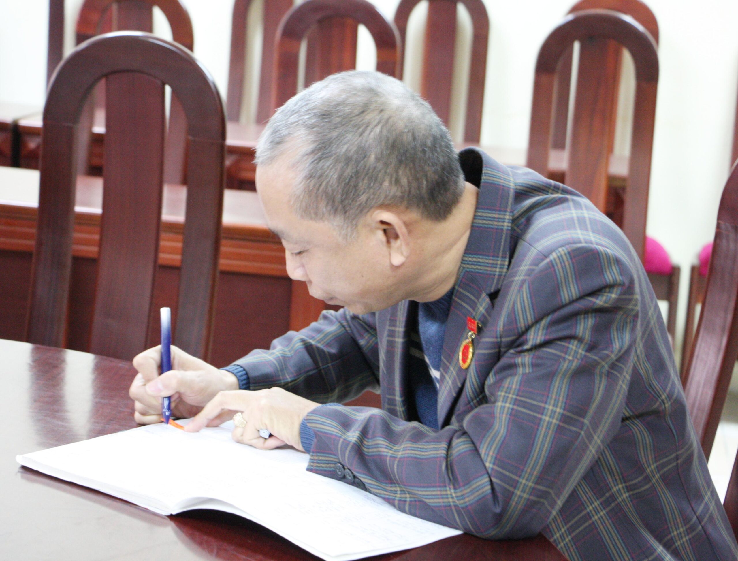 Đồng chí Bạch Gia Dương ký nhận Huy hiệu 30 năm tuổi Đảng và phát biểu cảm ơn Đảng ủy, Ban giám hiệu Nhà trường